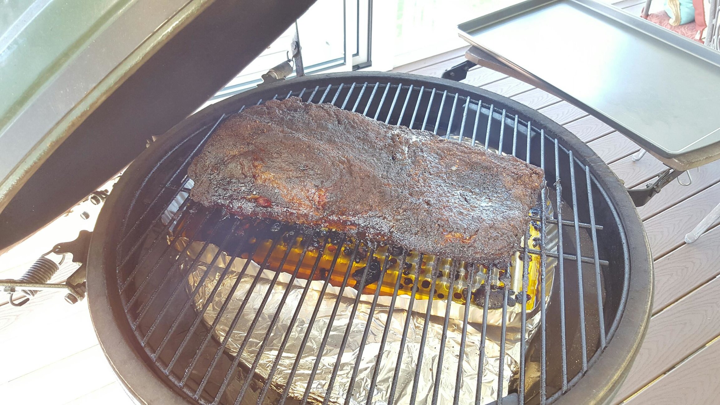 We were having a going away lunch for one of our contractors and I was asked to bring a brisket. It was a 15 pound choice packer, prepared with Dizzy Pig coarse grind Dizzy Dust. Smoked at 225 degrees with a few chunks of cherry wood mixed in with the Rockwood charcoal. It took a little over 22 hours to get to "like butter" consistency. Went fast with lots of compliments. Two XL BGEs - So Happy!!!!