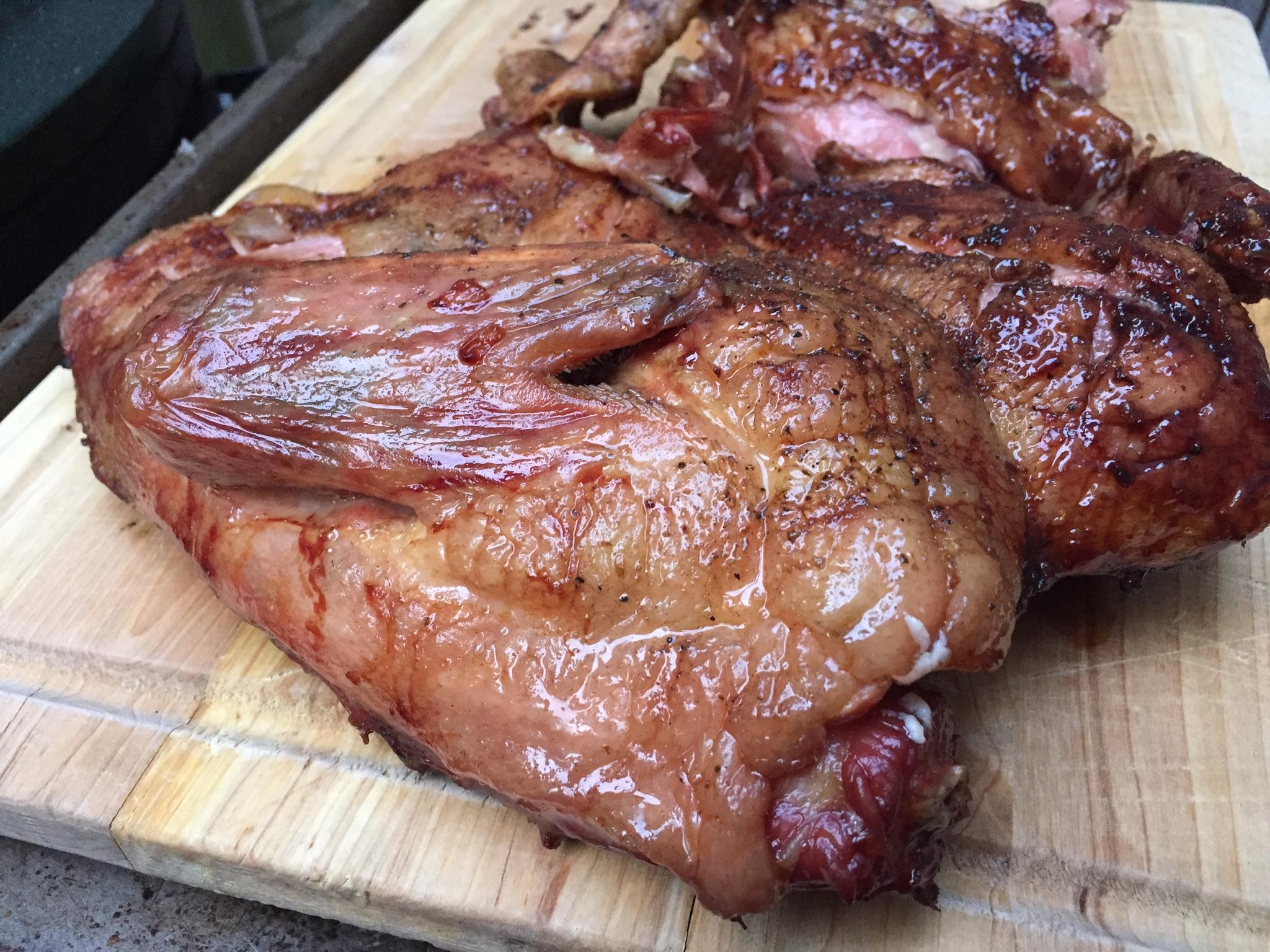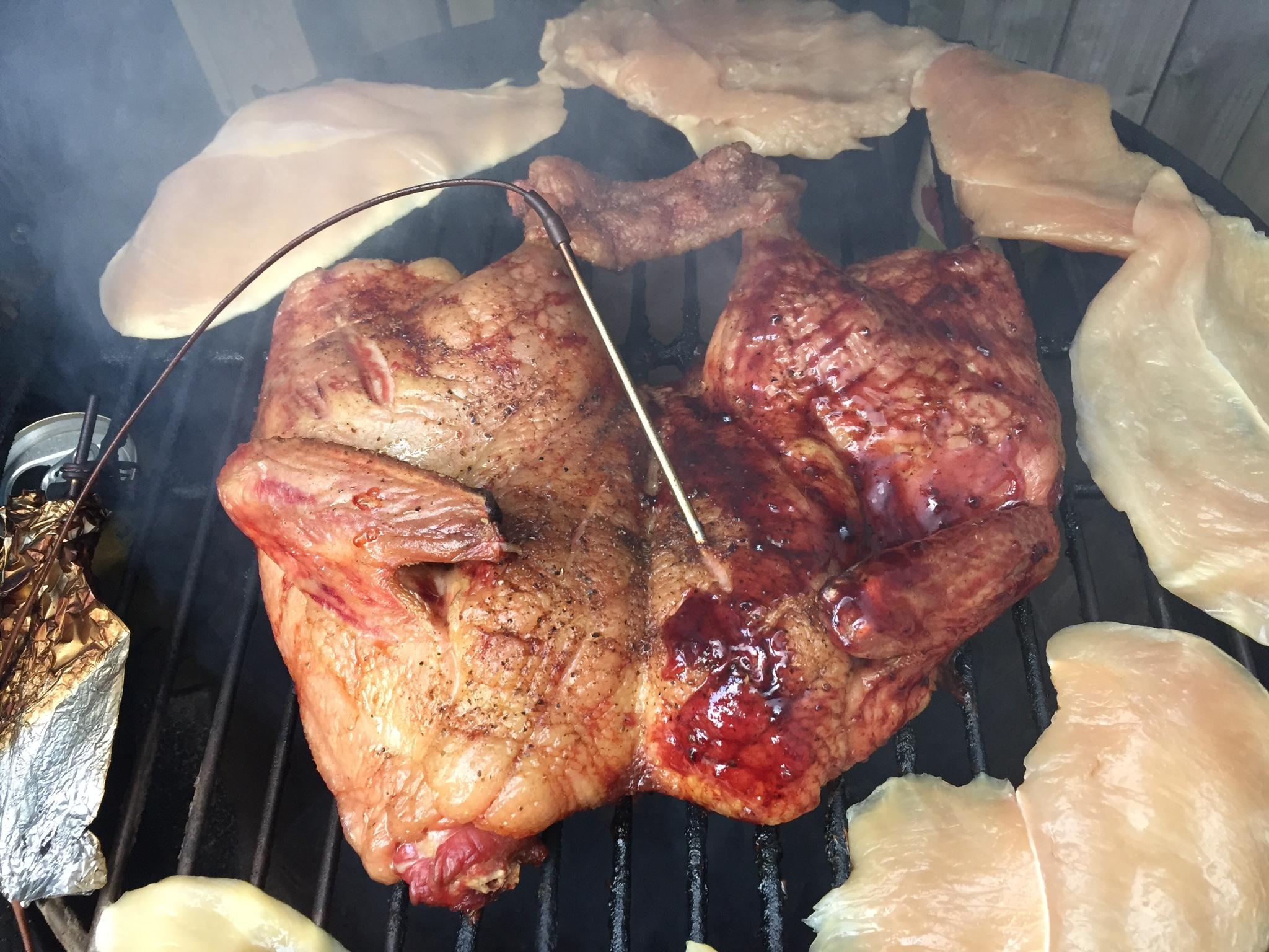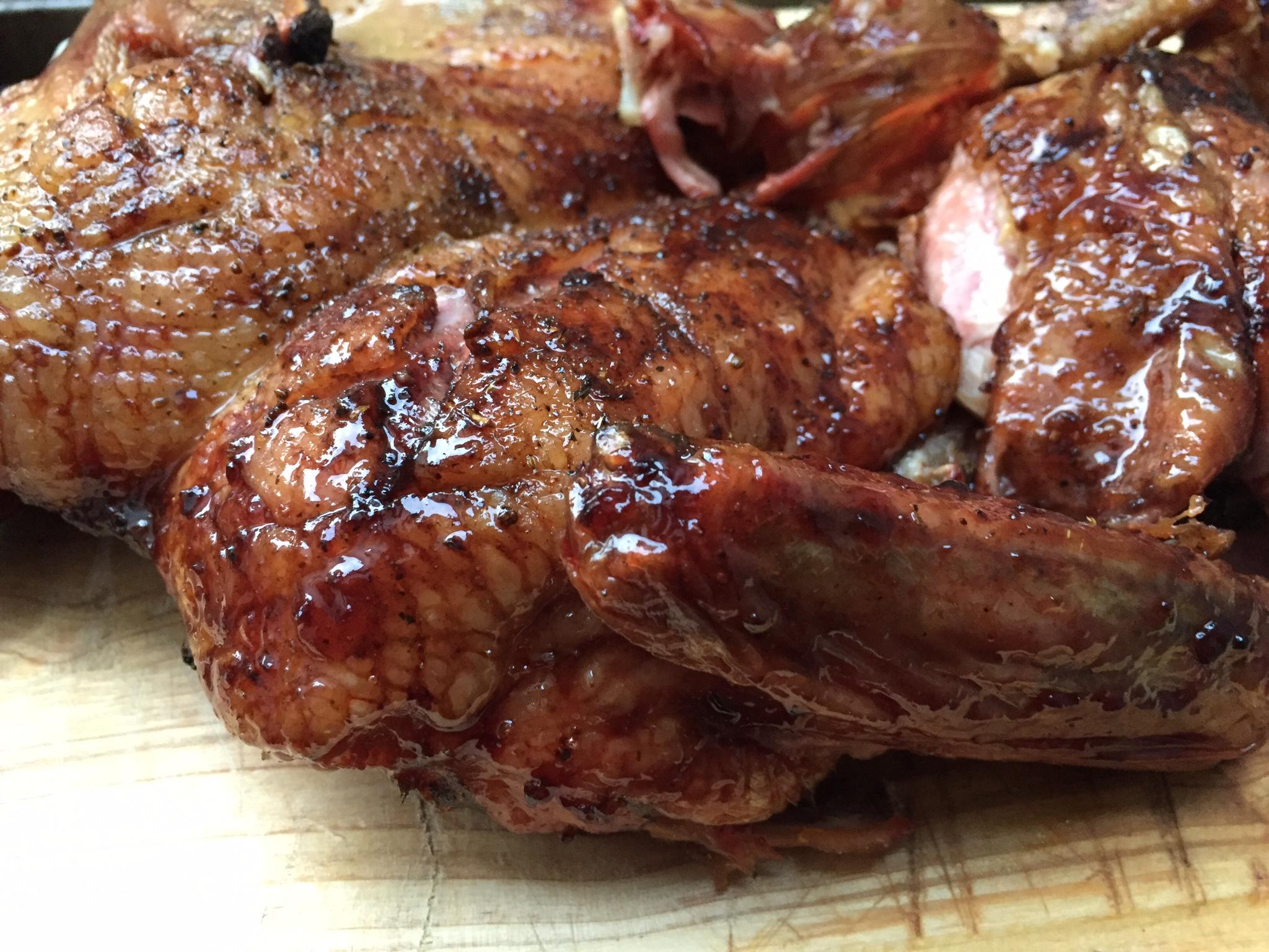 Got my follow up pics. Thanks for all the suggestions! Did raised direct spatchcock at 220 grid for about 6 hours. Maybe shoulda gone hotter. It was wicked tasty and crispy in spots but not the whole bird. In the pics you'll see half glazed with Loco Cowpoke Jalapeño Blackberry jam I heated and put on her. Man! Hit the spot. So...
