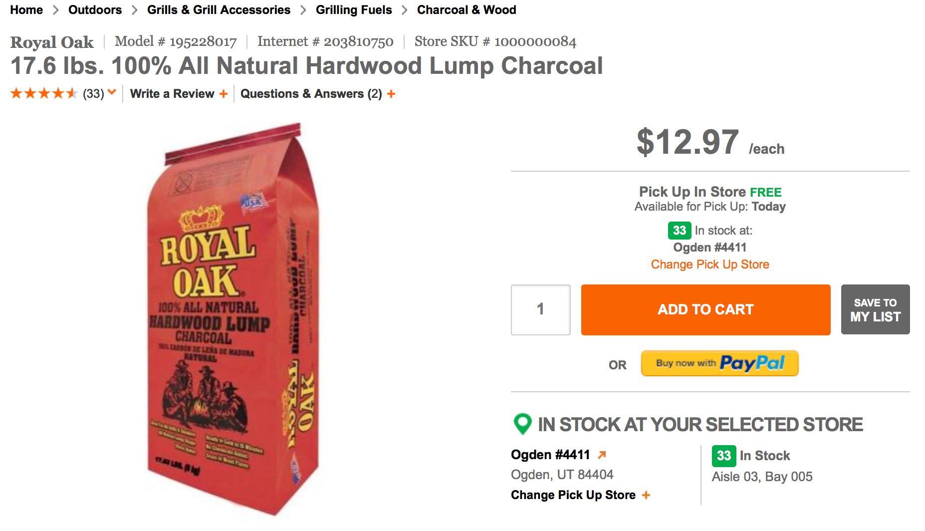 • I have 3 bags of Royal Oak small bags and the local Wally World and Tractor Supply are out of it because grilling season is over here in the NC Mountains!!!!! I will have to get some Cowboy at Lowe's soon.