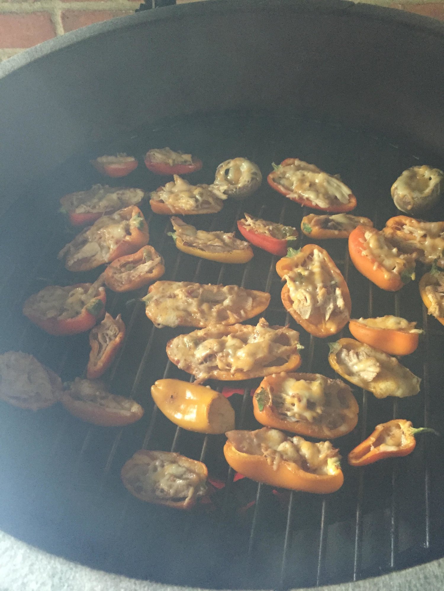 Mini sweet pepper chicken nachos. Used some left over chicken, shredded cheese, jalapeños, and a little whirly bird. 350 direct for about 10 minutes... Delicious! Dyersburg, TN