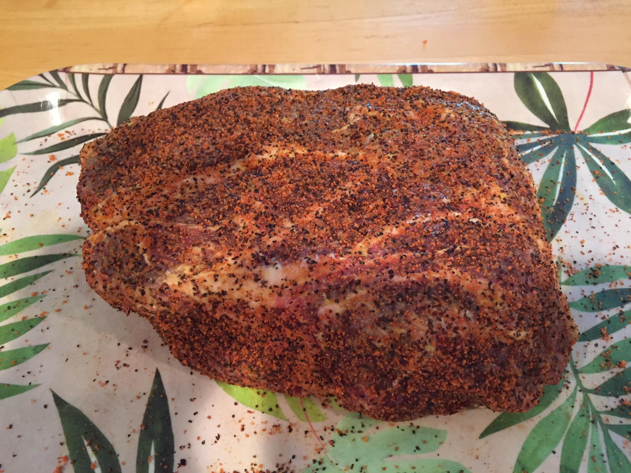 went on at about 11:30am coated with yellow mustard and Meat Church Holy Cow Rub.