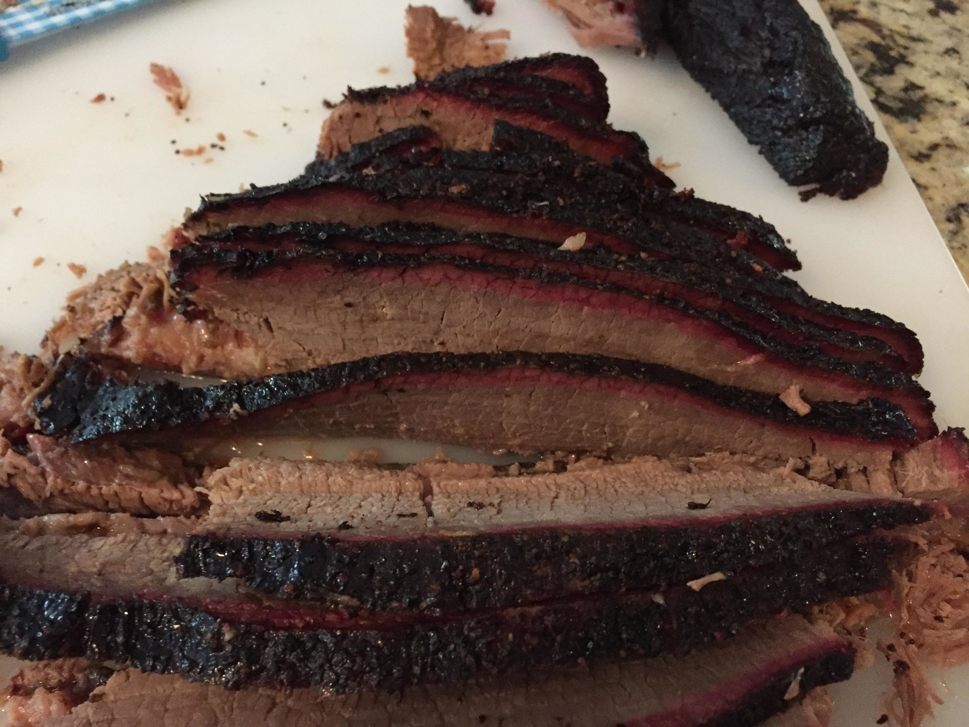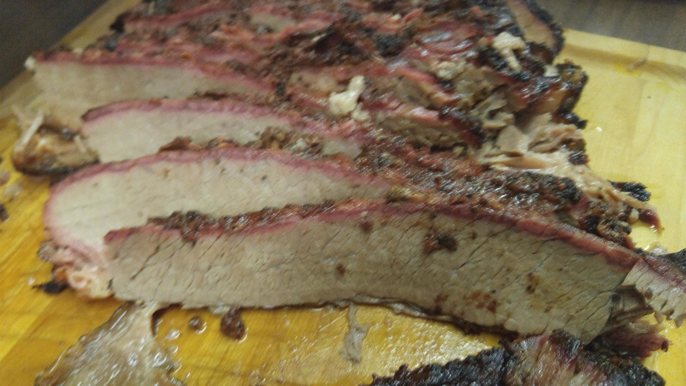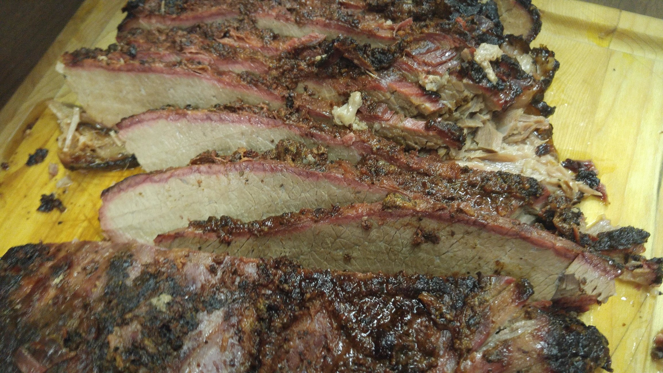 I think I did ok for my first try, it was fairly moist and very tender in the flat. I haven't cut the point as the flat yielded enough for the crowd. Had a pretty nice smoke ring also.