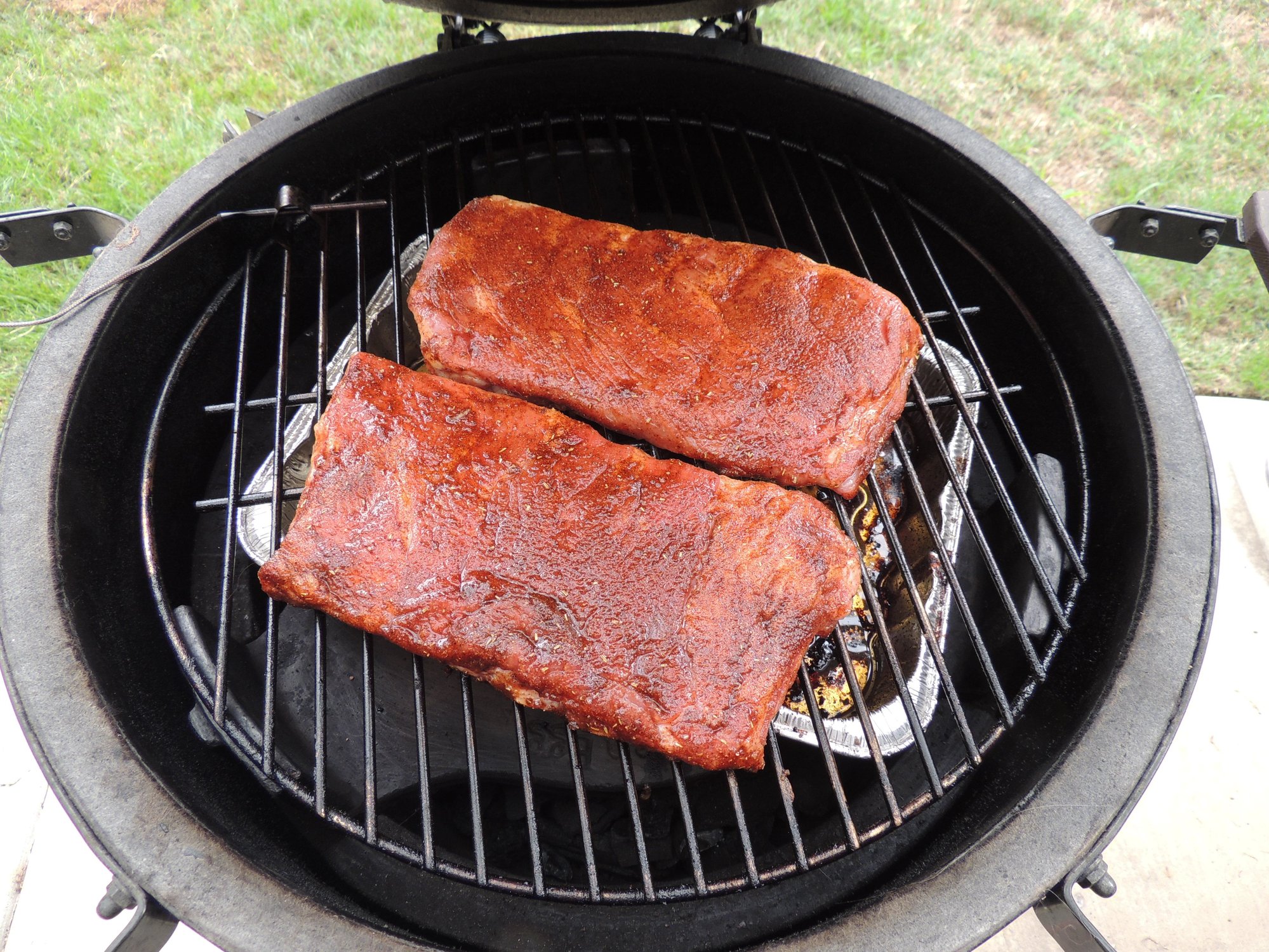 Initially i use coarse grain salt and let set for an hour or so then I use my own dry rub, but you can use any that pleases you. Then I spread peach preserves on them. I place on the big green egg at 225 and smoke with peach wood.