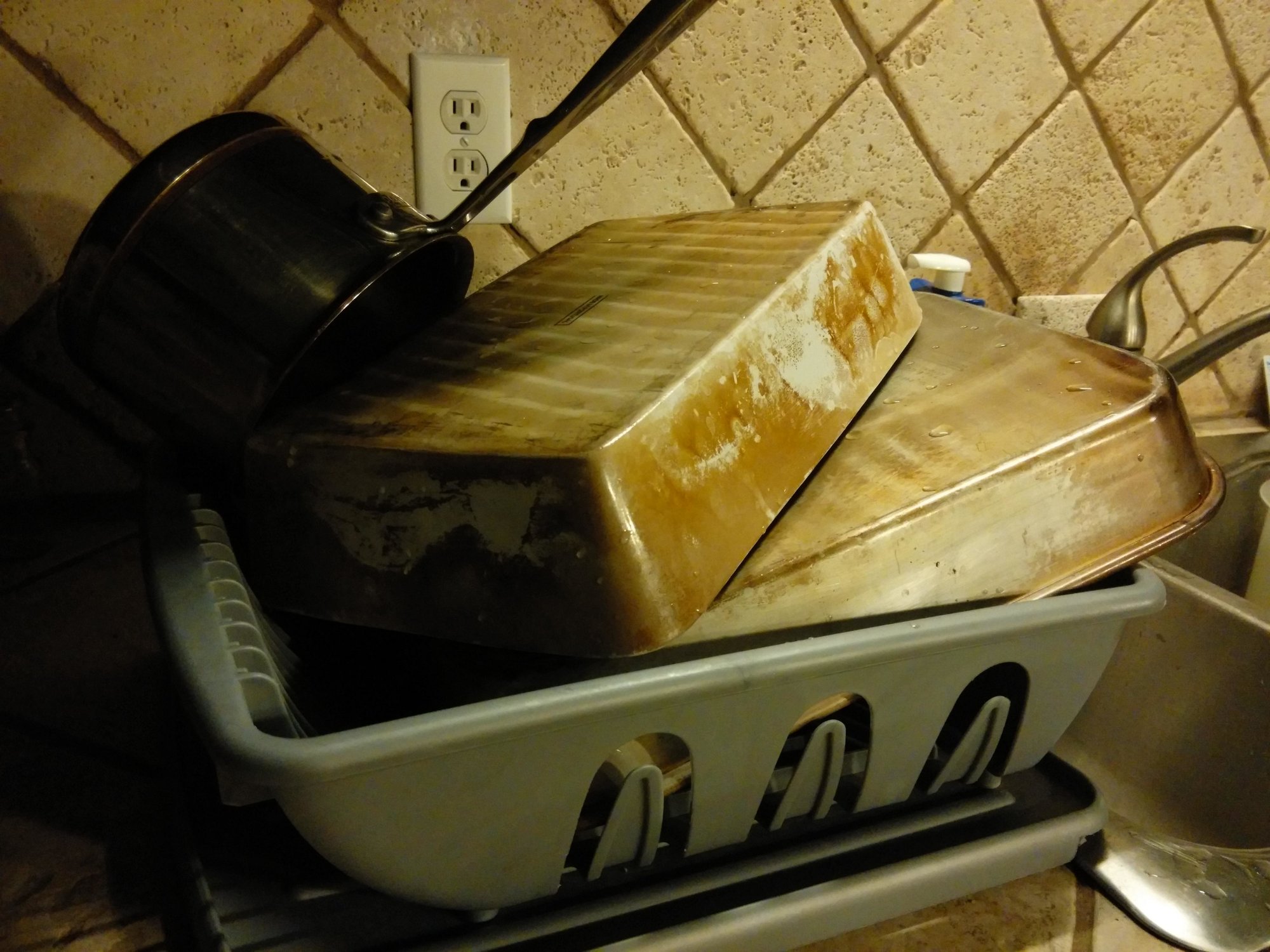 I used the wife's good casserole dish to make some mac & cheese (http://www.myrecipes.com/recipe/king-ranch-chicken-mac-cheese)  Problem is, it got all smoked up in the egg and is now a *&^% to clean.  Any suggestions?