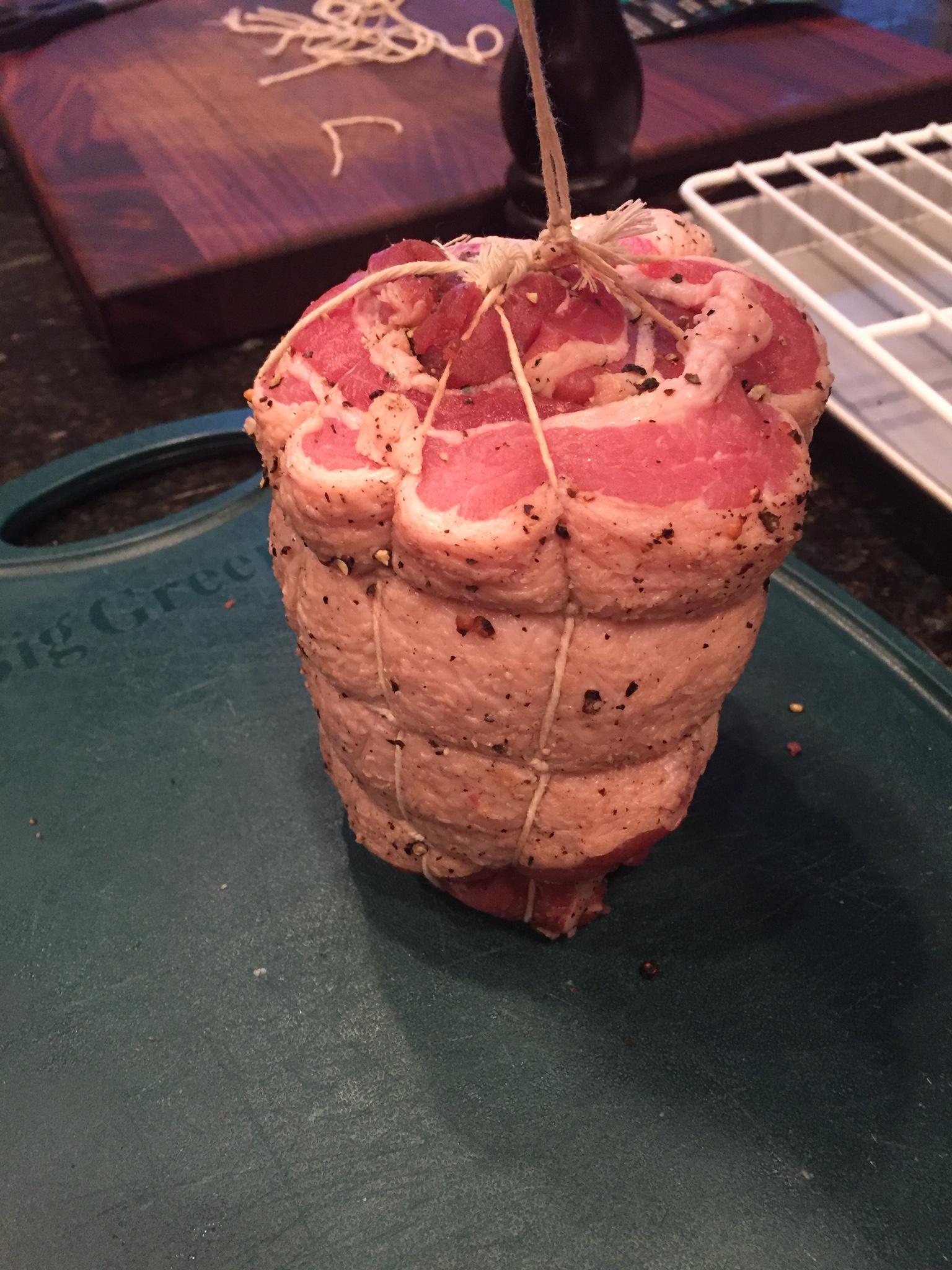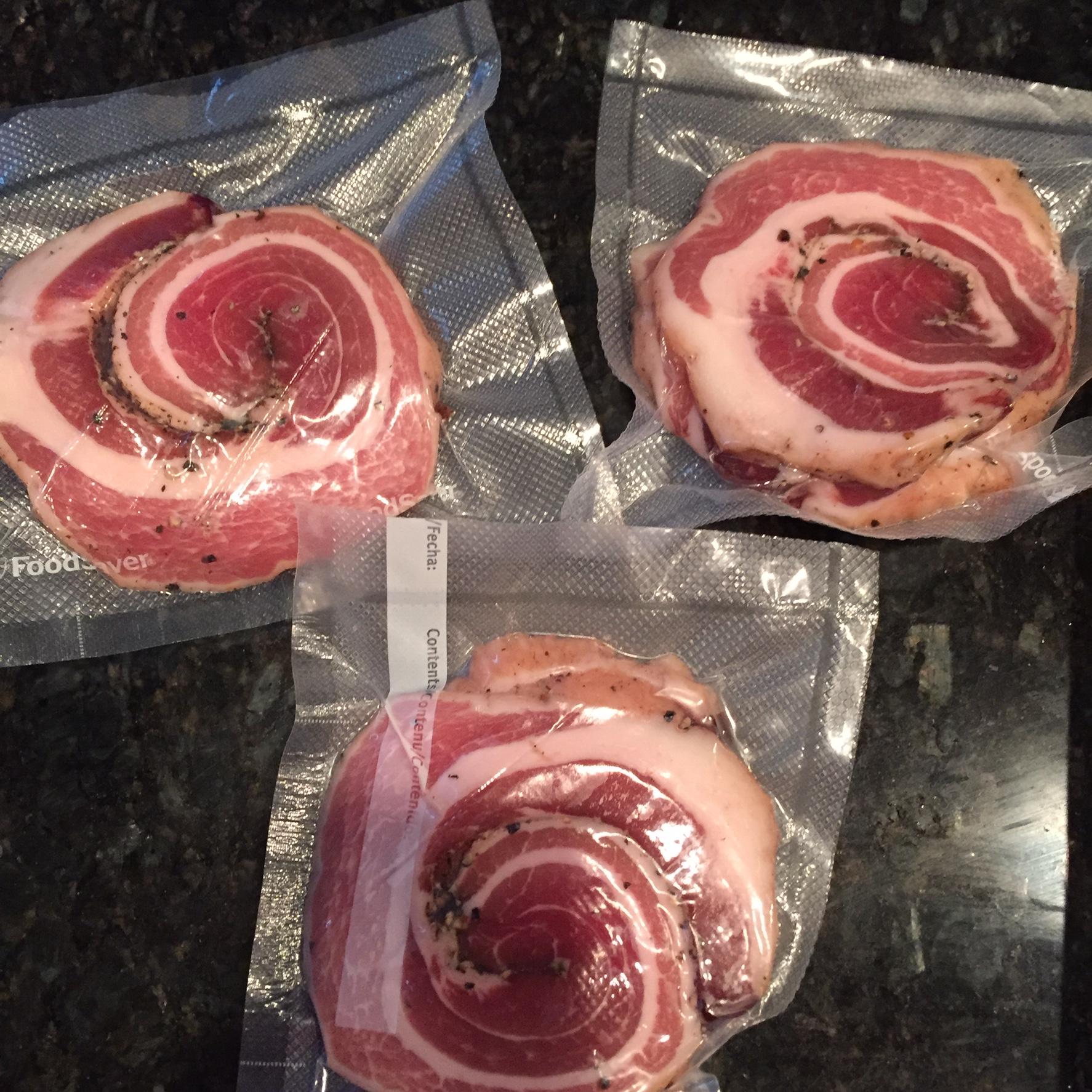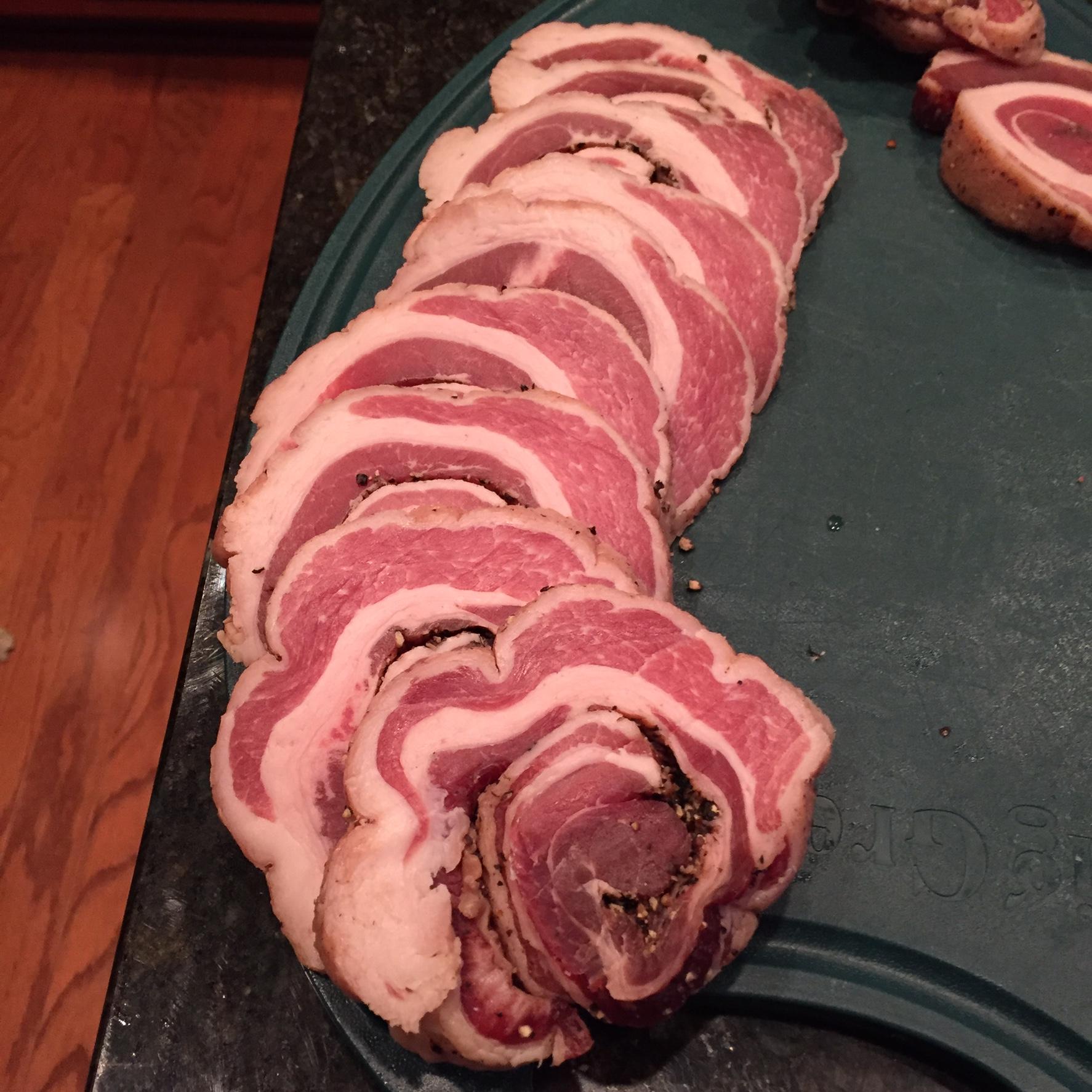 set aside part of the belly I made bacon out of a few weeks ago to give pancetta a try.  3 weeks later, here is the result.  I think it came out pretty stellar.