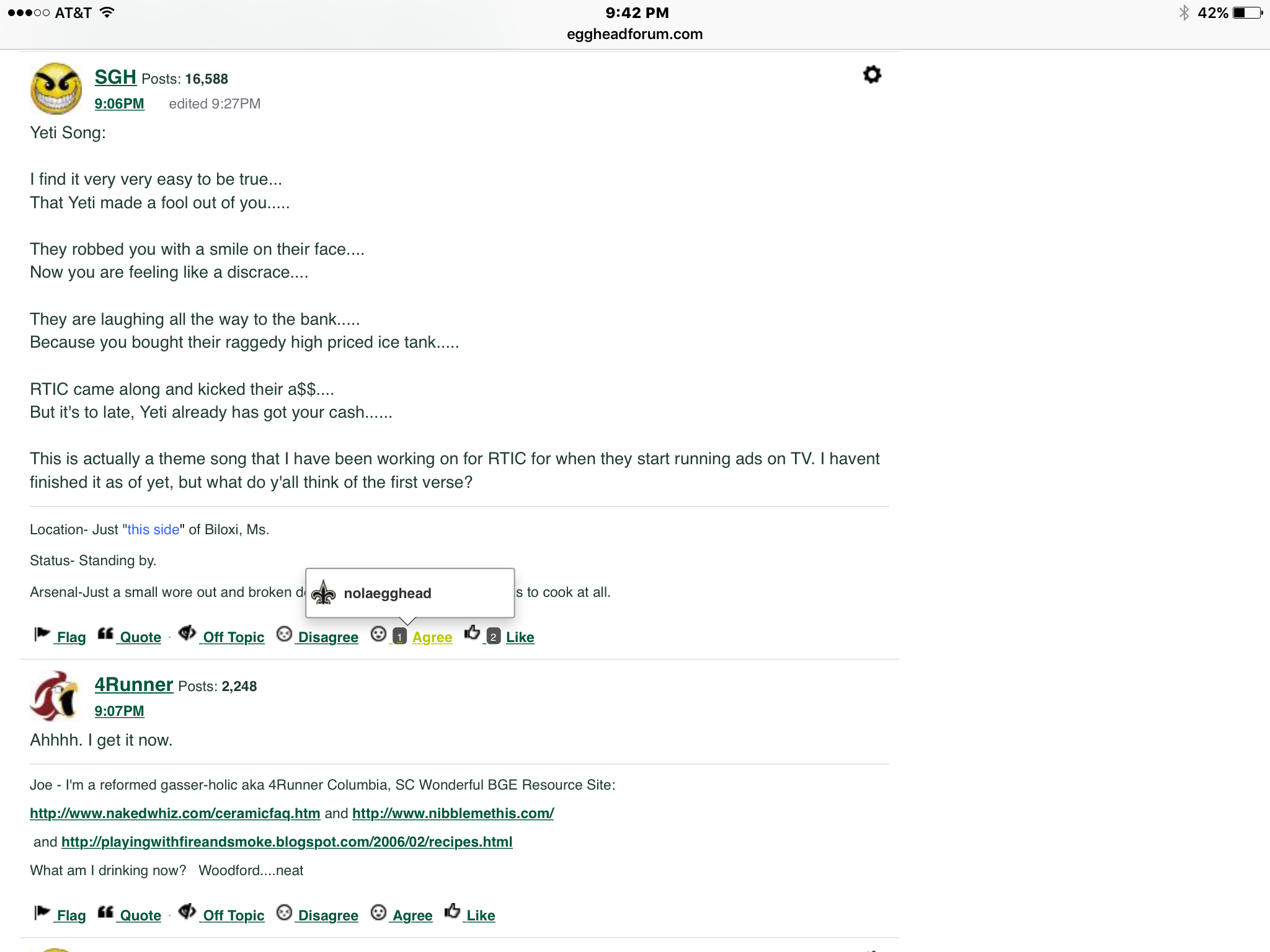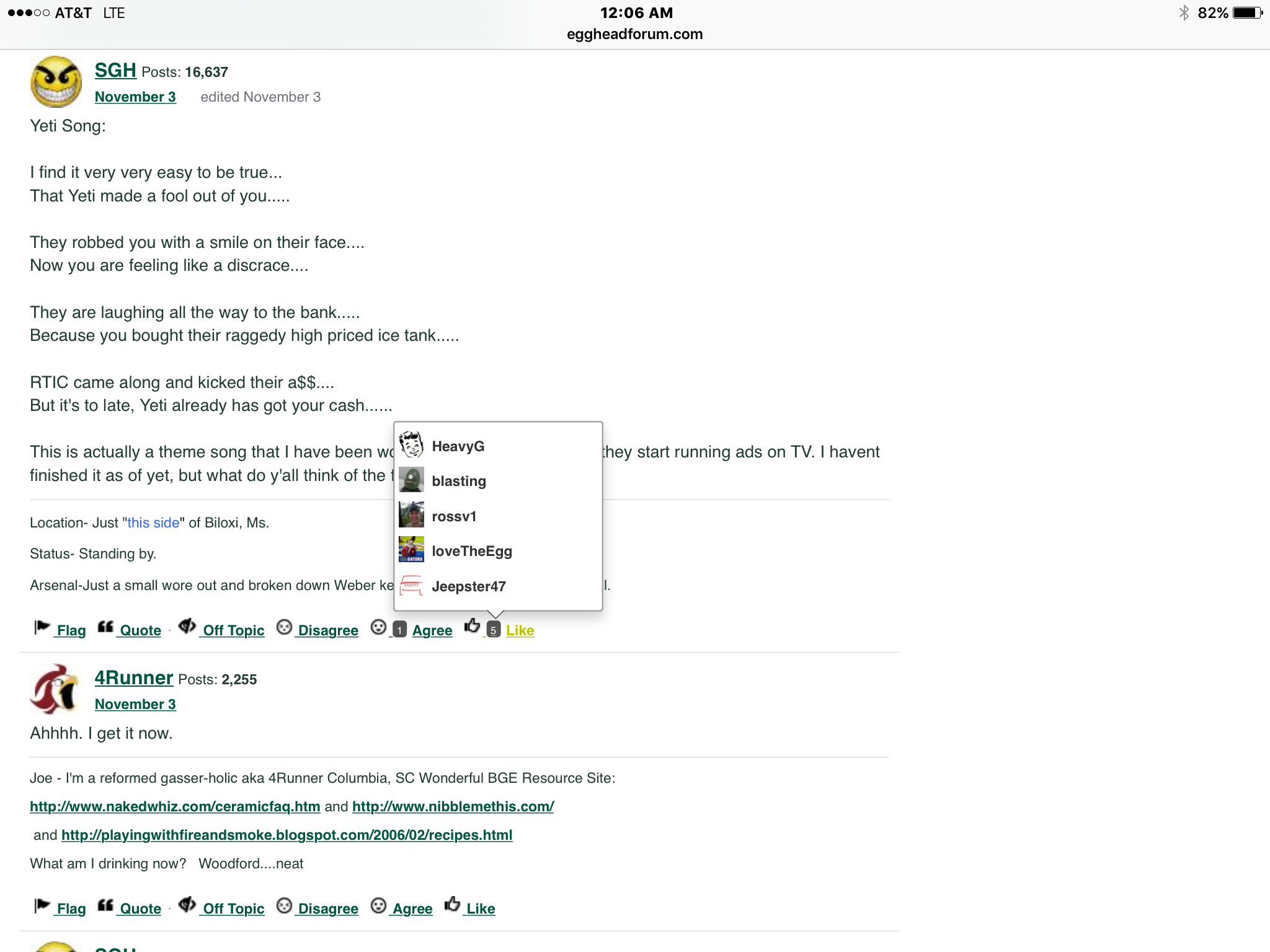 You need to road trip more often...that song has been out for probably 4 months. Great song.Joe - I'm a reformed gasser-holic aka 4Runner Columbia, SC Wonderful BGE Resource Site: http://www.nakedwhiz.com/ceramicfaq.htm and http://www.nibblemethis.com/ and http://playingwithfireandsmoke.blogspot.com/2006/02/recipes.html