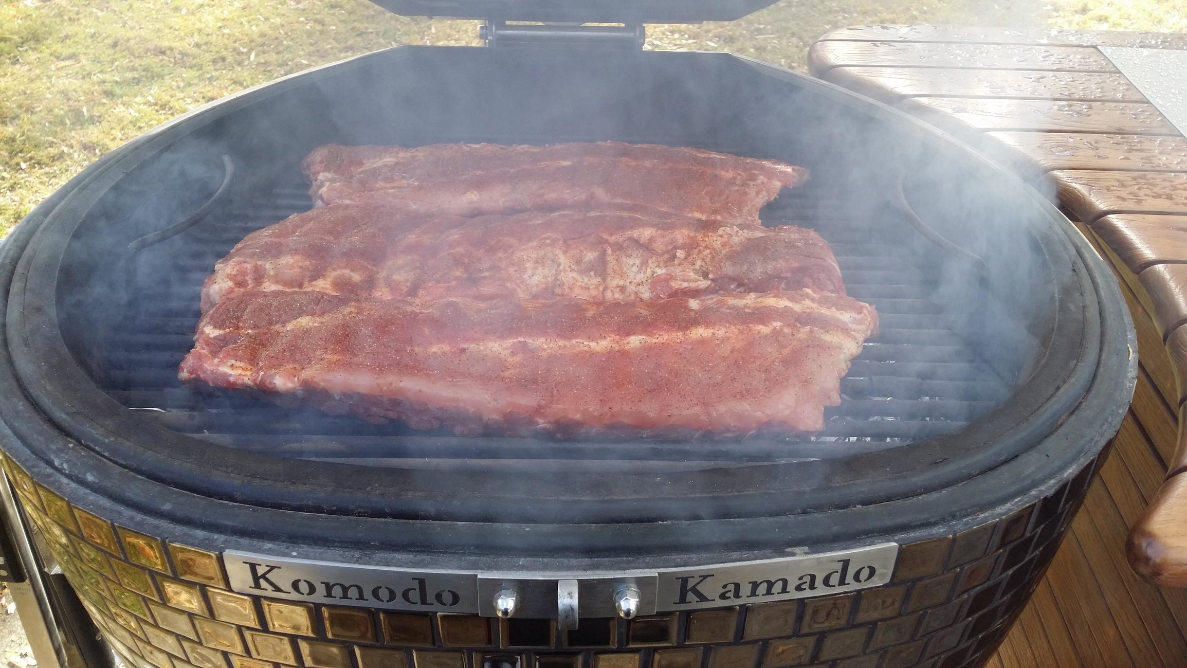 I rubbed the ribs in Smokin Guns Mild rub and used one chunk of sugar maple and some coffee wood chunks for smoke. I cooked the ribs indirect at 225f.