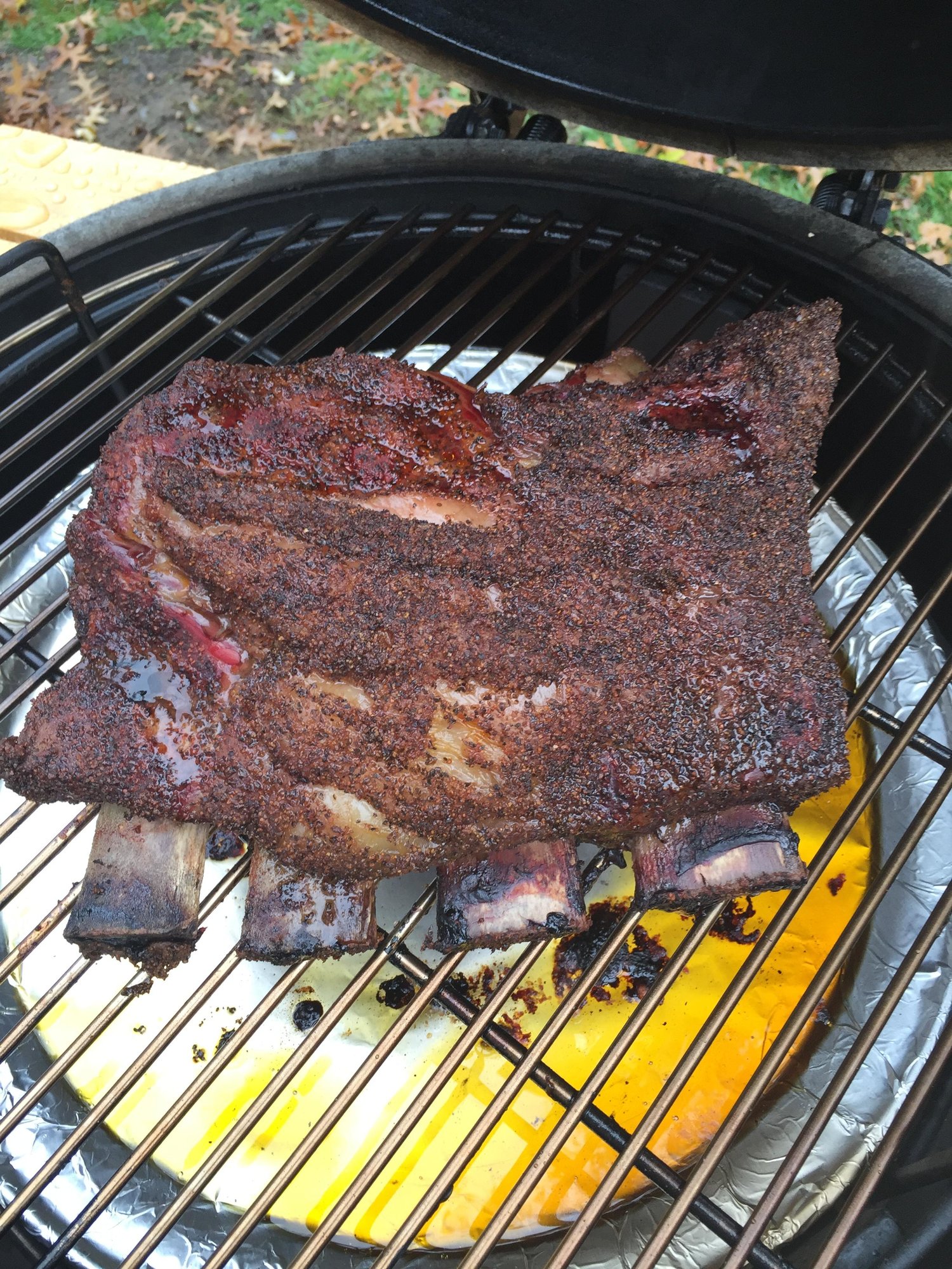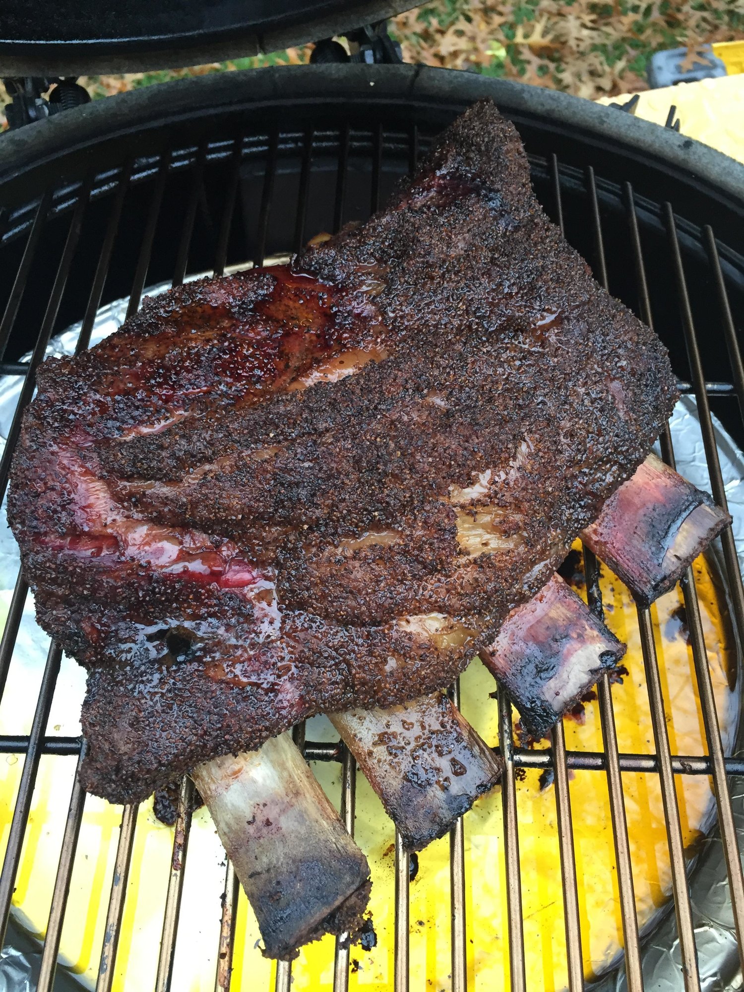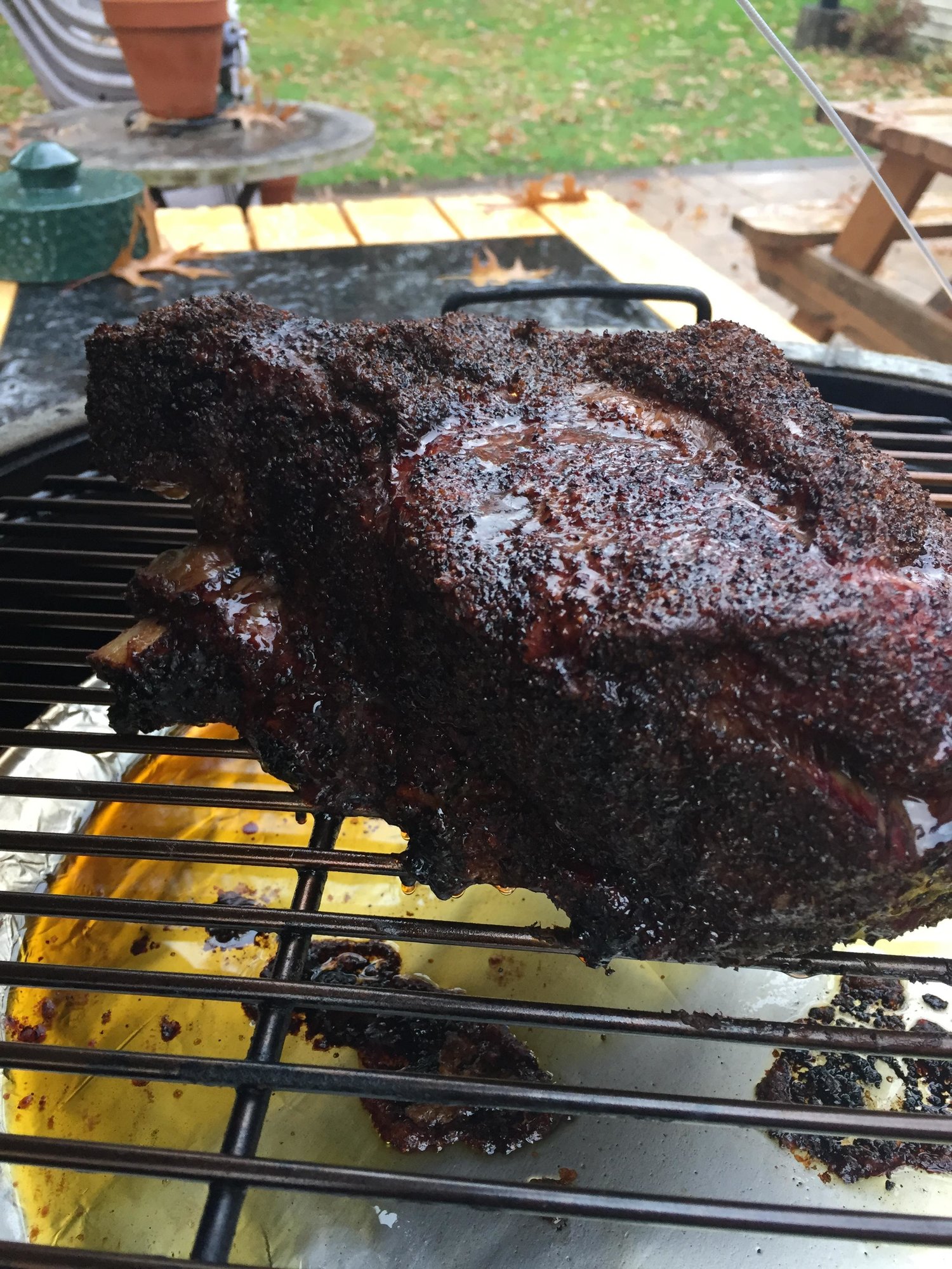 Alright. Short ribs went on at about 0900. Prep was yellow mustard and holy cow rub. I'm about to open the lid for the first time. It's been 4 hours. Rockwood and the Flame Boss have been doing all the work.
