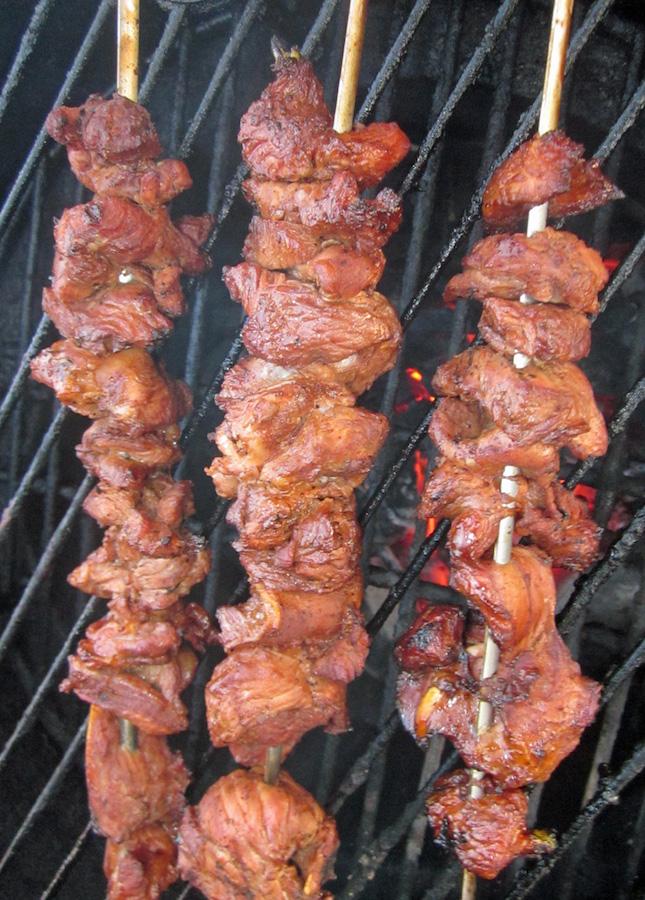 Here is a pork variation I gathered a few years back. When I was there in the late sixtys ate some but forgot the flavor.Monkey, Meat, Philippine Street Vendor Style "Monkey Meat"I was stationed at Subic Bay from 1983-86, and luckily was able to gather a little info on Philippino cooking. The marinade you're looking for is 7-Up, believe it or not. Usually the meat is pork sliced thinly, "woven" onto a wooden skewer and marinated overnight in 7-Up, garlic, soy sauce or what ever other spice suits your taste. I personally like to add a little cayenne pepper to give a little "hot" to the meat. You can use monkey if you like, but it's a darker meat and you need to marinate longer to get rid of the wild taste. Barbequed monitor lizard or fruit bat wasn't too bad either. ****** Norm Corley, Athens, Greece**** It was my mother-in-law who happened to be visiting at the time. After telling me all about it, she got in the mood to do some. She used 7-up, garlic, soy, vinegar (and possibly some sliced onion--I don't remember). She put it on skewers and I grilled it. Good stuff. Just make sure your grill is hot enough to brown them quickly, and get them off before they dry out.INGREDIENTS:Recipe Type: Appetizer, Side Dish, SnackSourceSource: Phillippines, 2005/12/23Author NotesBGE Forum, Michael B, 2007/12/26A friend at work says his wife, who is from Baguio, uses 7-Up, coconut and palm vinegars, soy sauce, kalamansi ( Calamondin ) when she can get it or lemons when she can't, and garlic.BGE Forum, 2008/03/02---Filipino BBQ Beanie-BeanActually, it's pork country cut ribs sliced very thinly. The secret marinade sauce we use on it is Mama Sita's barbecue marinade, some crushed garlic, and some beer.Oh yeah, be sure to soak your bamboo skewers in water a bit before you put the meat on so that they don't turn into smoking wood on the BGE. Cook temp was 350 deg before I put the foil shield in just under where the thermo is located. Kinda have to do it by time/feel for this one--lots of rotating of the skewers to prevent the meat from turning into charcoal.--------------------------------------------------------------------------------