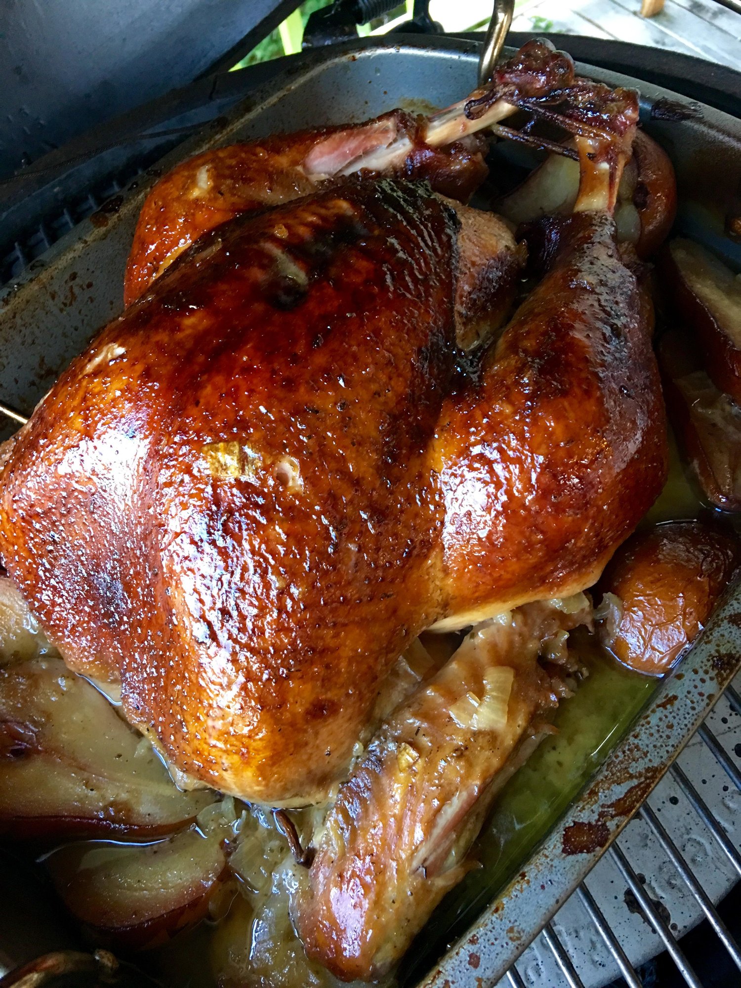 Iplaced in an onion-lined roasting pan and added chicken stock, some Sauvignon blanc and halved pears, last year I used apples but I think the pears were better or it could have been the BGE effect. Kept in in the egg, with plate setter, at around 325°F, and apple chips dispersed throughout the coals. I basted with the pan liquid every 30 minutes after the first hour. It turned out really well except the 14-lb bird got to 165 in only 3.5 hours. In the future, I would use the rack to offset it from the pan liquid for a more even browning.