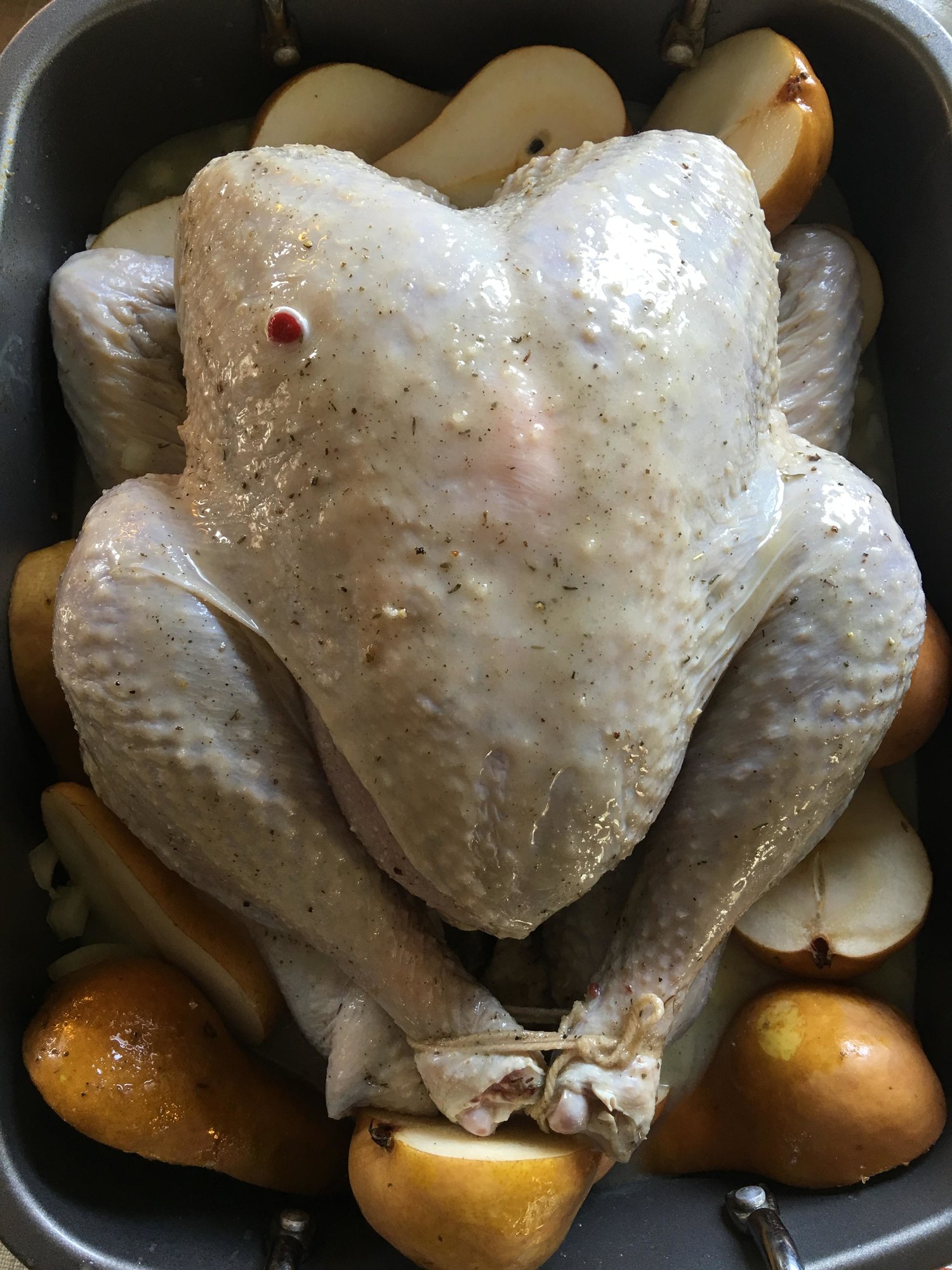@annjamaican that looks really good! Do the pears add flavor to the turkey? What did you do with them after the turkey was done?