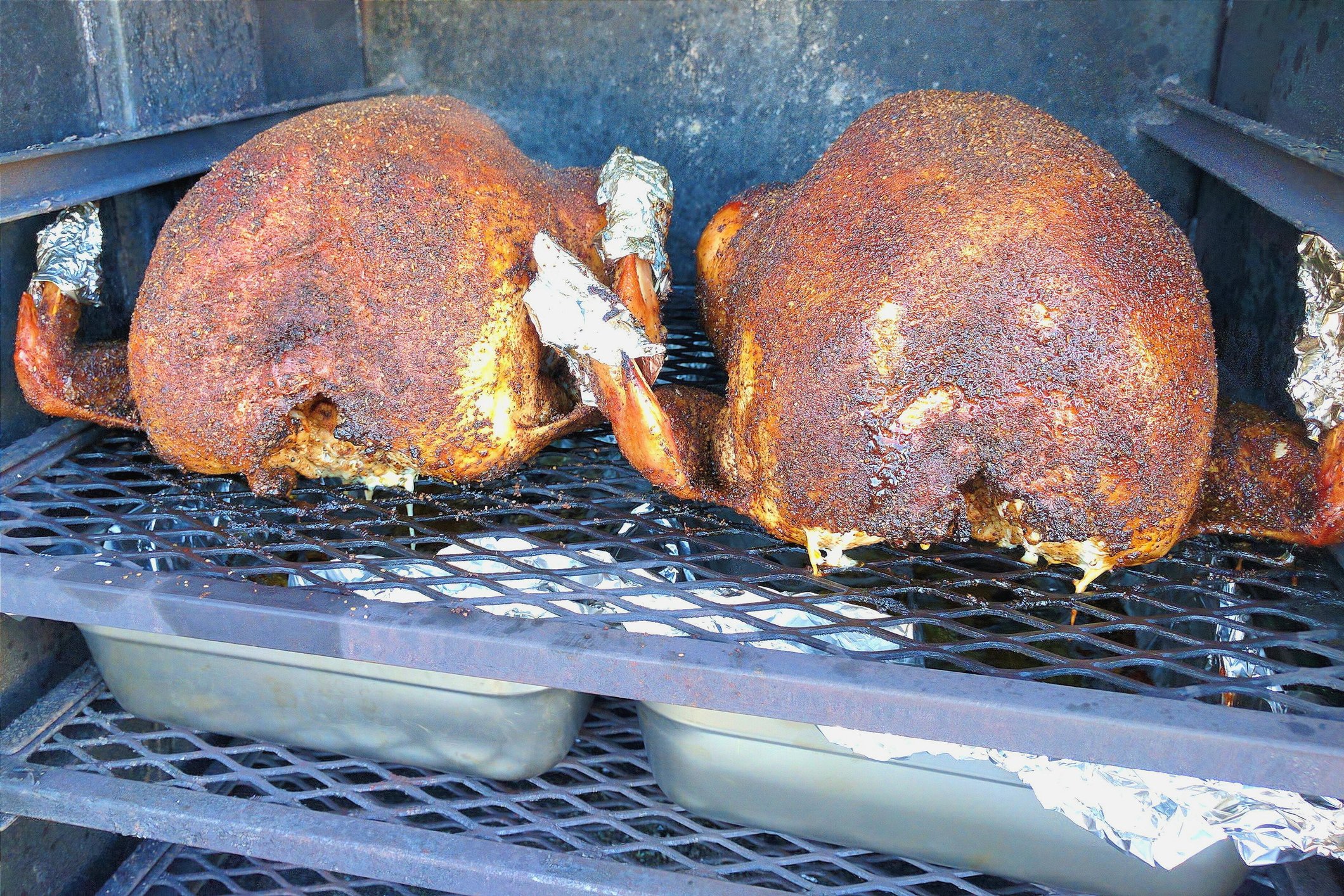 Three pics so far. 1) when I just put it on, 2) about half way through and 3) finished.  Took about 4 hours checking the temps in legs, thighs and breasts.