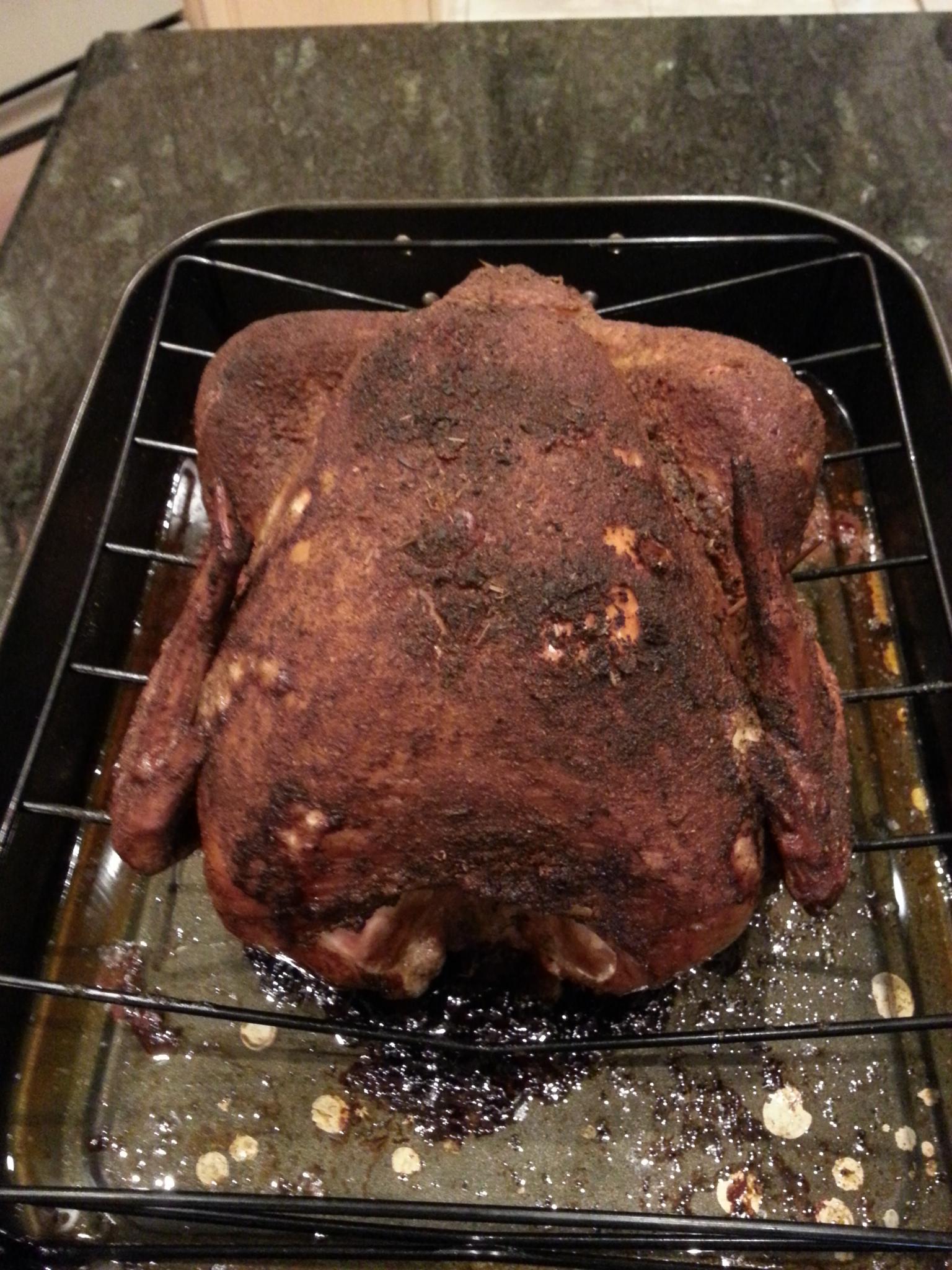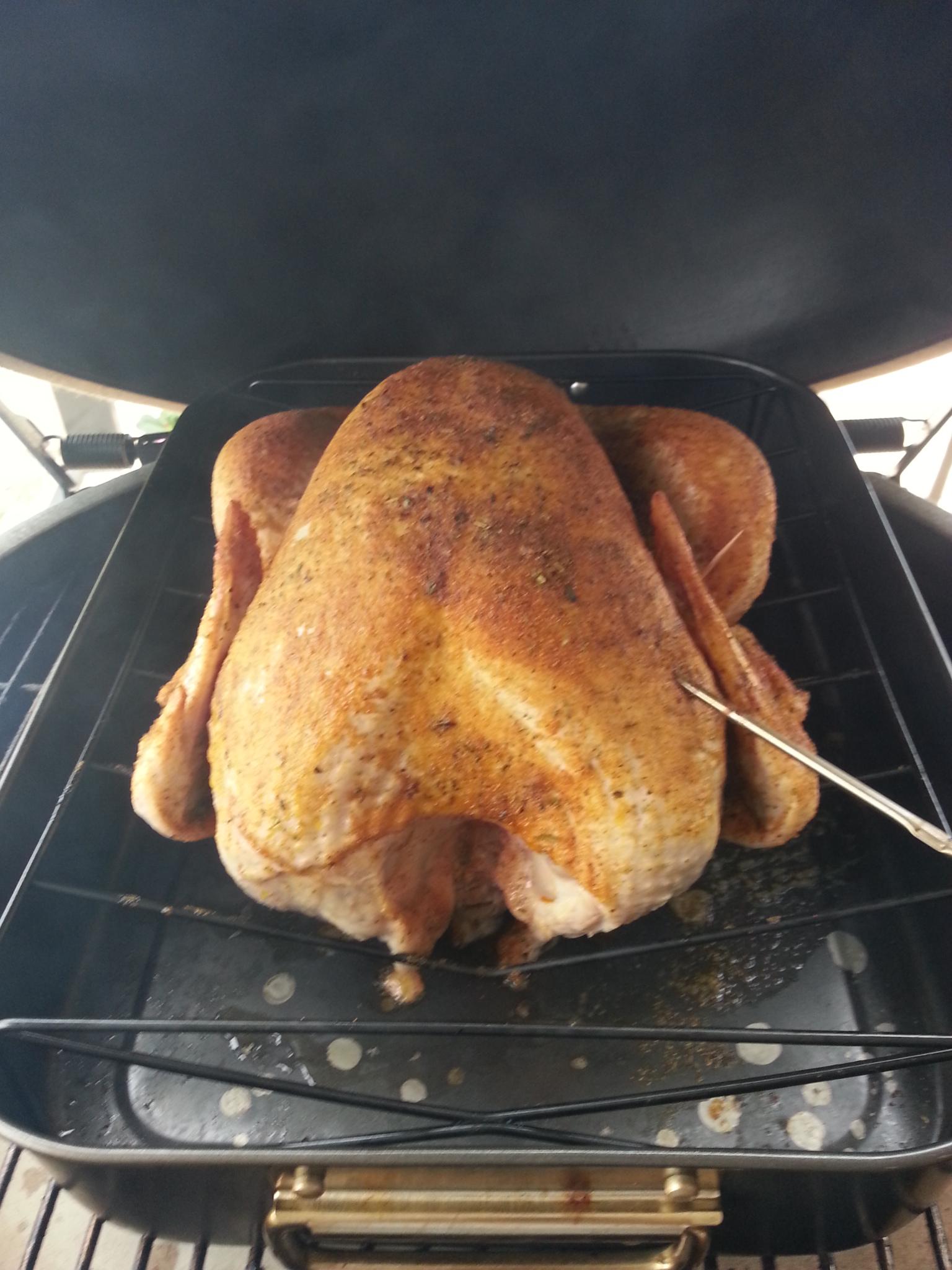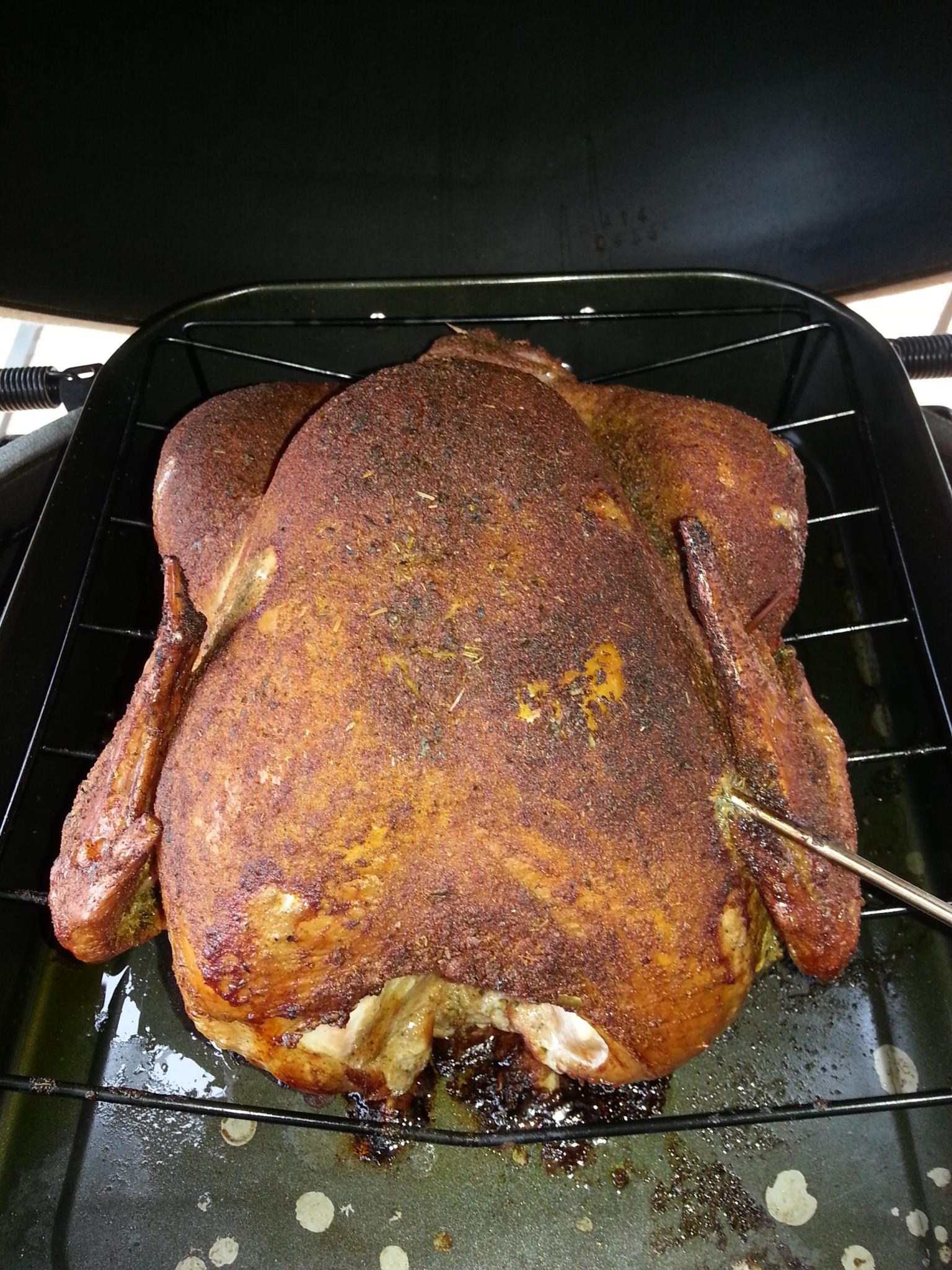 Cooked a practice turkey today with a very simple style just to try it out.  Turkey is about 14.5lbs.  Cleaned and let dry in the fridge.  Covered it in a stick of melted butter and covered generously with Pork U - Garlic 101.  I liked the look of the spices in it for turkey. Also added a couple of fist sized chunks of Pecan based on a recommendation.  It is resting now for tasting in a bit.