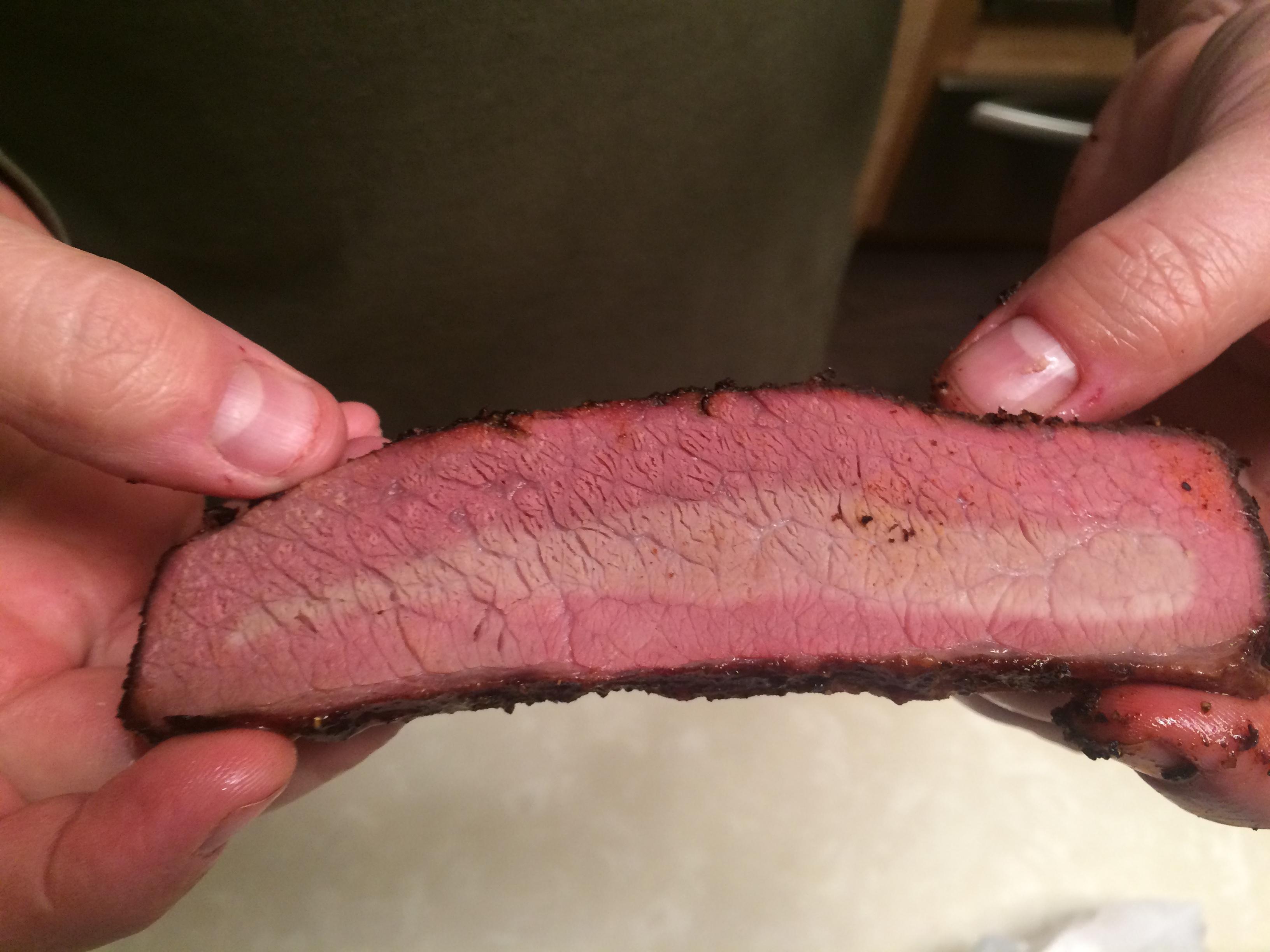 I thought it turned out good. Flavor was excellent. The point was perfect. The flat was definitely not moist, though I wouldn't say it was "dry" in the conventional sense - it was just different. The texture throughout was just a little different than a normal smoked brisket. It was not tough at all but it was not juicy, or something like that, especially in the flat. That smoke ring was just abby normal though.
