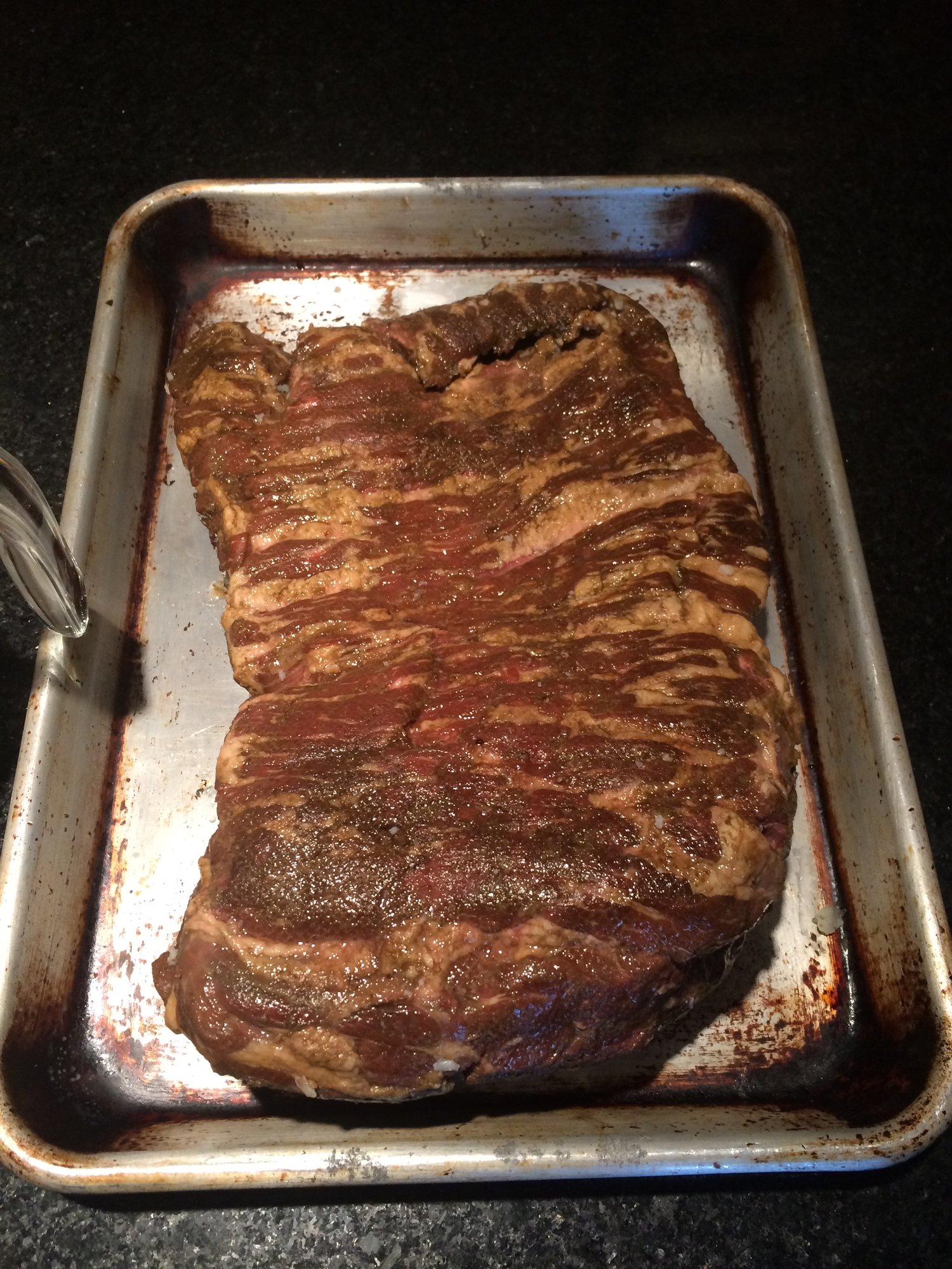 That is interesting and very possible. This one was rewarmed to like 170 when I pulled it. I just did it until the bark looked right. It never had the texture of a "regular" cooked brisket- it was always pretty firm in the flat. It was actually fork tender but not what you would consider a normal bbq brisket to be. I'll do another one next week with no rest period between the brine and the cook (note to self- do not start drinking before putting the brisket in the bath this time) and see how that turns out. I need to get a good baseline so I can tweak it from there. On the good side- it had plenty of good oaky smoke from the egg finish so this can be done. Just need to play with it a little. I really like the glaze and the rub. I'll incorporate both of those in to the plan going forward. I'll probably skip the liquid smoke and pink salt. You couldn't really tell there was liquid smoke on it but it got plenty of smoke from the egg. This experiment was for people who do not have a smoker so that's why they had to trick it up with all the liquid smoke and smoked salts. The smoked salt is great in the rub though. That is a winner.SGH said:
