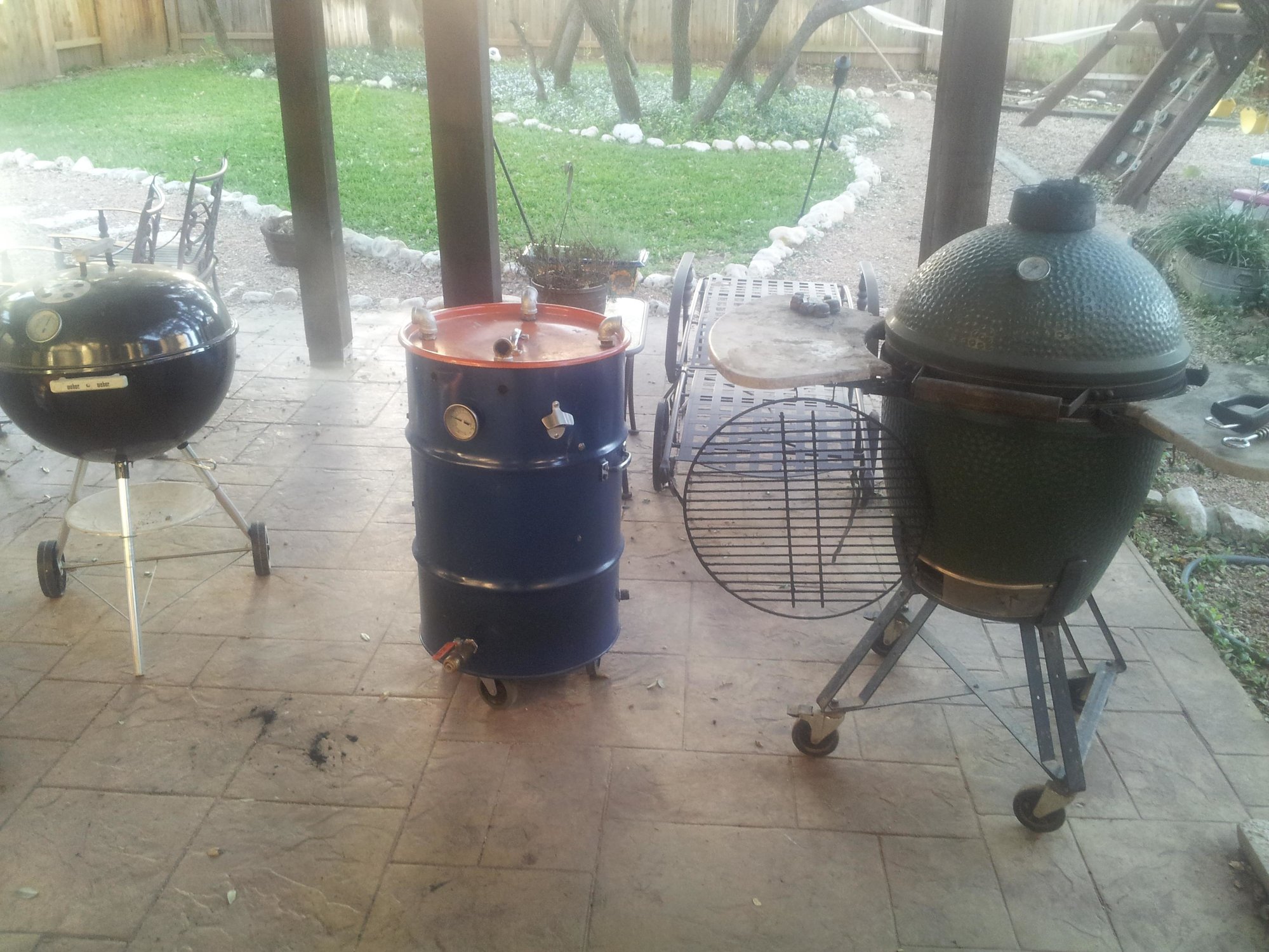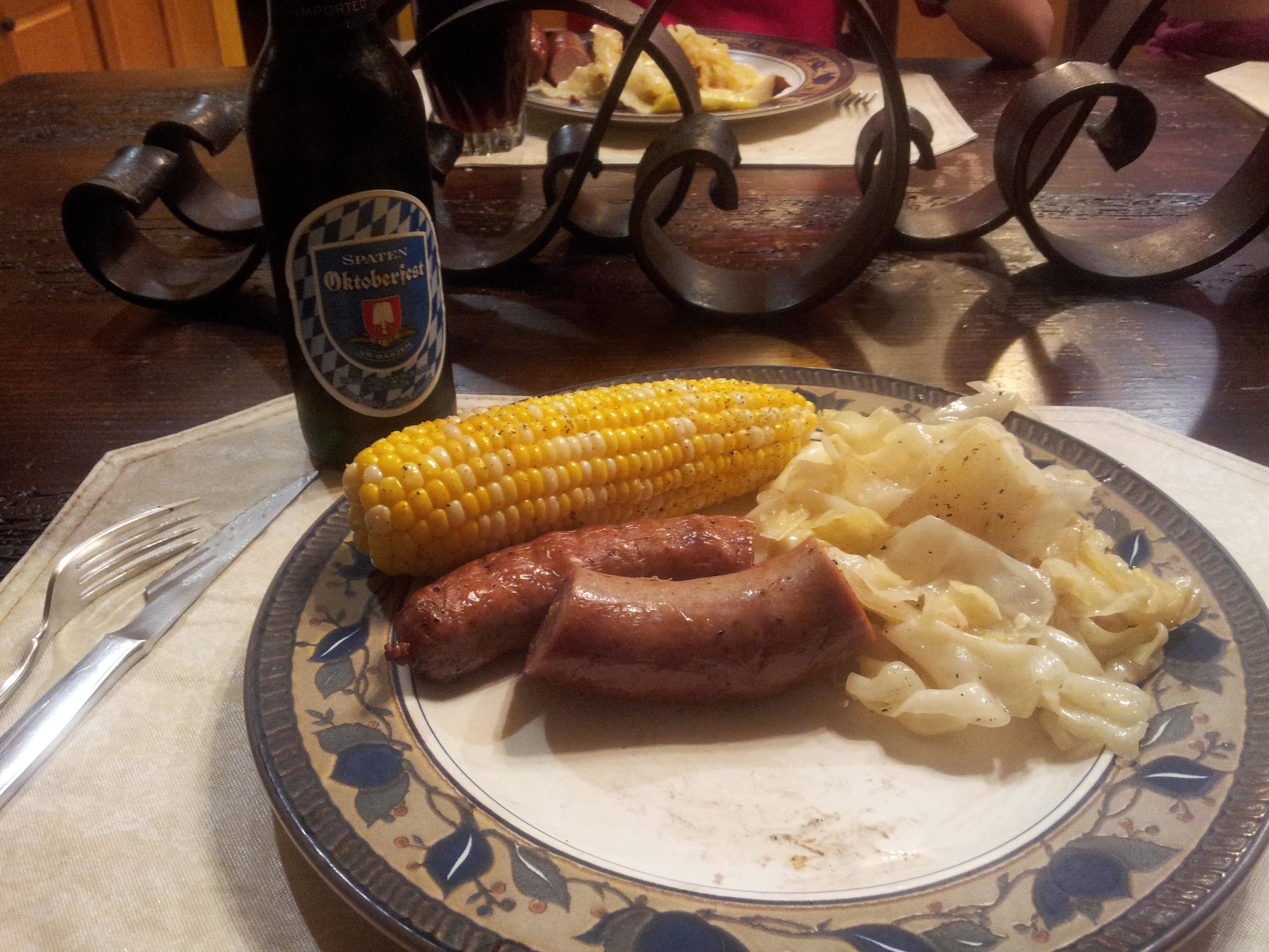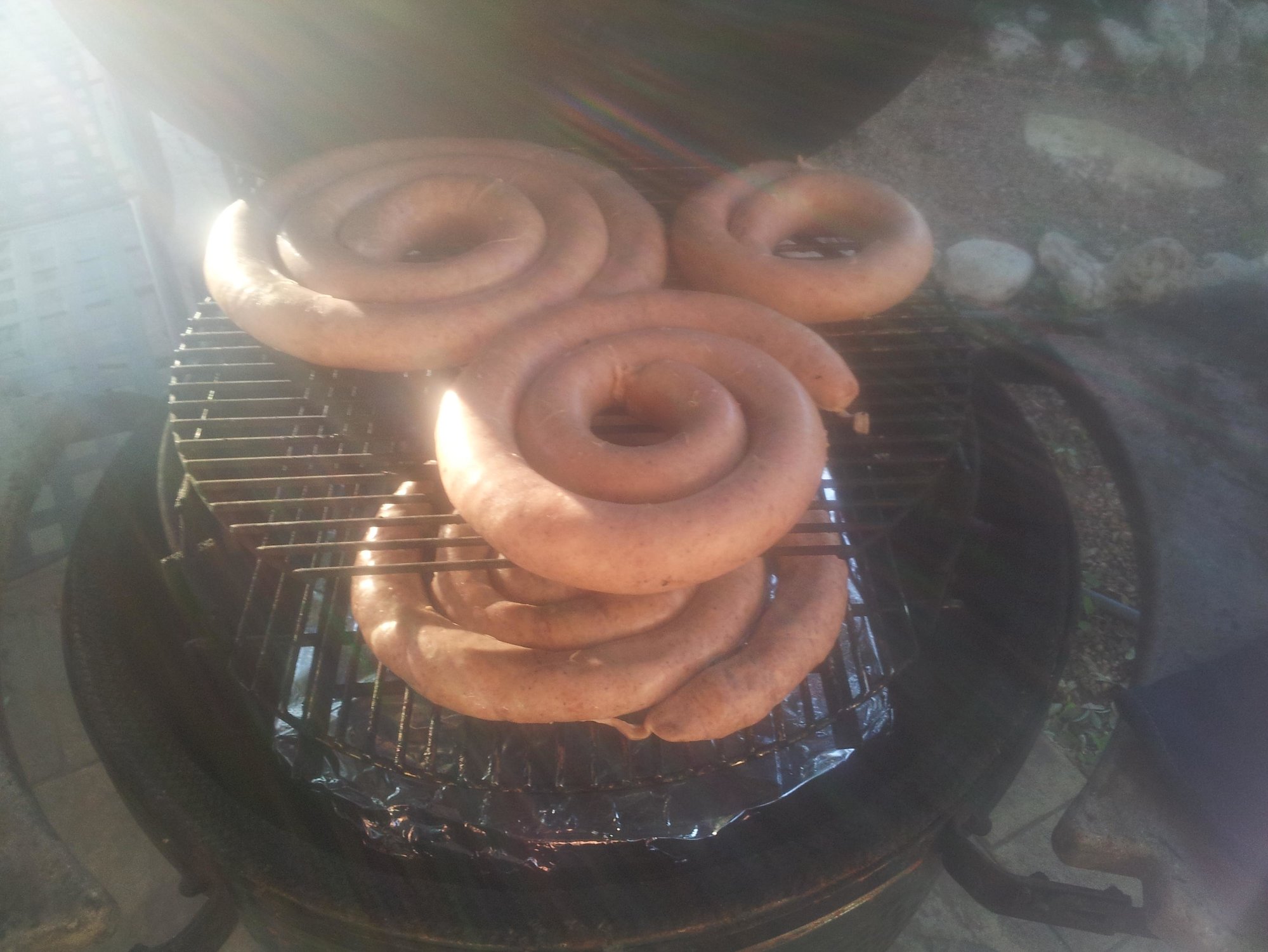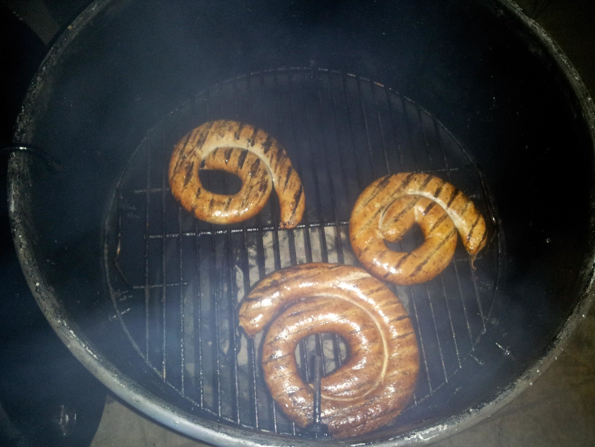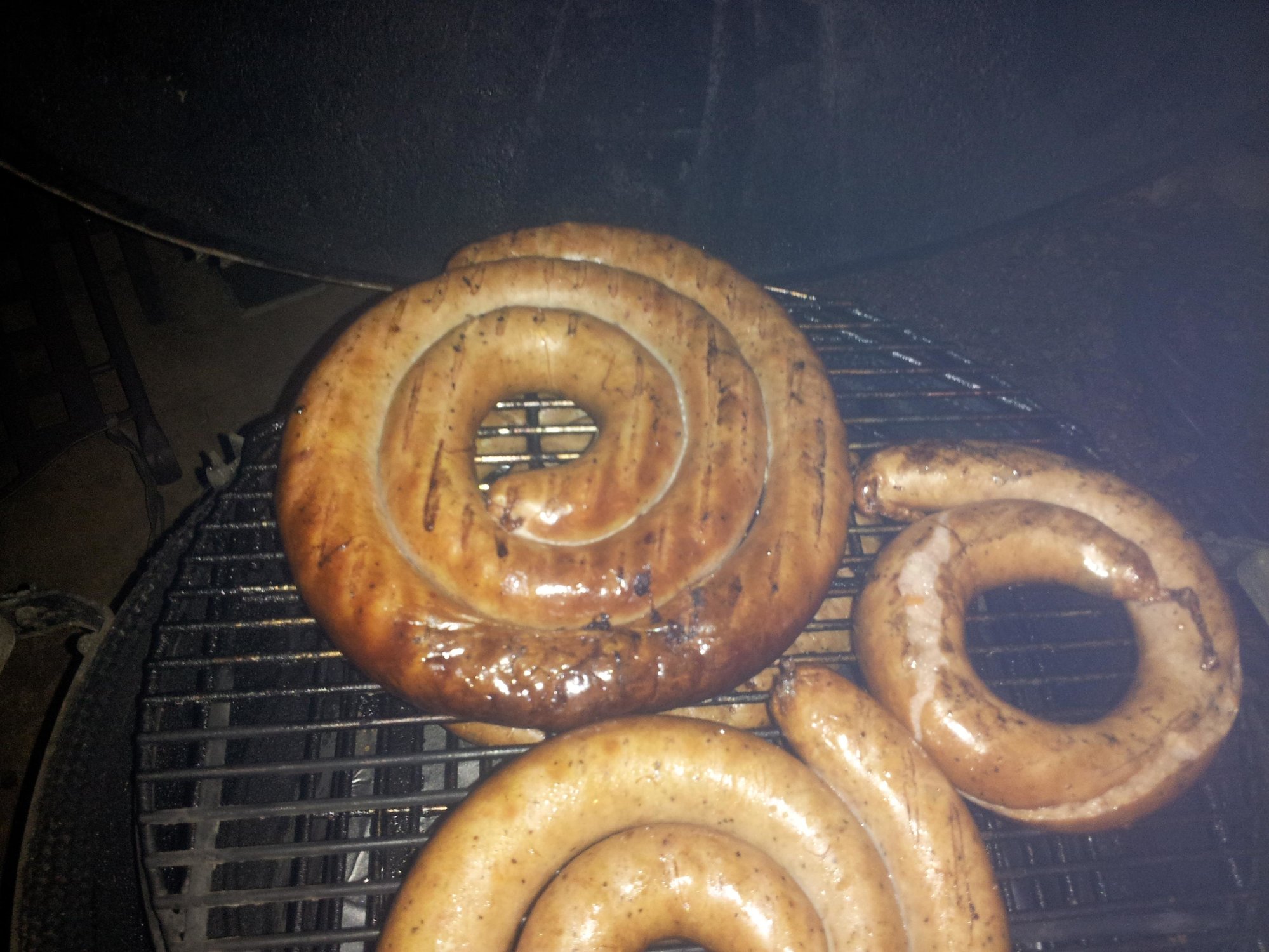 I took my first try at making sausage from scratch today, and it turned out really well. I started with 9 pounds of pork butt and a whole chicken. I deboned and de-skinned the chicken and ground up and seasoned the chicken and pork Thursday night. Today, my son Philip and I stuffed some really nasty looking pig intestines with the ground up meat. Philip was a huge help with stuffing the sausages. We made kielbasa out of the pork, half normal and half habanero, and we made a special chicken sausage for my wife since she can't eat the pork. Then I smoked the sausages for a couple hours. The kielbasa went on the Green Egg. The chicken sausage went on the Ugly Drum Smoker. The Weber Kettle had smoked cabbage and corn. Good stuff, but a whole lot of work!