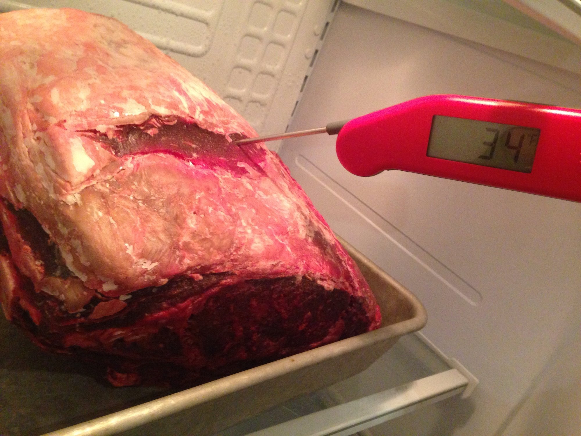 The smell is.... Impressive! I'm hoping it's just that it's a small, well sealed fridge. The temps look fine. My guess is the humidity is too high. The outside of the roast feels moist/spongy.