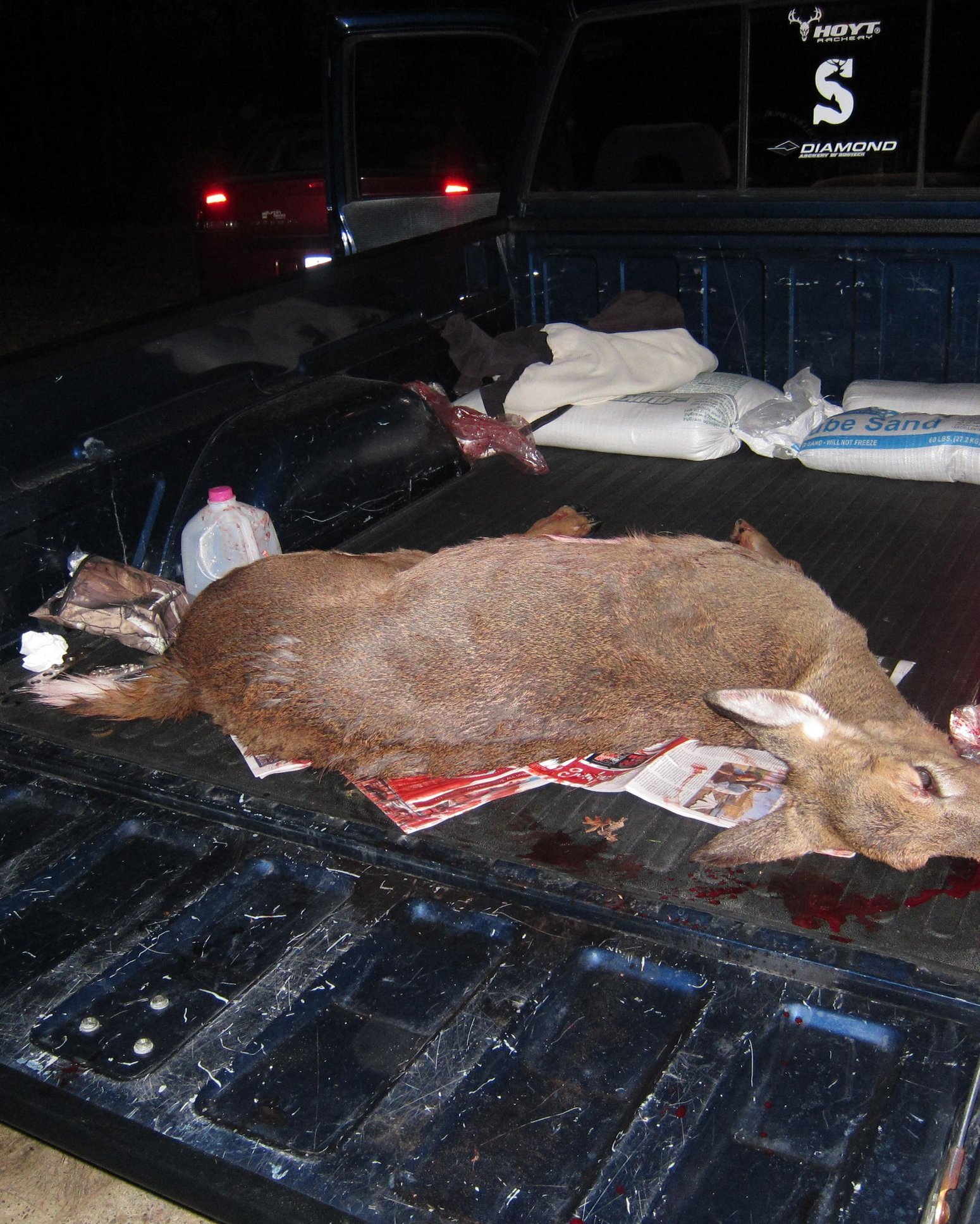 • If you have cooler/fridge access, hang the cleaned carcass for a week or two.  Cut the tenderloin into Filet Mignon size chunks.  Lightly coat in EVOO, sprinkle generously with Spicy Montreal steak seasoning or MC Holy Cow and red pepper flakes, then sprinkle some Worcestershire sauce on it and let it marinade at least an hour.  Throw on the grill like you would any steak to medium rare-medium.  It will be some of the best meat you have had!