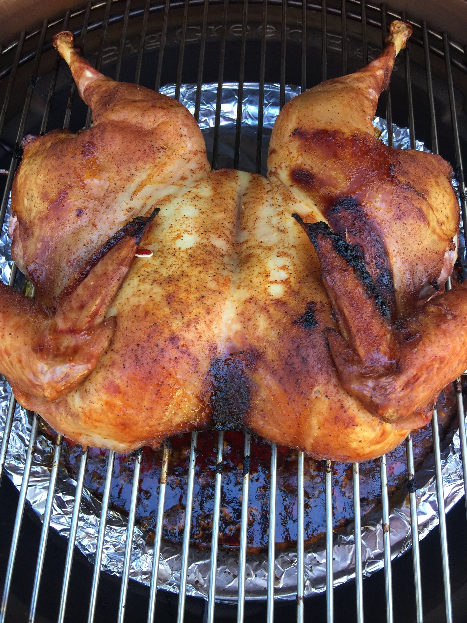The rig came out so I could put the spatchcocked bird on after about an hour. Bird was dusted with Three Little Pigs Touch of Cherry and John Henry's Pecan rub.