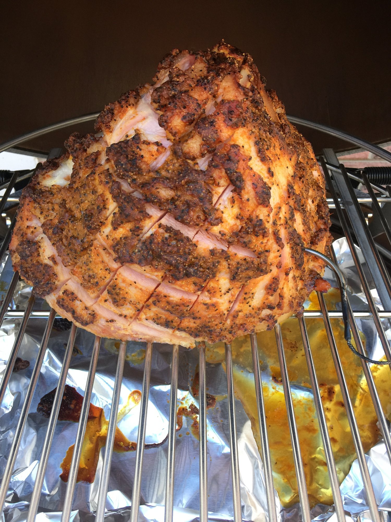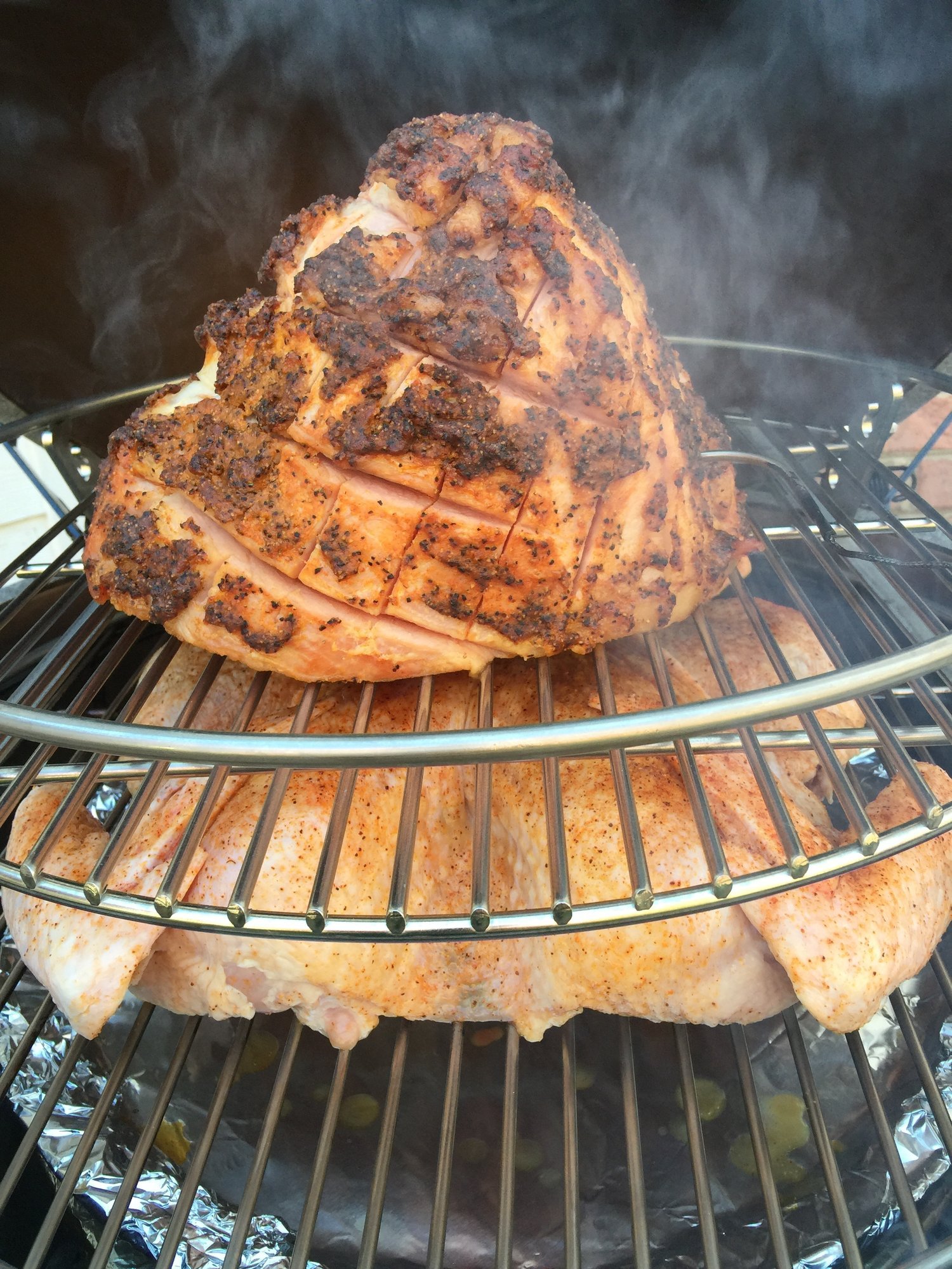 I've cooked ham over turkey's in the past on my WSM so was bound and determined to make it work on the XL. I'm glad to report that it can be done! It's a nice bonus to have the juice from the ham basting the bird below while they're cooking.