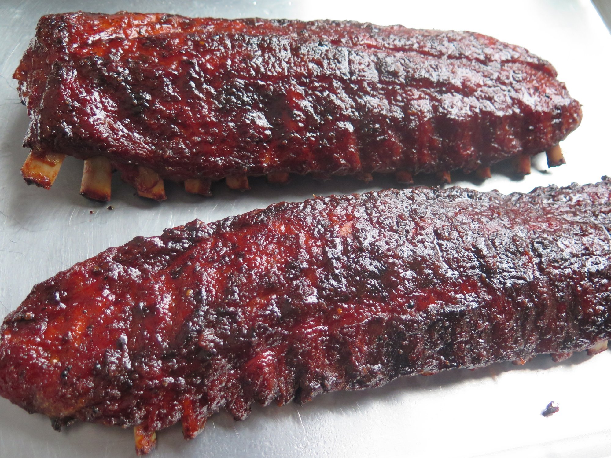 XL at 330F, p/s legs up, half sheet drip pan, stock grid on p/s legs, 2 racks laid flat, bigger rack at back, smaller rack in front, thicker side of each rack facing away from centre, 1:15 meat side up, 1:15 meat side down, sauced both sides with APL honey bbq sauce, 20 minutes to firm up.