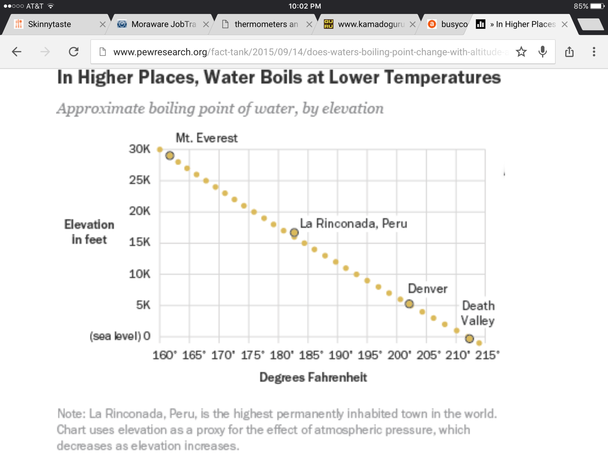 What elevation are you at? 212* boiling temp is at sea level. Any chance you are around 5000' elevation?cjxlbge said:I have a Lavatools Thermawand and a ThermoWorks Chef Alarm (with both an internal meat probe and a probe for grate level temp). I boiled some water and both the Thermawand and the Chef Alarm indicated the temp was 203.5 and 203.4, respectively. Are my thermometers broken? I am cooking a prime rib dinner tomorrow night and am getting concerned. Thanks for any help.They/Them