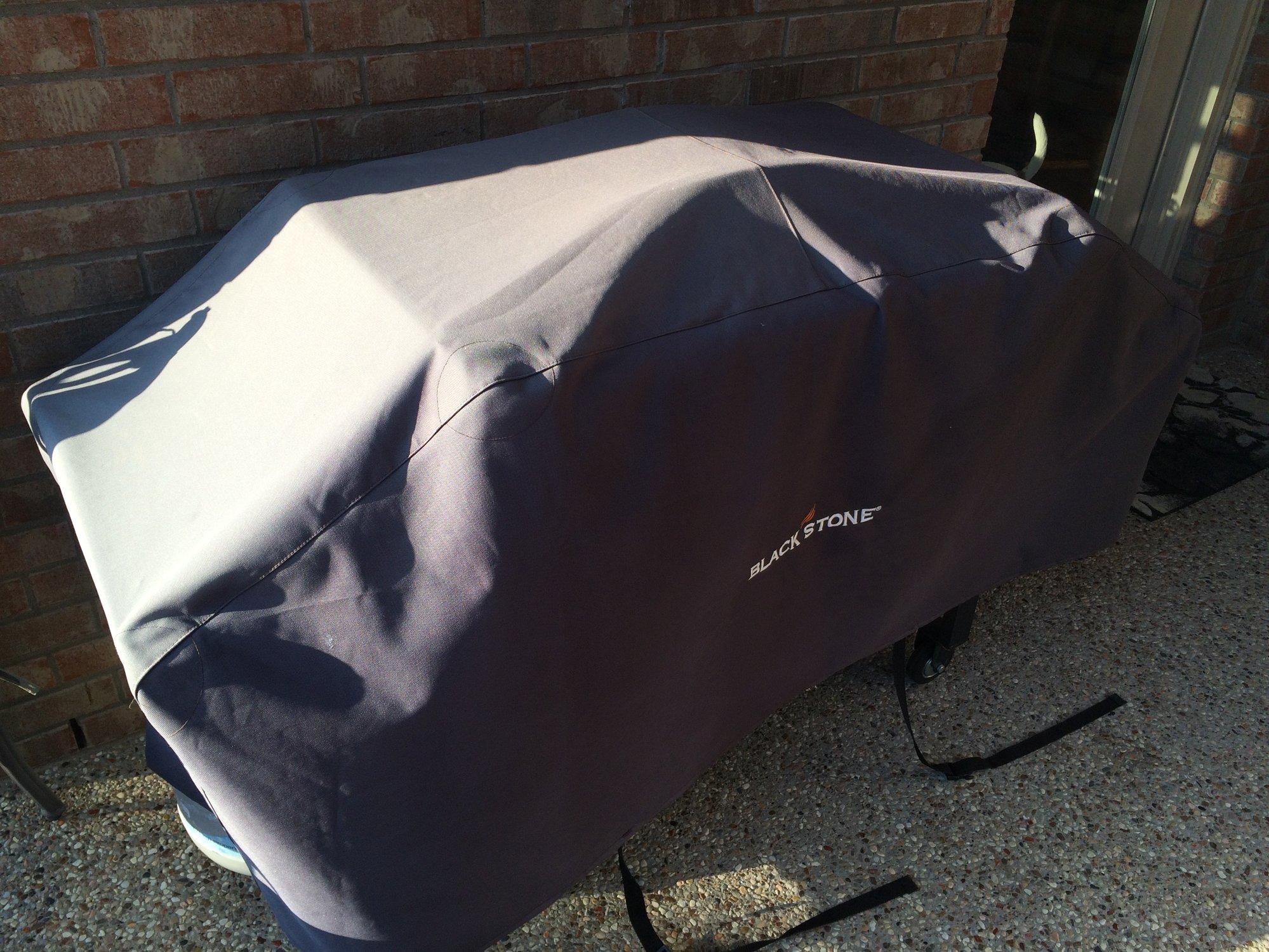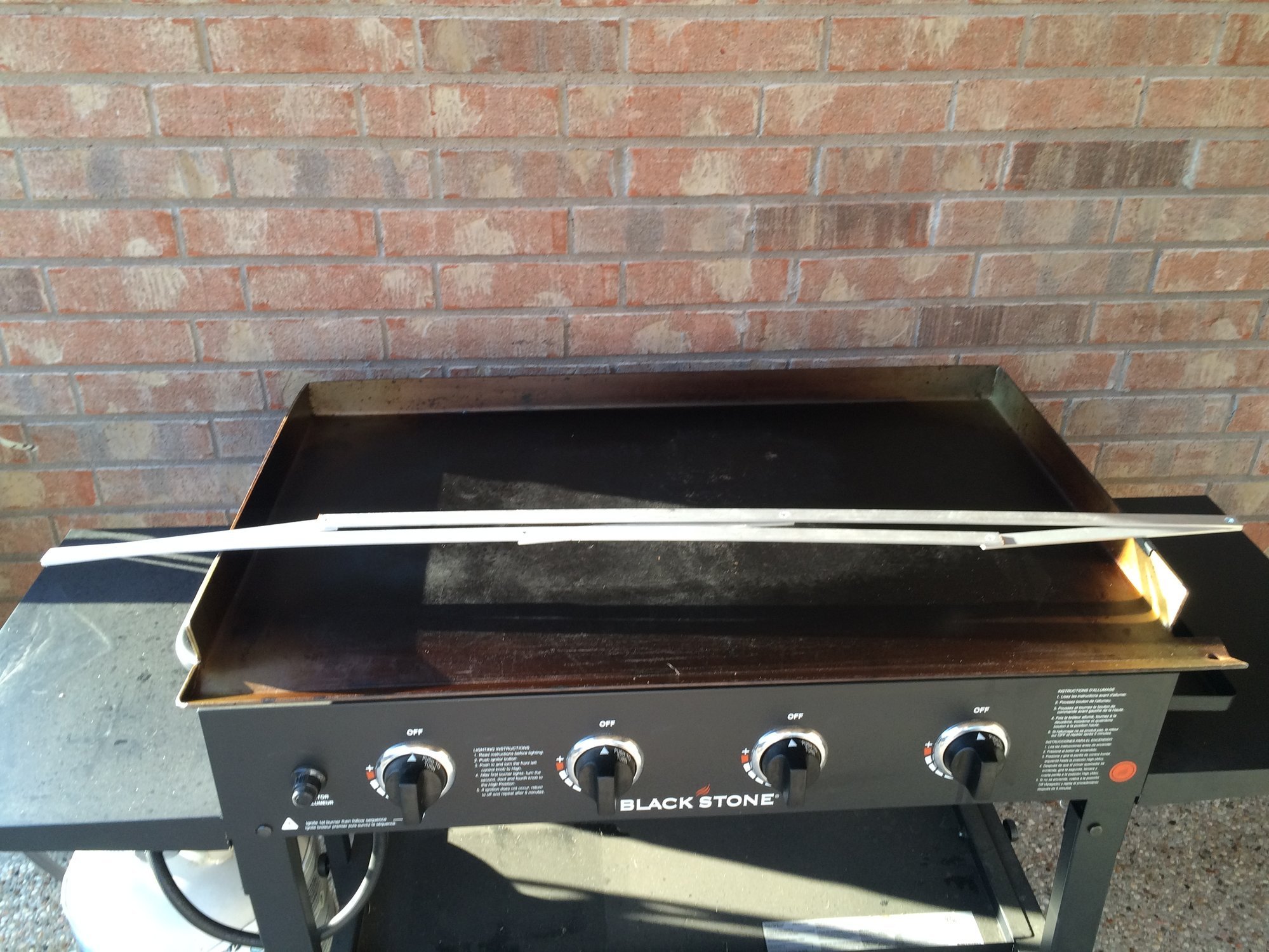 When I got my Blackstone and put the cover on I knew I needed to do some thing. So I first used a couple of roasting pans, open side down. Later my great friend, Spring Chicken got himself a Blackstone. As I, he was a quandary about the cover also. But with a sharper mind than me, he went all creative and below is the results of his great work and knowledge.