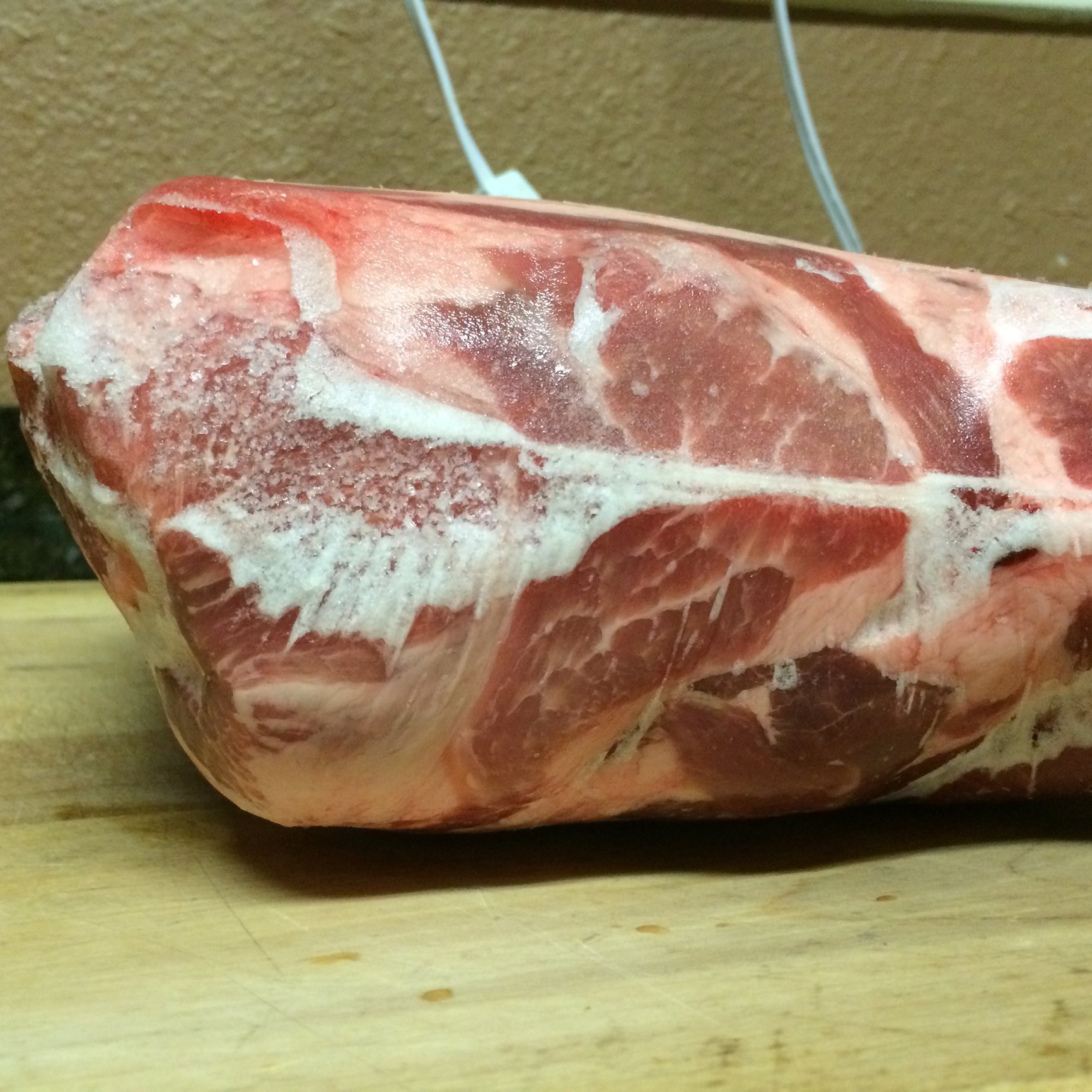 • Gotta let it thaw.......  But a frozen butt is one COLD chunk of meat!!!!  Its kinda fun when you can get a thermo probe inside and it reads below freezing!