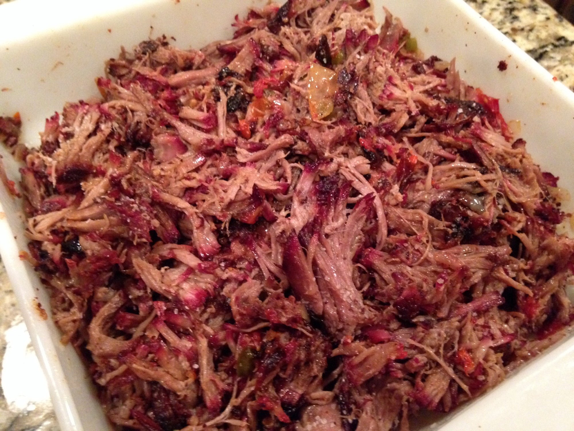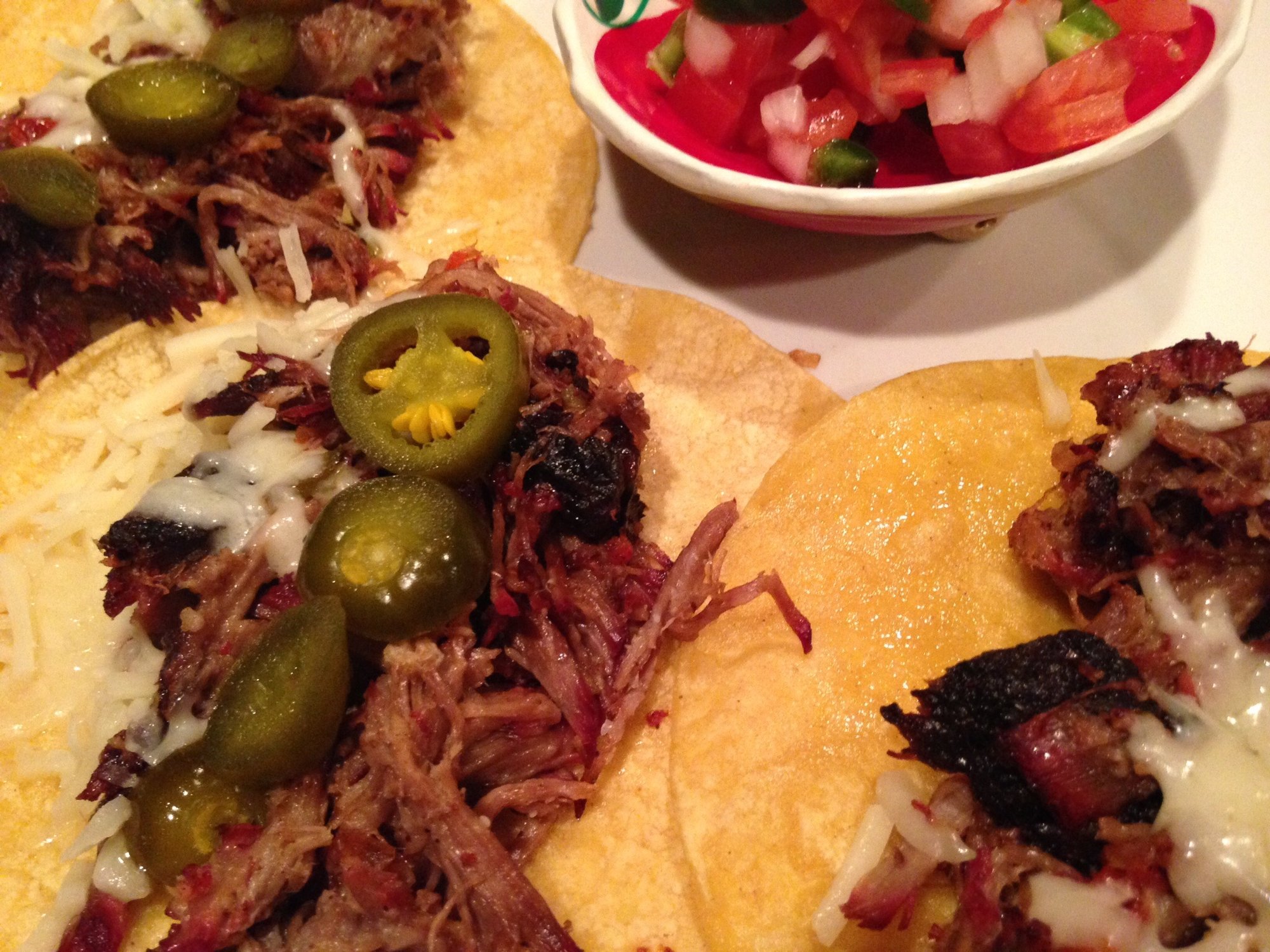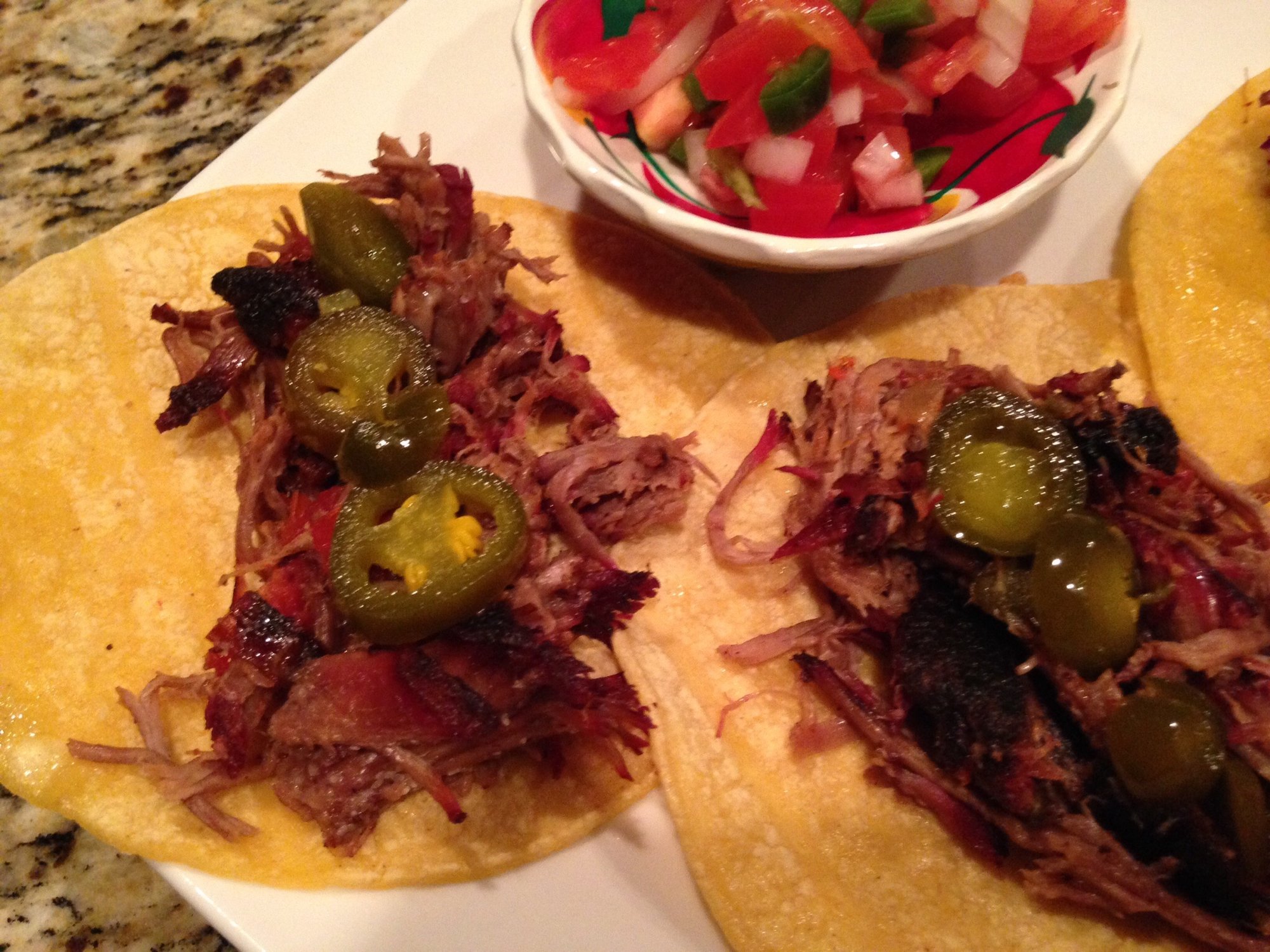 I added some beef broth in a Dutch oven along with some diced tomato, onion and jalapeño peppers.  Thru the Chuckie into the pool and added more diced onion, tomato and jalapeños.  I let it cook for 3 hours and then pulled the beef.  The texture was soft with a nice bark and it had a nice Fajuita flavor with a touch of smoke.  The tacos were very good.