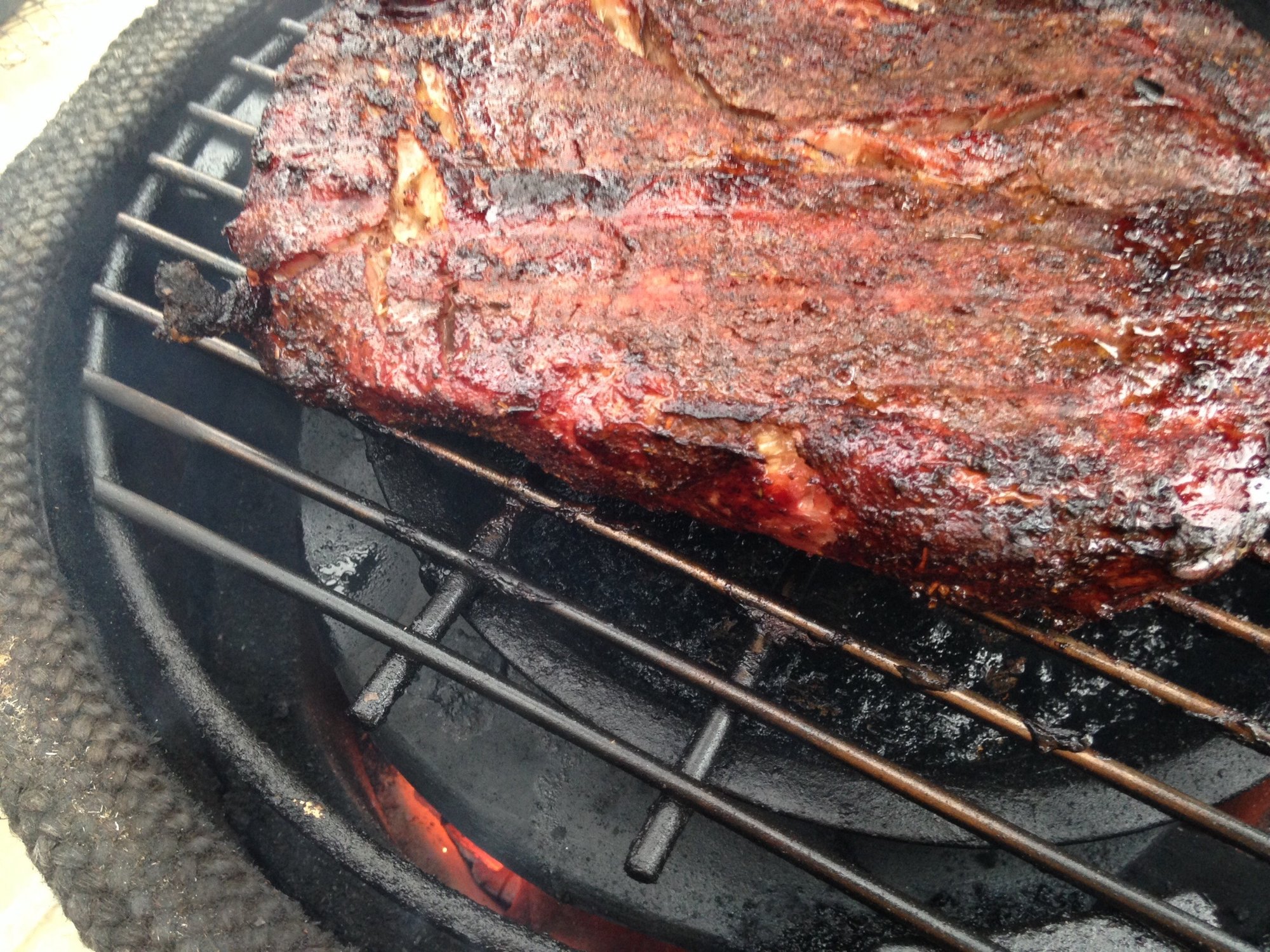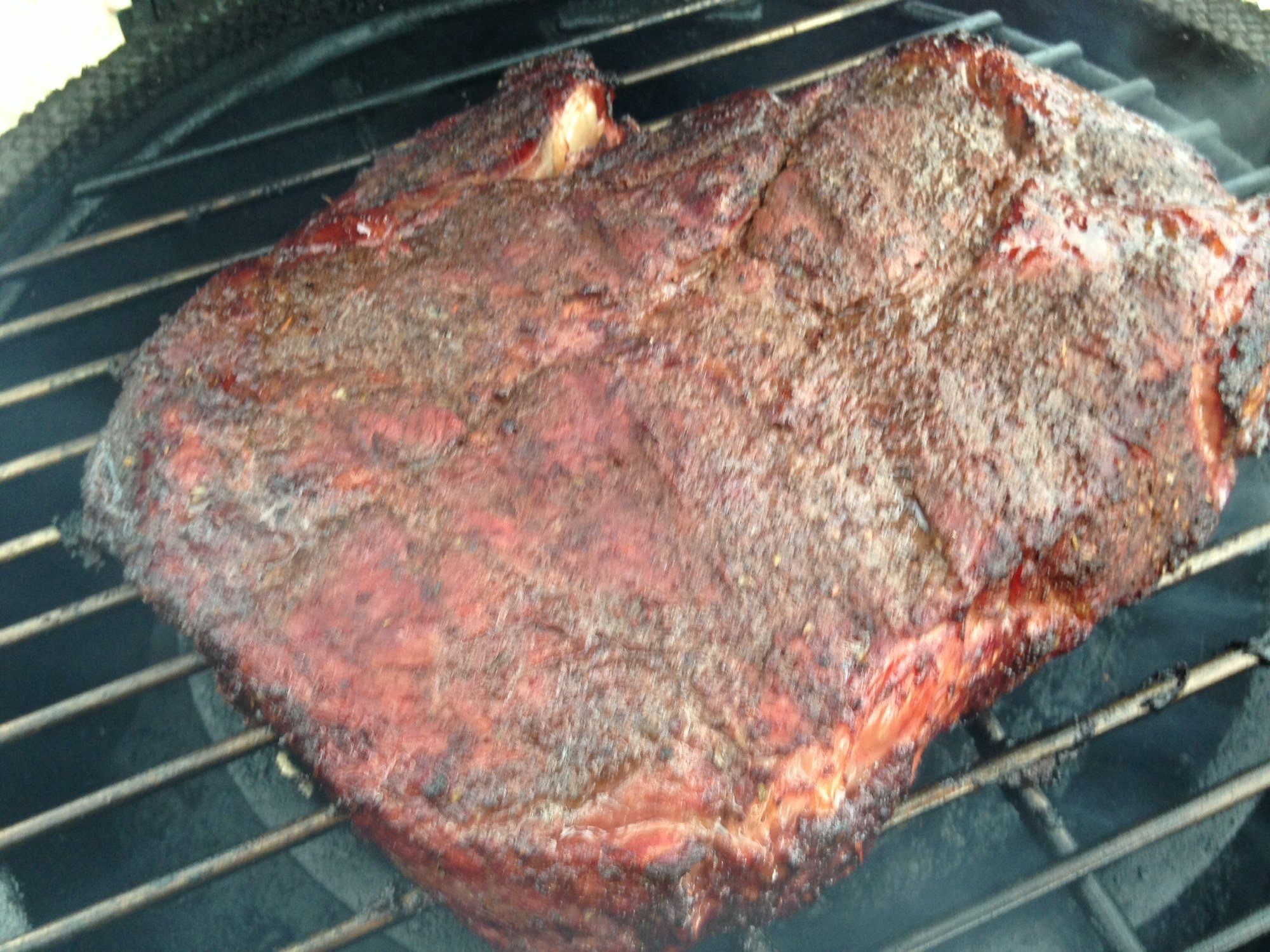 Since I had a chuck roast in the fridge, I used his recipe, less the liquid ingredients as a rub for the chuck roast.  I thru the Chuckie on the Small egg at 300 degrees with some apple and orange wood for smoke and pulled it at 160 degrees internal temp after a reverse sear with the plate setter in place.