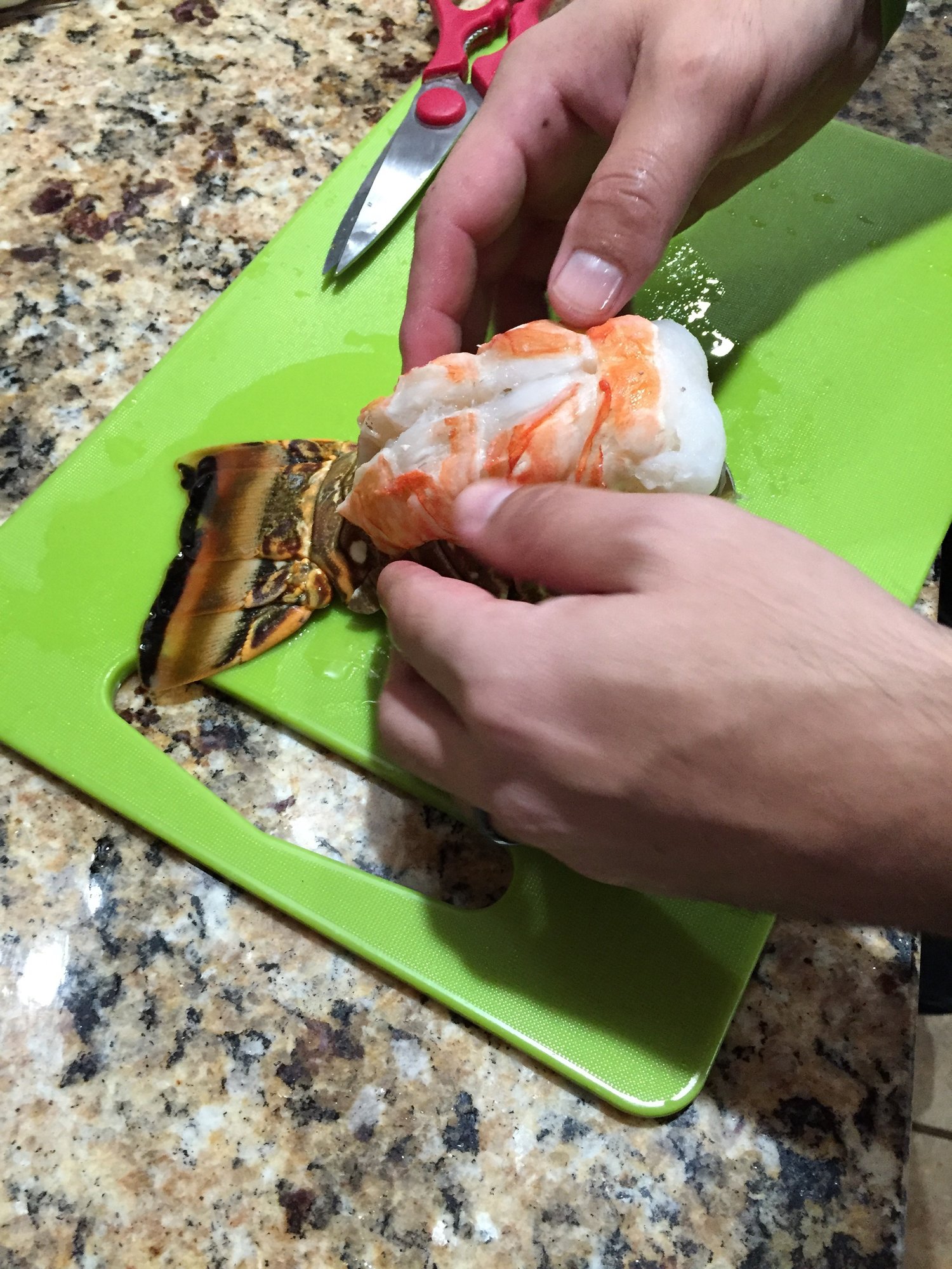 Each tail was 8oz (5lb box at Restaurant Depot cost about $80). I cut the shell down the middle, broke it apart, pulled the meat up (gently) without detaching it from the tail and curled the shell underneath. Painted each tail with melted butter, then threw them on the egg (shell down) at about 500 degrees, direct heat for ten minutes. Painted each one more time before flipping them over (meat side down) for the last 2 minutes. Pulled them off and stuffed my face.