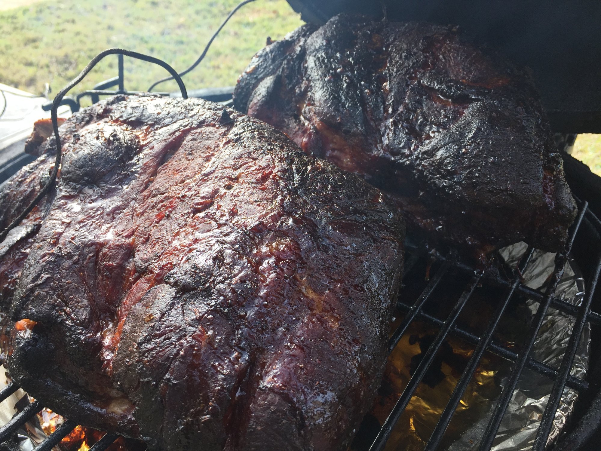 After 12- 24 hrs of marinating, egg the pig indirectly at a dome temp of 250-ish until meat internal temp is 200 -- just like you're doing a pull. My 9.5 lb butt needed a little over 20 hrs. I used some peach wood in the lump intead of doing my normal hic