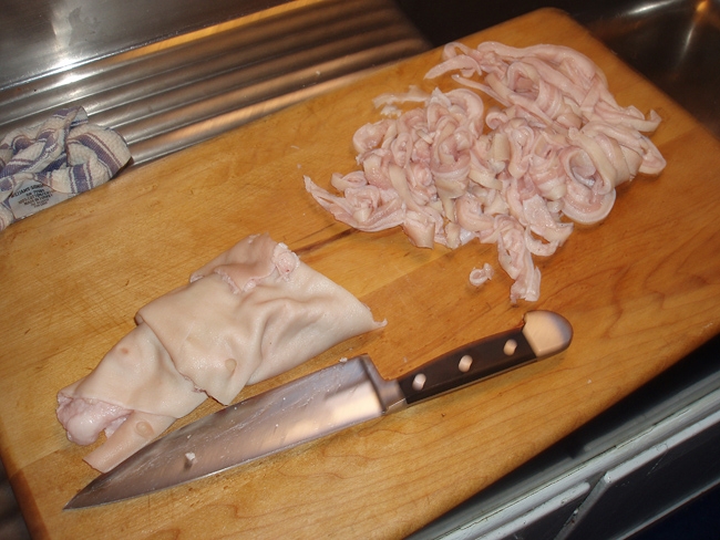 but typically i skin it (remove the skin) first, and cure the meat. the day i start the cure, i roll the skin tightly, and slice it into ribbons. then on to the egg for a number of hours (like, 3 to 4, maybe 5) with some rub until they crisp up