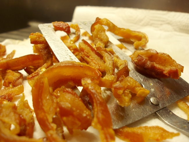 done. good stuff. the drier you get it the crisper it is and the longer it'll store. fat can go rancid quickly stored at room temp. gets sorta soft when refrigerated