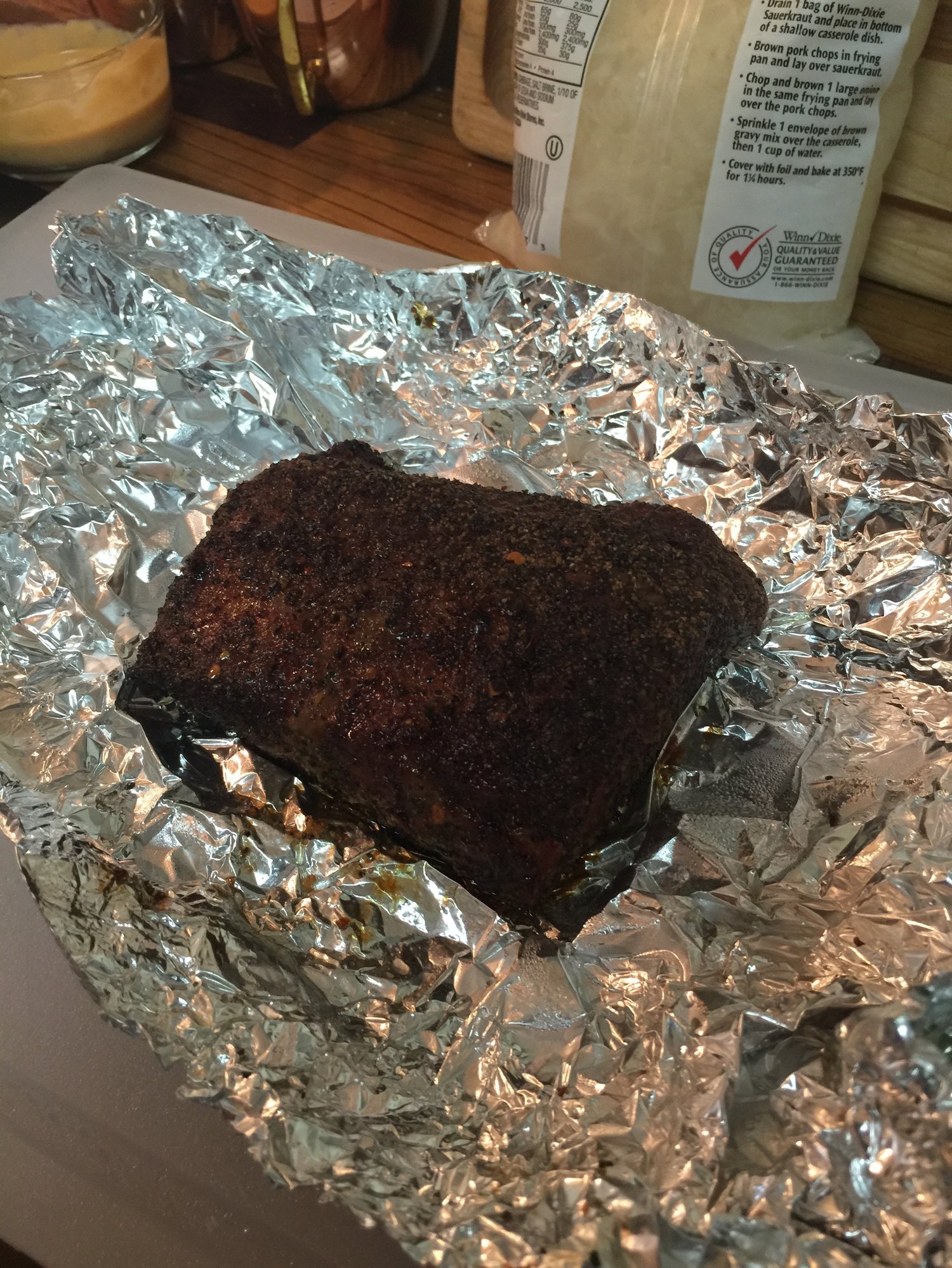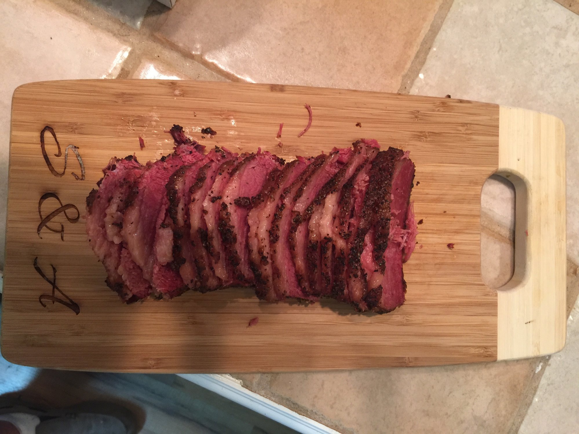 cooked up some corned beef brisket after soaking for a night and wrapped with corse pepper for a day.
