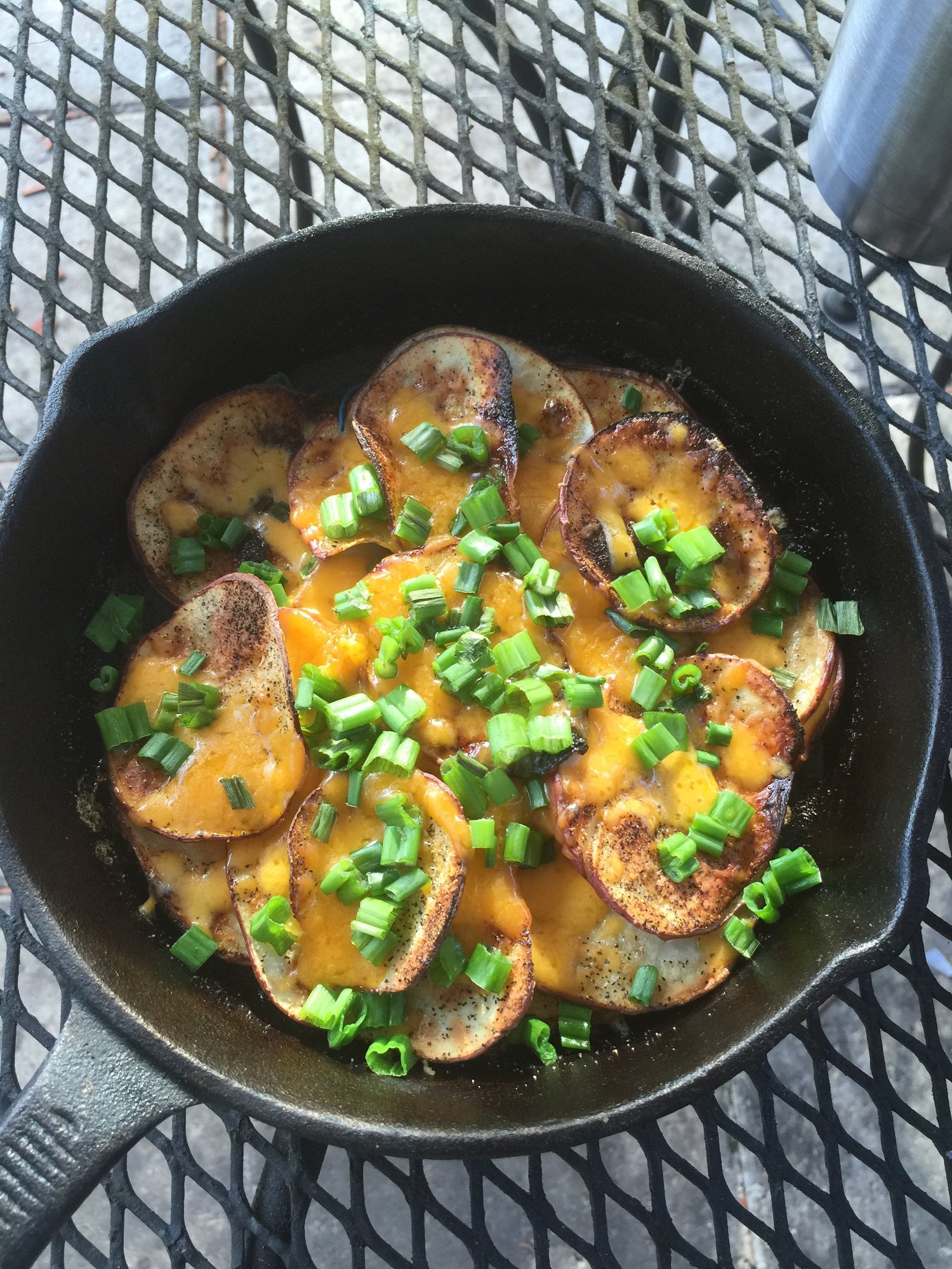 @blasting no but it was super simple. I sliced a red potatoe as thin as I could. Put a litte butter on each slice, sprinkle with garlic powder, salt and pepper. And I actually put them in the oven at 400 so that I could switch back and forth to the broil function to crisp the tops. Then just added some smoked cheddar I made and scallionsblasting said: