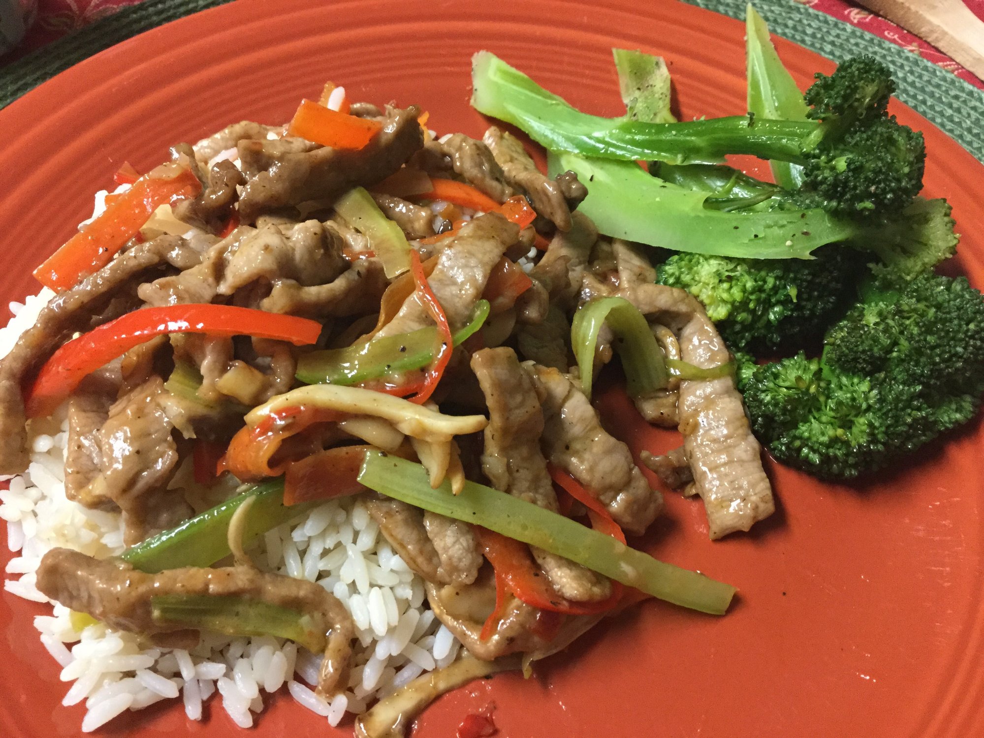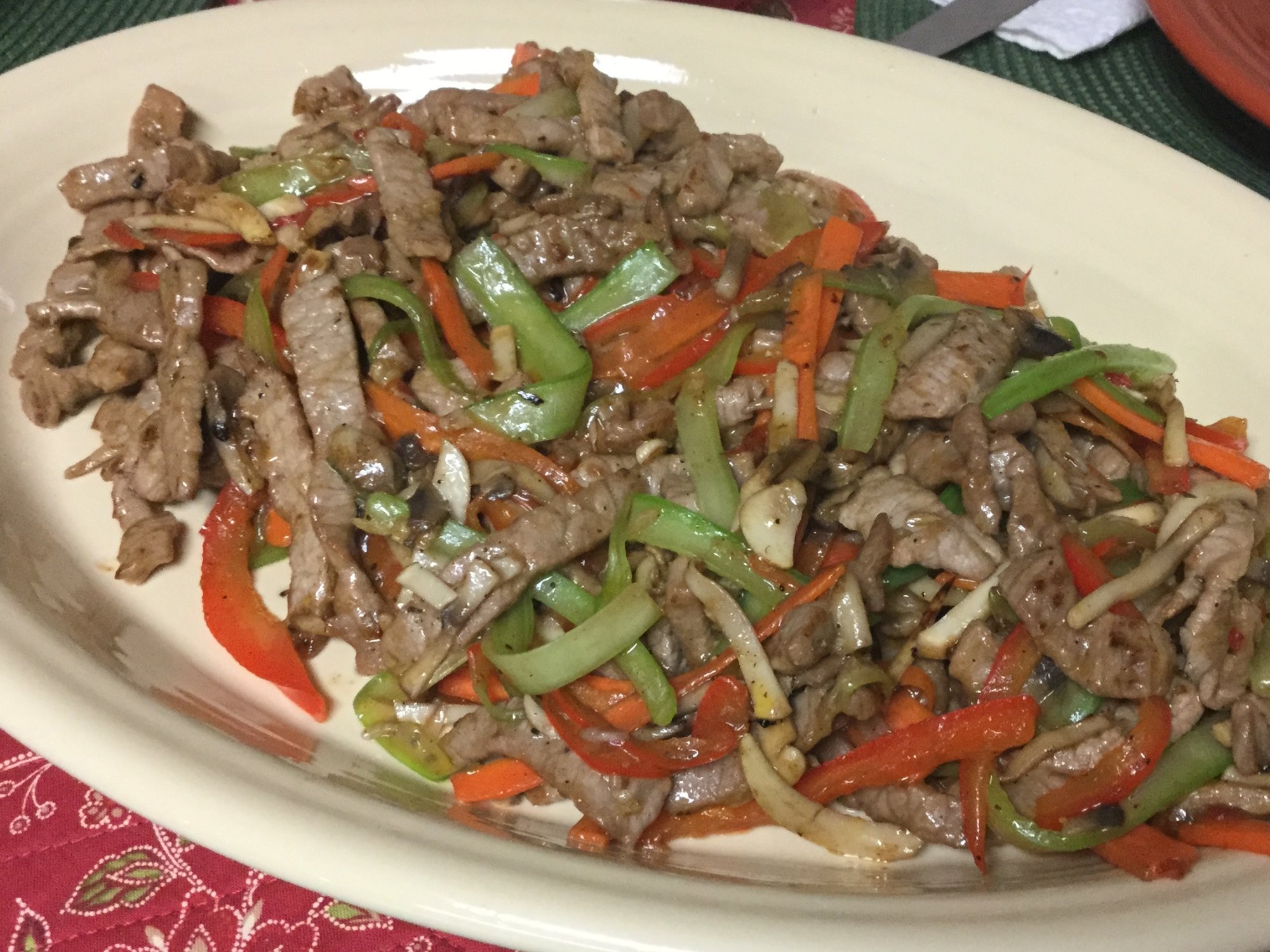In a wok I cooked shredded mushrooms, celery, red bell pepper, and carrots over very high heat (seasoned w/garlic & ginger). Once the veggies are done, the beef is added back to mix and come back up to temp.
