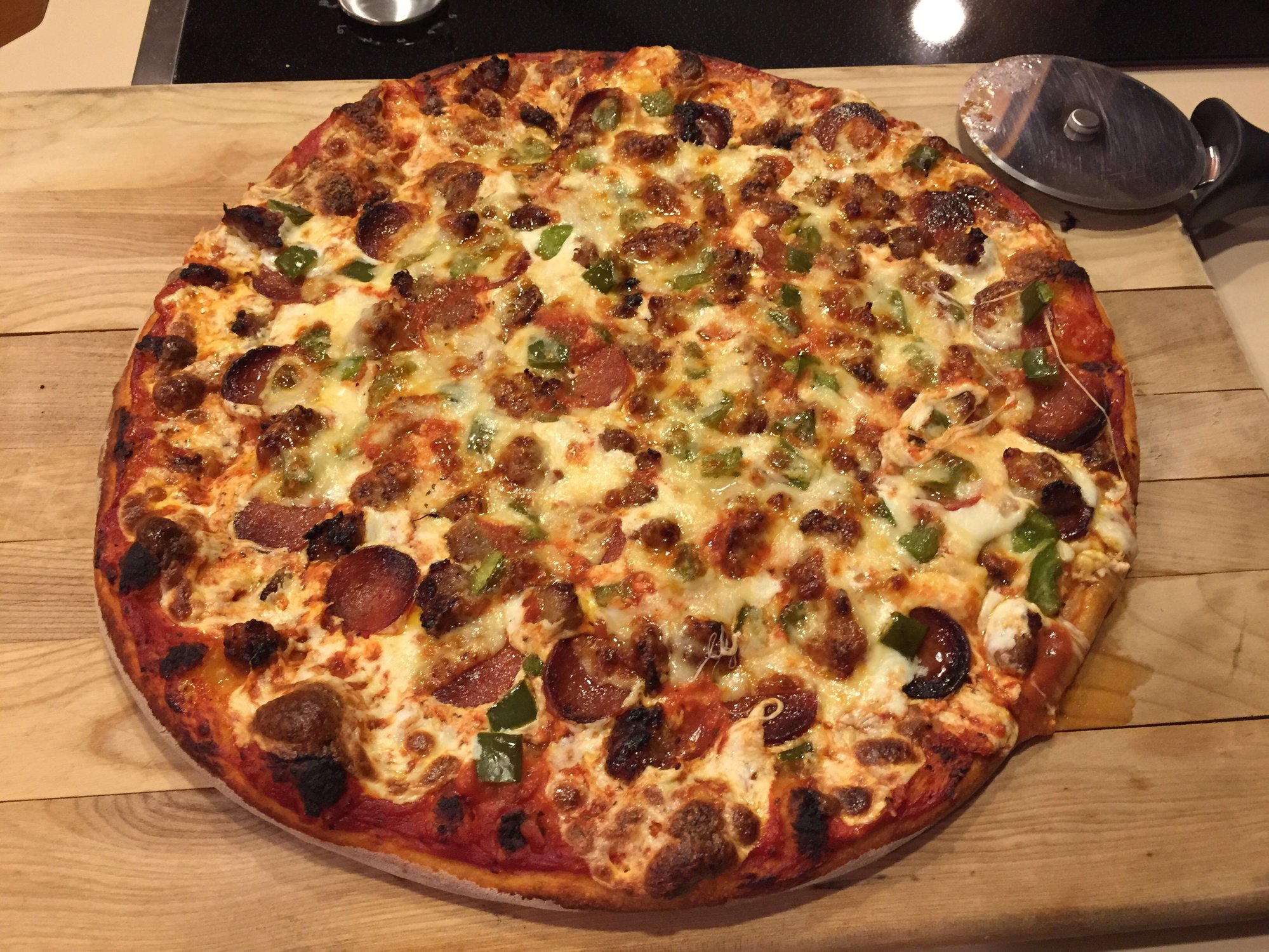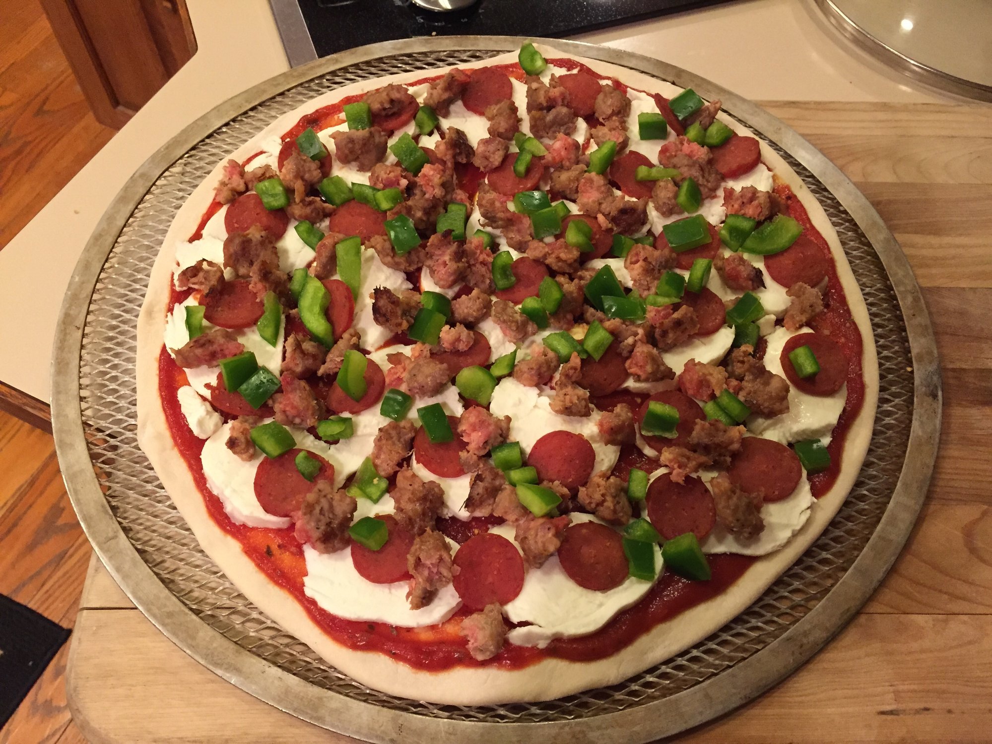Pepperoni, sausage and green pepper cooked at 450 in my oven as it was pouring here in Michigan, looks good but it's way better on the EGG