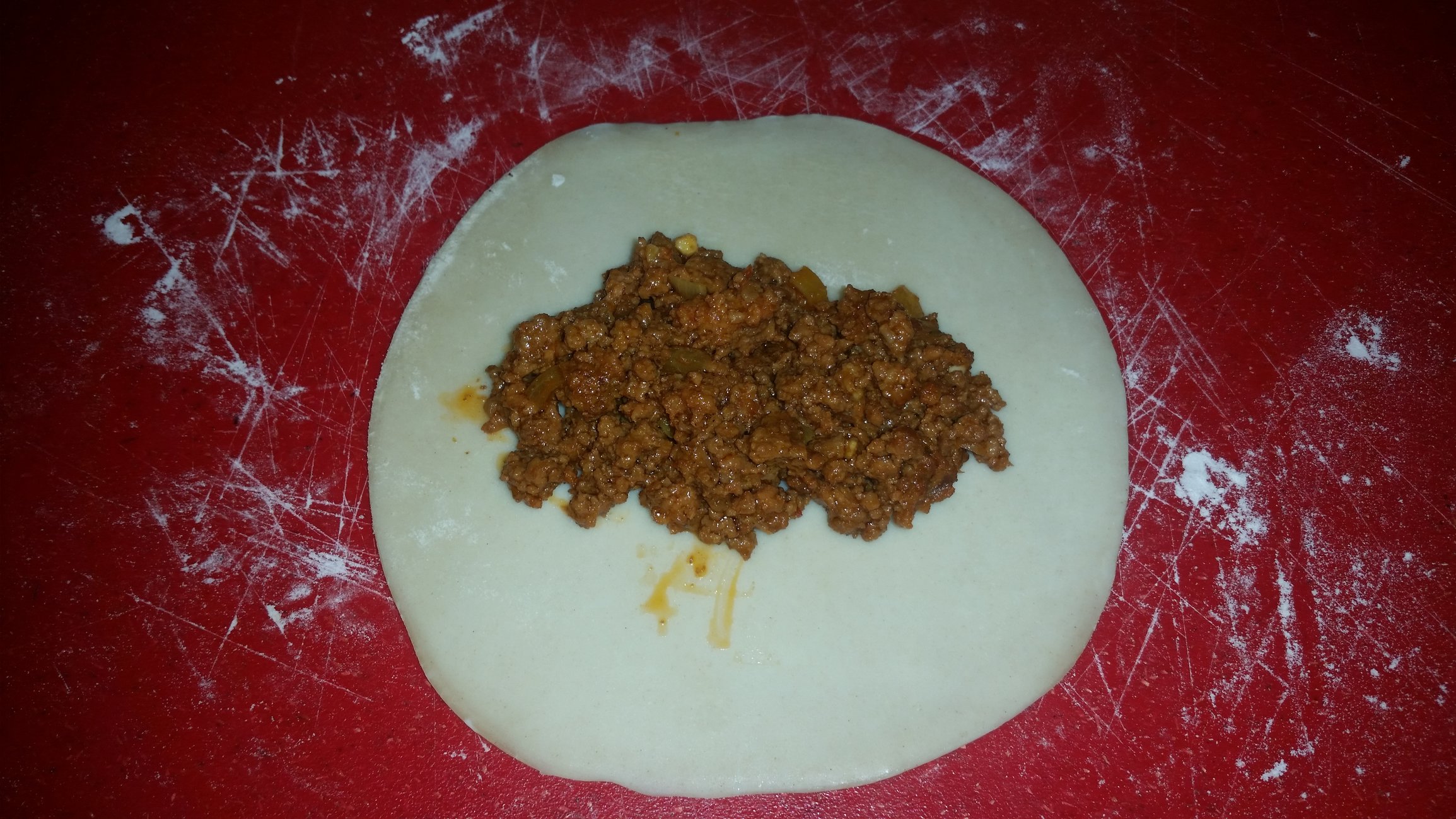 First you fill the middle portion of the disc with a good tablespoon full of the cooked meat: