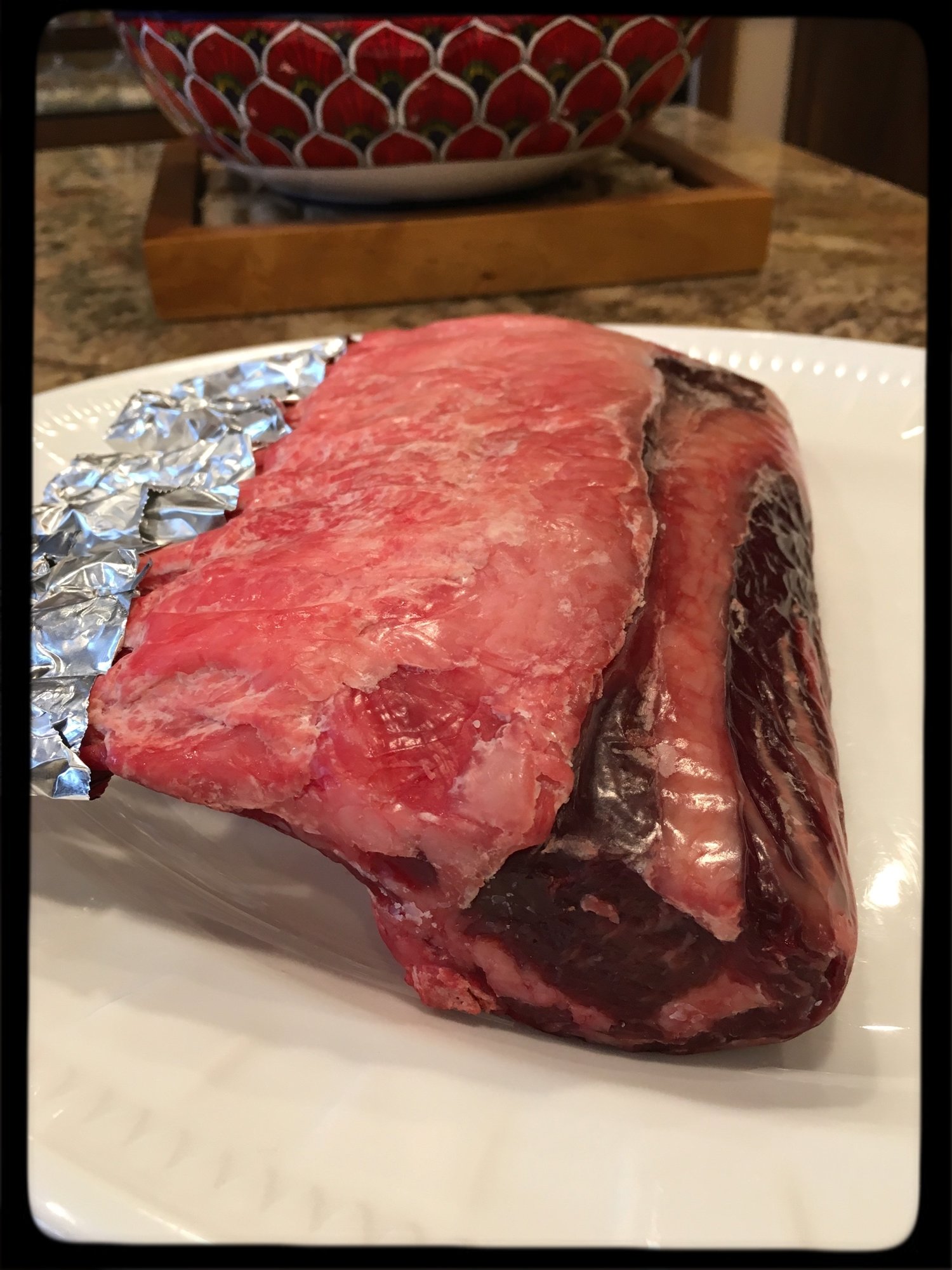 Put it on the egg at 225F and cooked it to 128. Done. I did a mini reverse sear, but the fat started to really burn so I pulled it off the egg. Served over a bit of polenta which had some shiitake mushrooms in it. It was crazy tender. No knife needed at all. The taste was very strong, not too strong, but I think I need to cook the other rack this weekend before it is too strong. Is it a do over? Not sure if it is worth it. For something different, yes, but not dying to do it again.