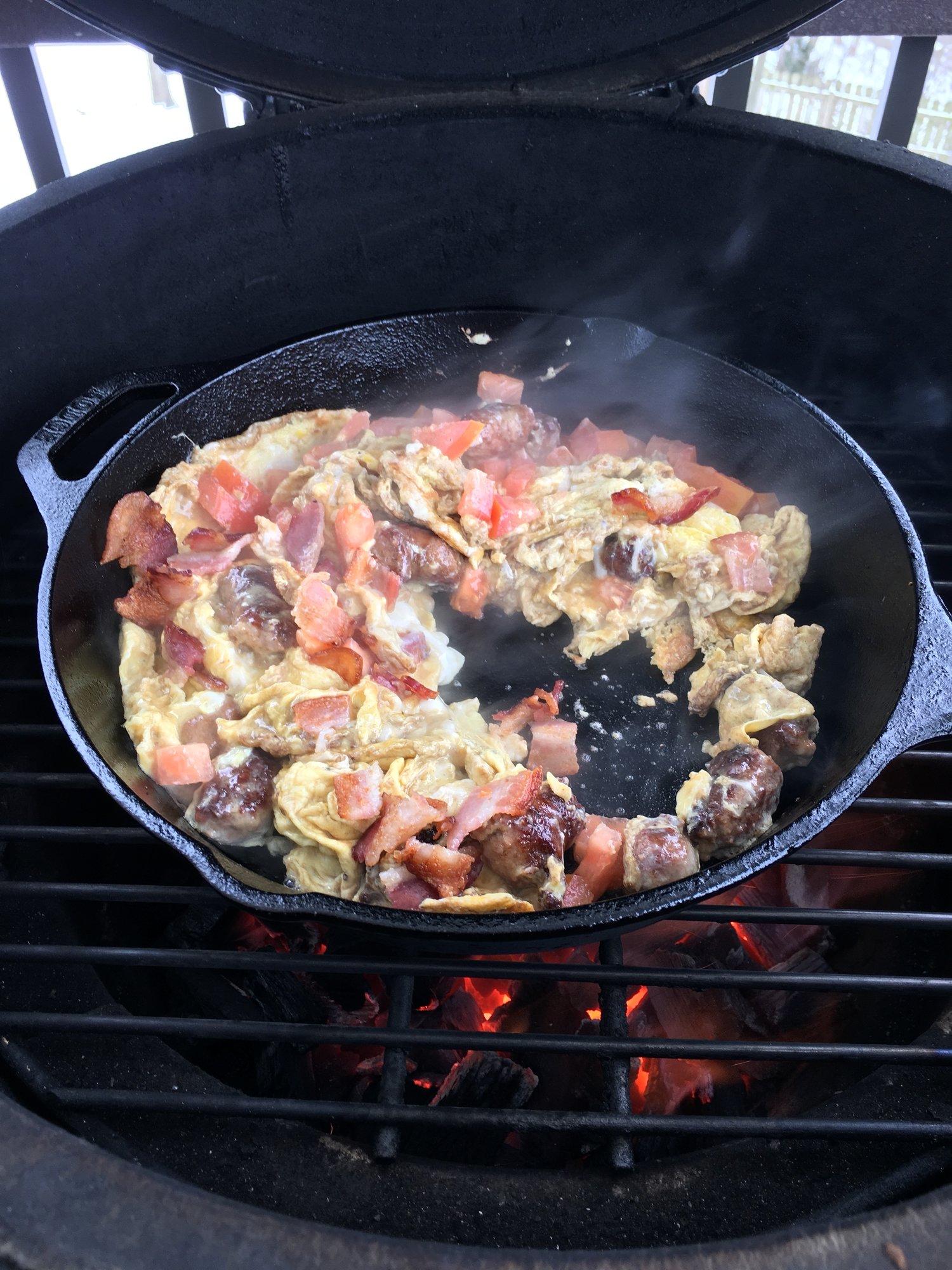 so decided to do some breakfast today. Got 6 eggs, bacon, tomatoes, cheese and some fresh breakfast sausage from a local sausage shop. Got the egg going while the deer watch me ( see pic). Put the cast iron in and about 4 tbs of butter. I'm on the keto diet so I went heavy cream and all the fat I can get! It turned out a lot better than my crap eye of round roast I made last night. Though the pictures don't look great! Thanks for lookin