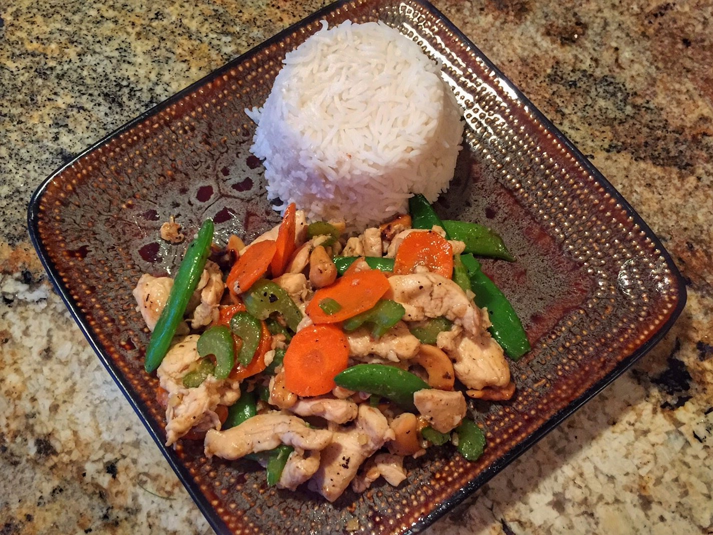 Chicken breast slice thin marinated in soy,rice wine,garlic & cornstarch. Veggies were thin sliced carrots,celery, cashews and sugar snap peas. Sauce was chicken stock,rice wine.soy and cornstarch.