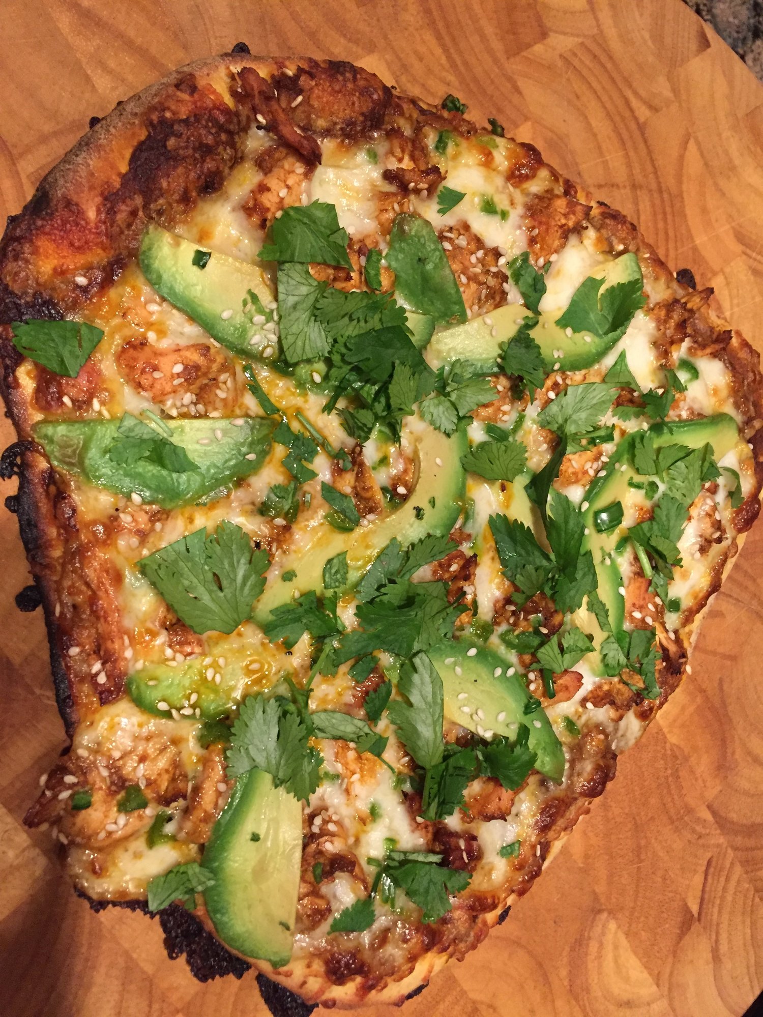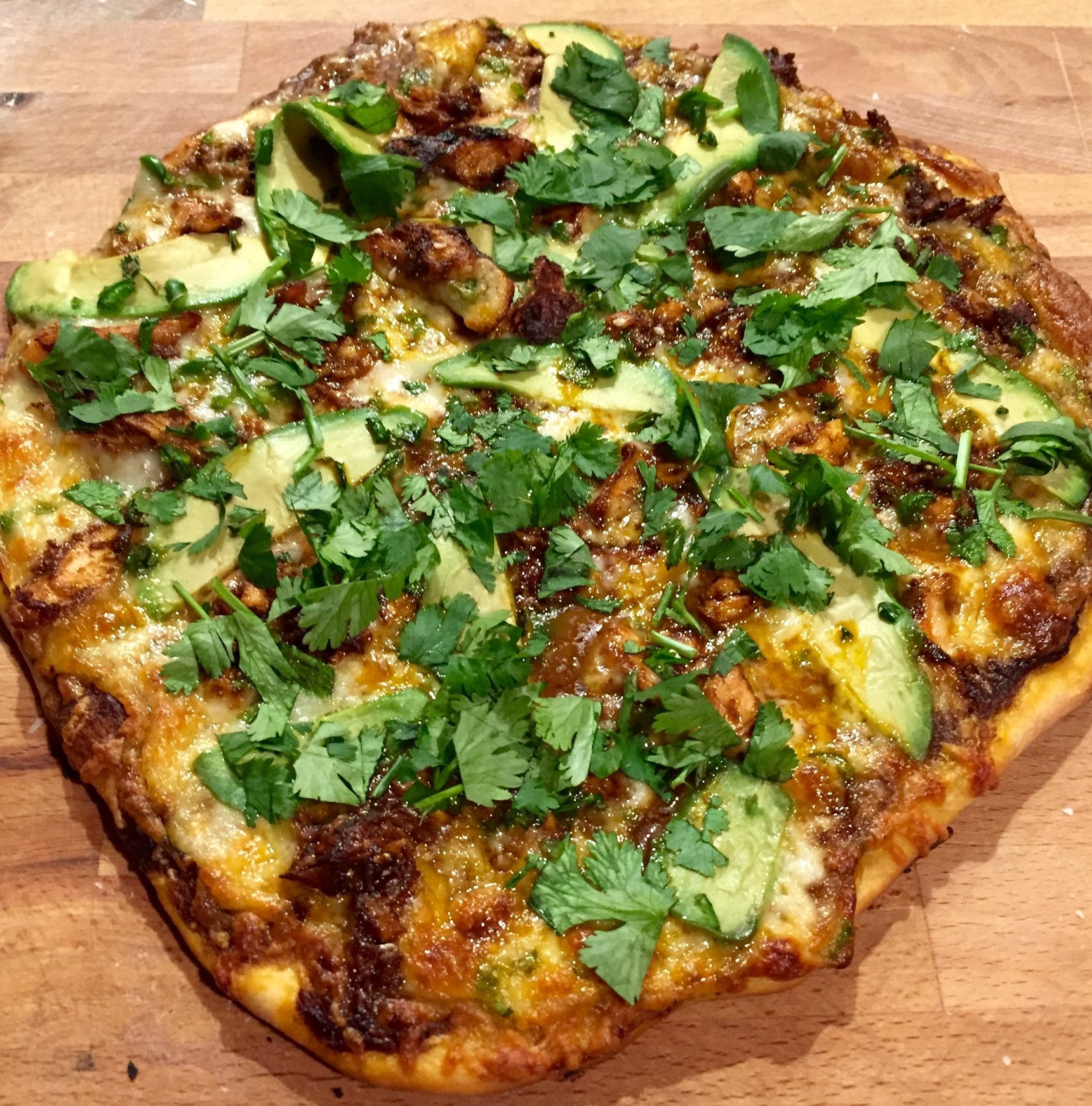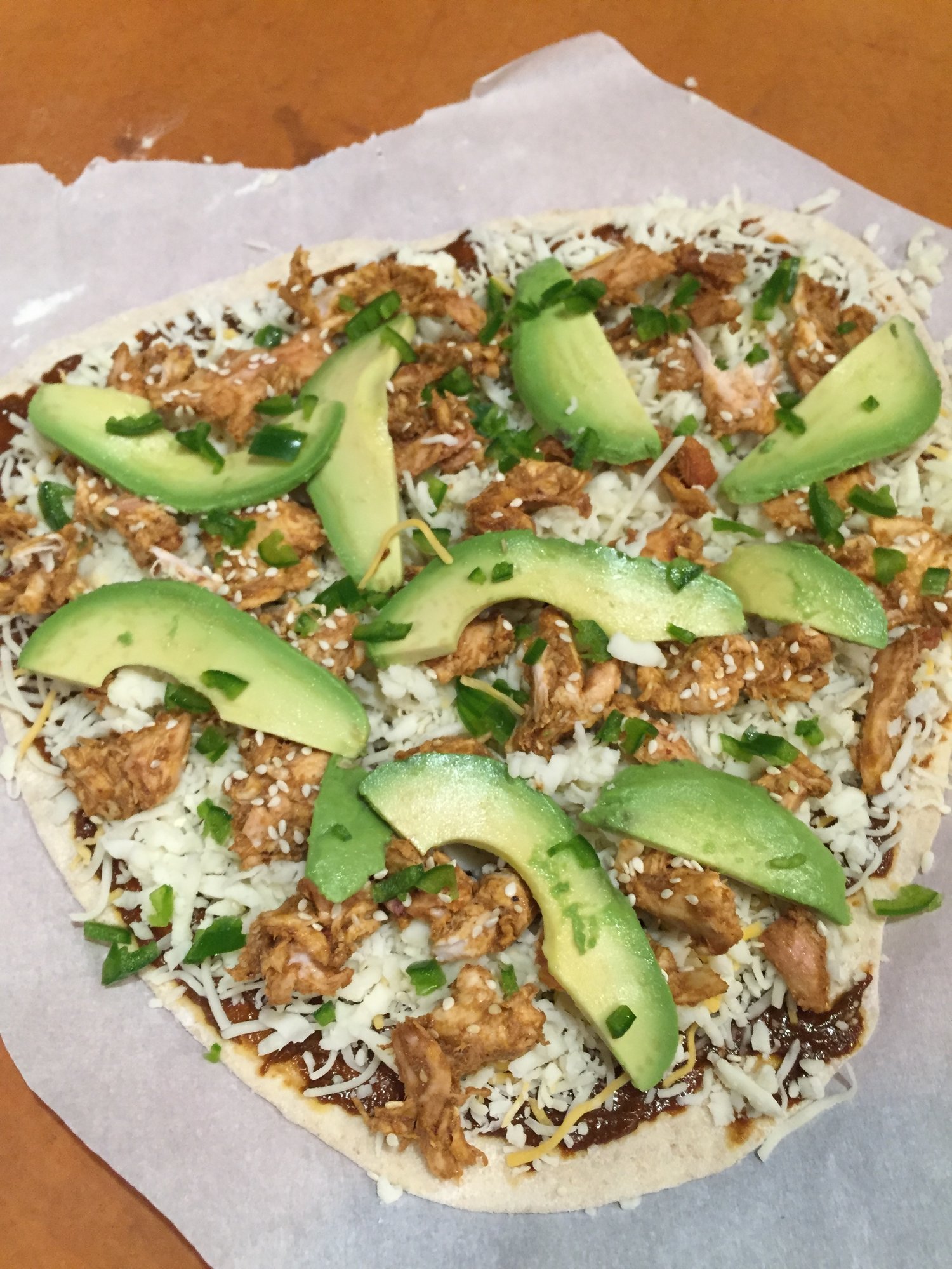 sauced crust with mole sauce, layered with cheese, chicken, avocado slices, diced jalapeño, sesame seeds