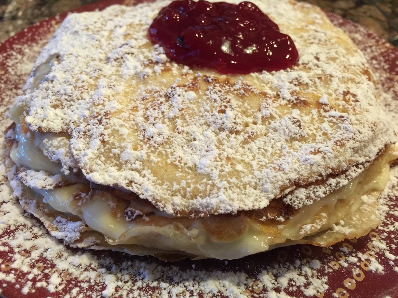 Vanilla Mille Crepe Cake with Powdered Sugar and Ligonberry topping