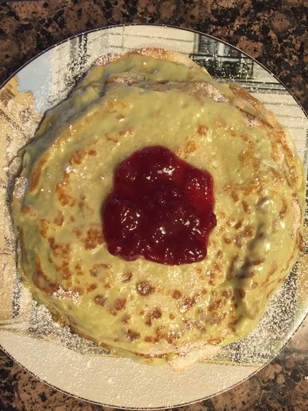 I became carried away with the assembly and forgot to leave the top crepe "blank" on the Pistachio cream mille crepe cake. My intention was to sugar-singe (like creme brulee) the top of that one.