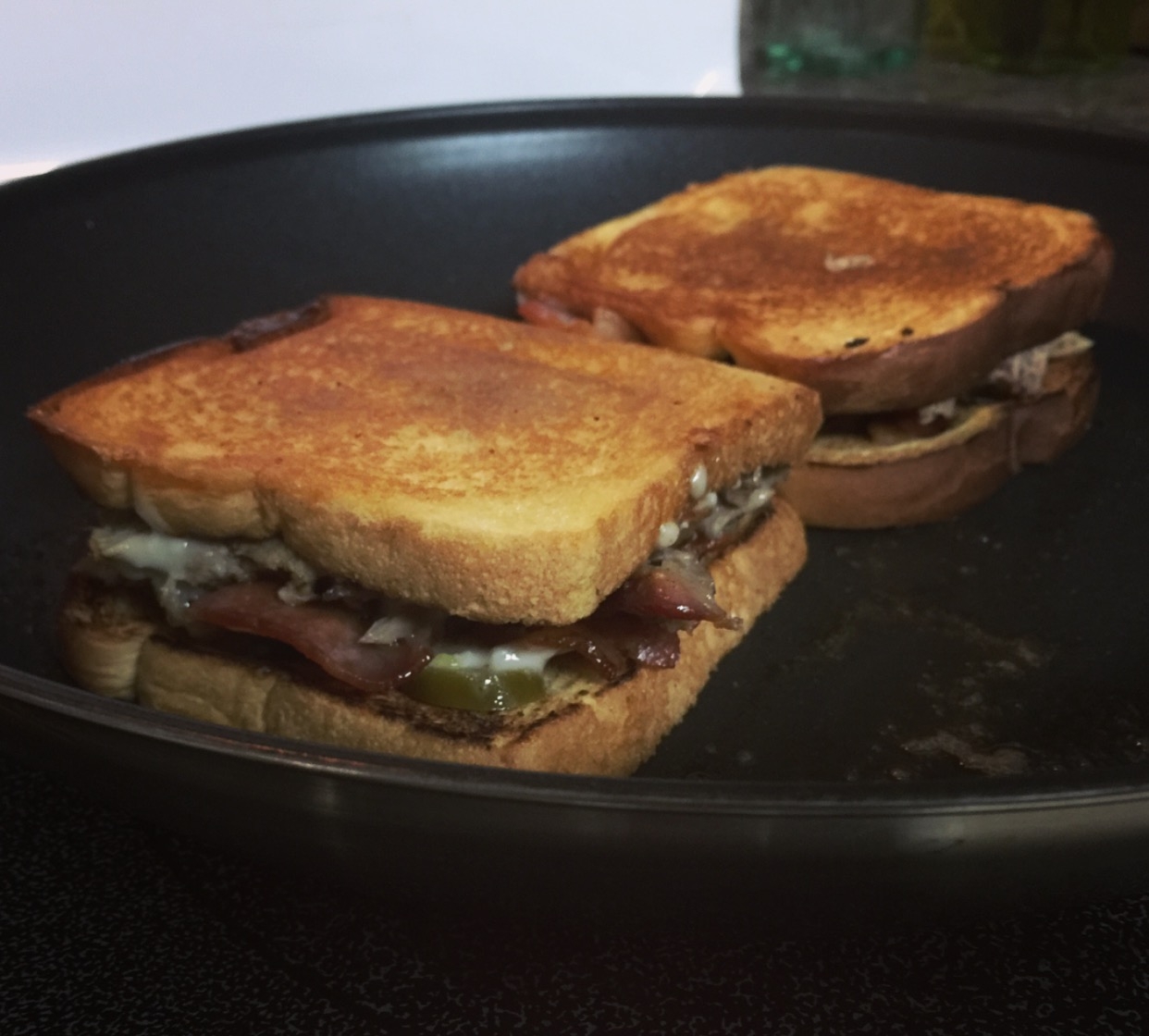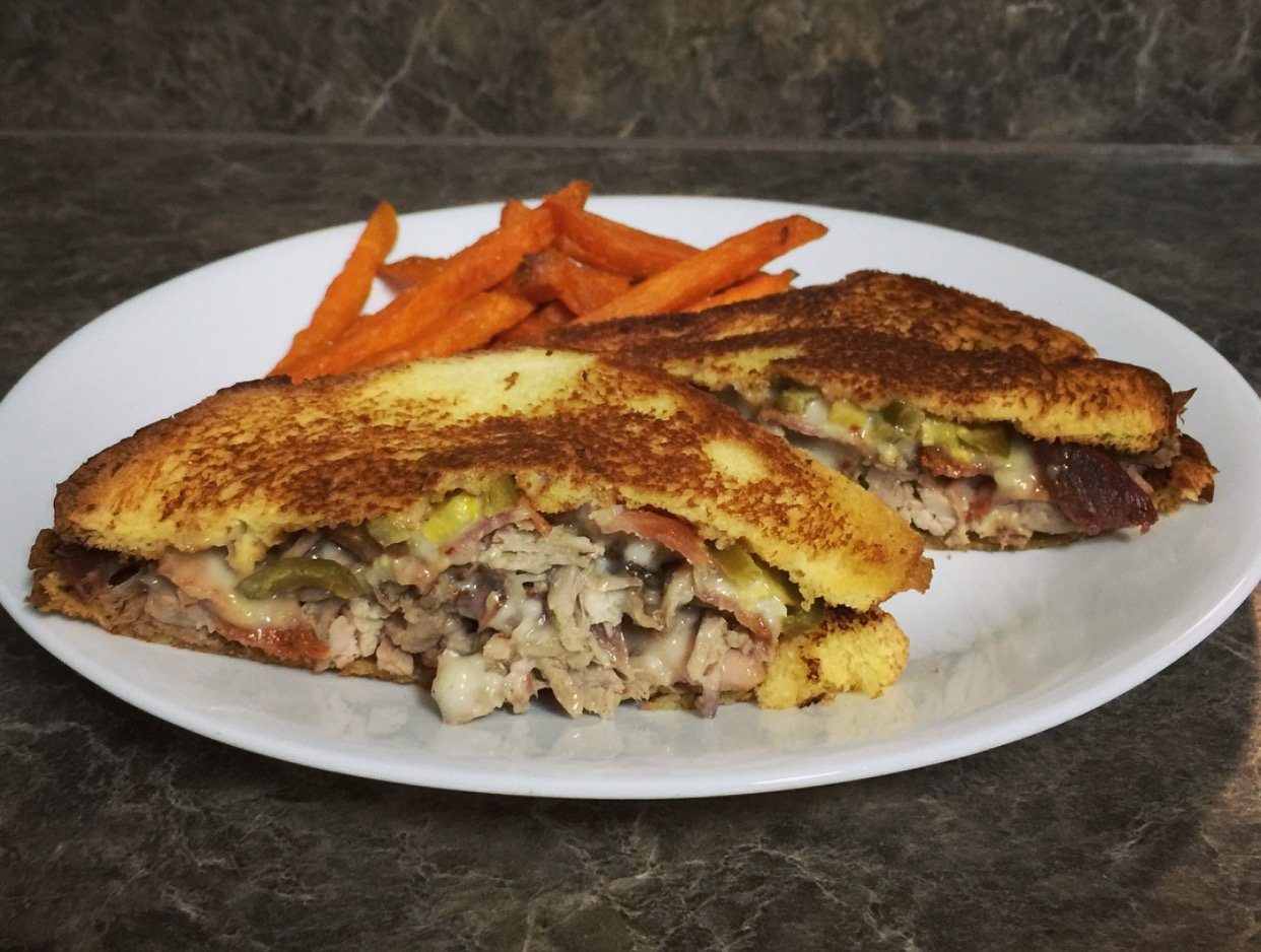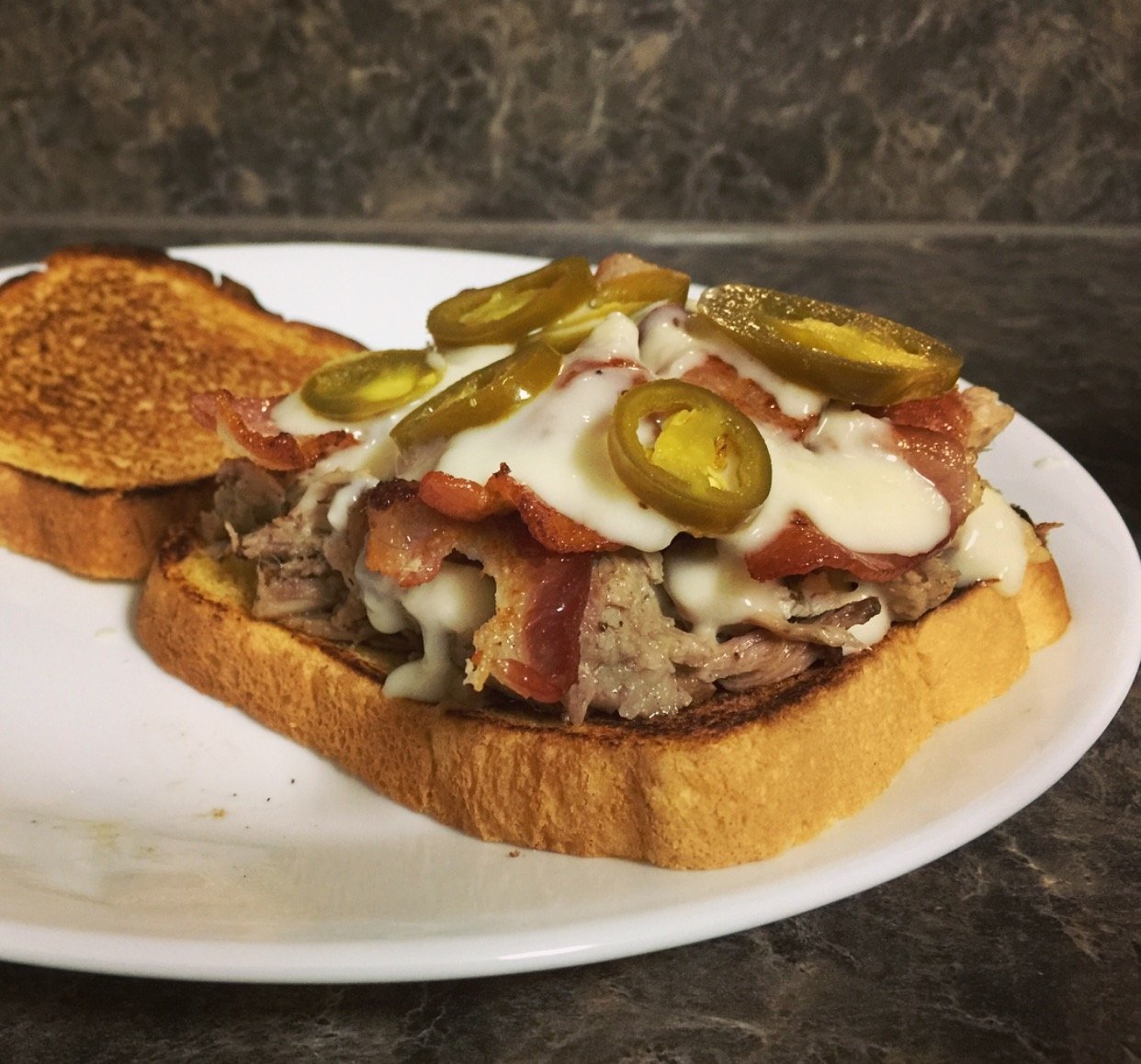 Tonight's Grilled Pulled Pork Sammich with Beer Cheese, Bacon and Jalapeños. I love pulled pork leftovers. This will be repeated.