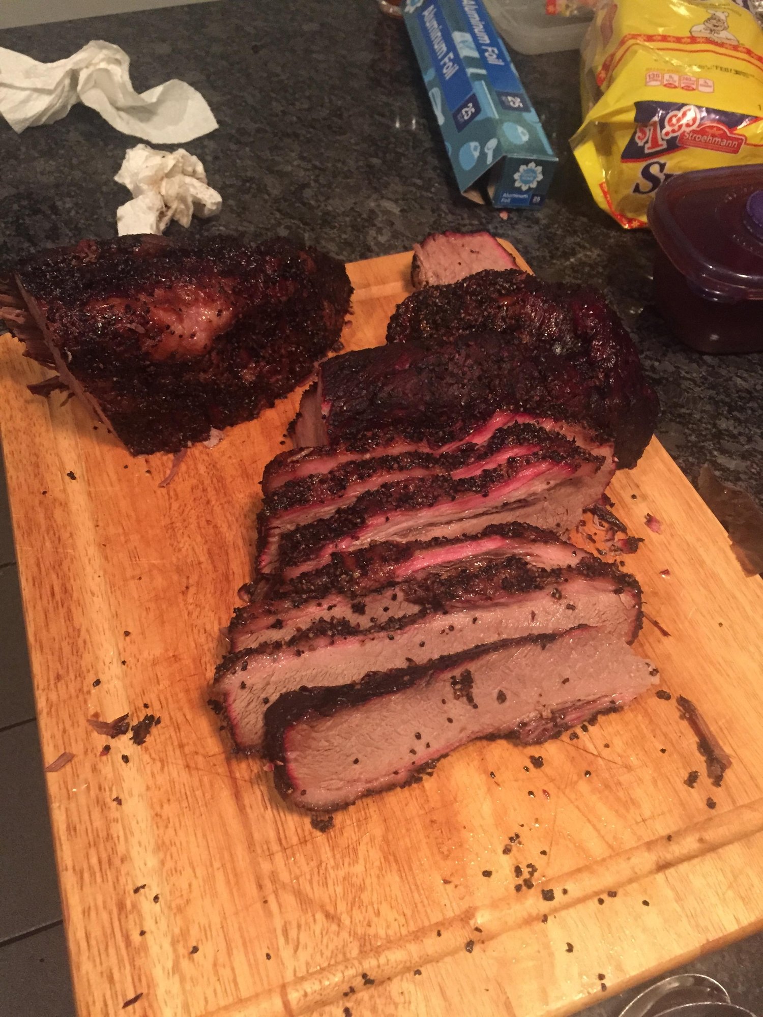 Got a good setup with the pizza stone, totally forgot to wrap it in foil so thats going to be a pain to clean.  Cooked it at between 250-275. This was about 3 hours in wasn't really getting enough smoke so I added some more hickory chunks and got a good color.I opened it and sprayed down any parts that were starting to crust with water and beer.  Wrapped after it got through the stall at 180, didn't hit the second stall like the first time and it just trucked right up to about 200 in a few parts of the flat.  Total cook time was about 9 hours and then I rested it for about 3.5 hours in a towel and cooler until it was ready to serve.  Overall the point was a little behind the flat temp wise, I think the deepest part was about 185 when I pulled it but I think it did some crossover cooking while it rested because it came out just about perfect, probably could have cooked an extra 5 degrees to really melt in your mouth but it was still awesome.