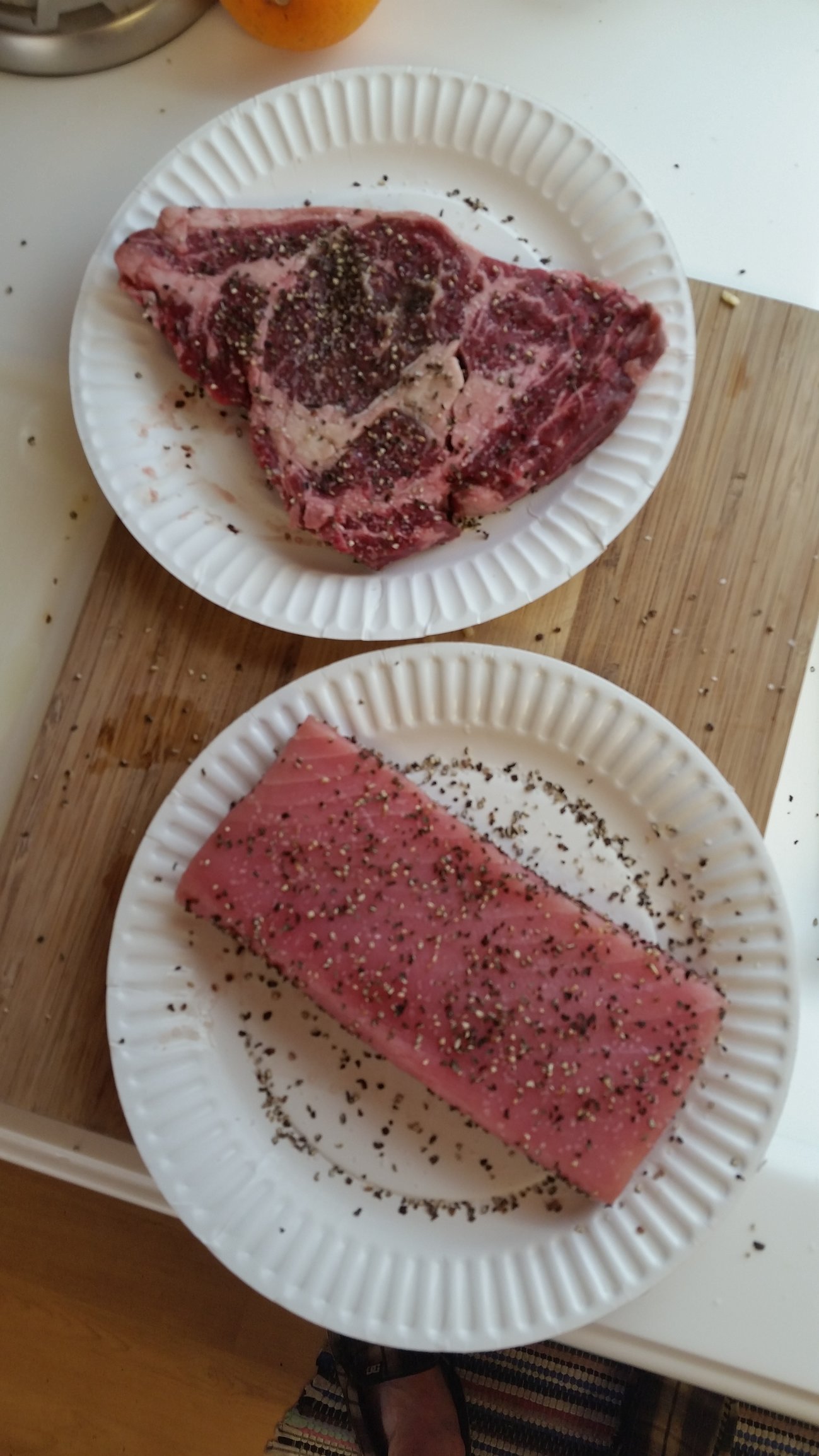 Today was a nice lazy cooking day, gf is here, and egg burning all day.Started with crab&cream cheese stuffed jalapeños. Then seared Ahi tuna, and a ribeye, with mini colored potatoes.
