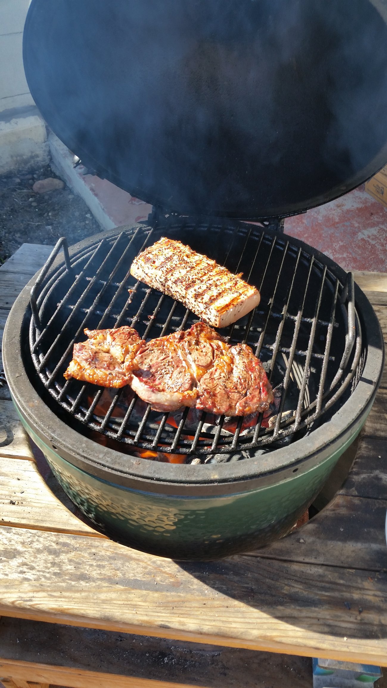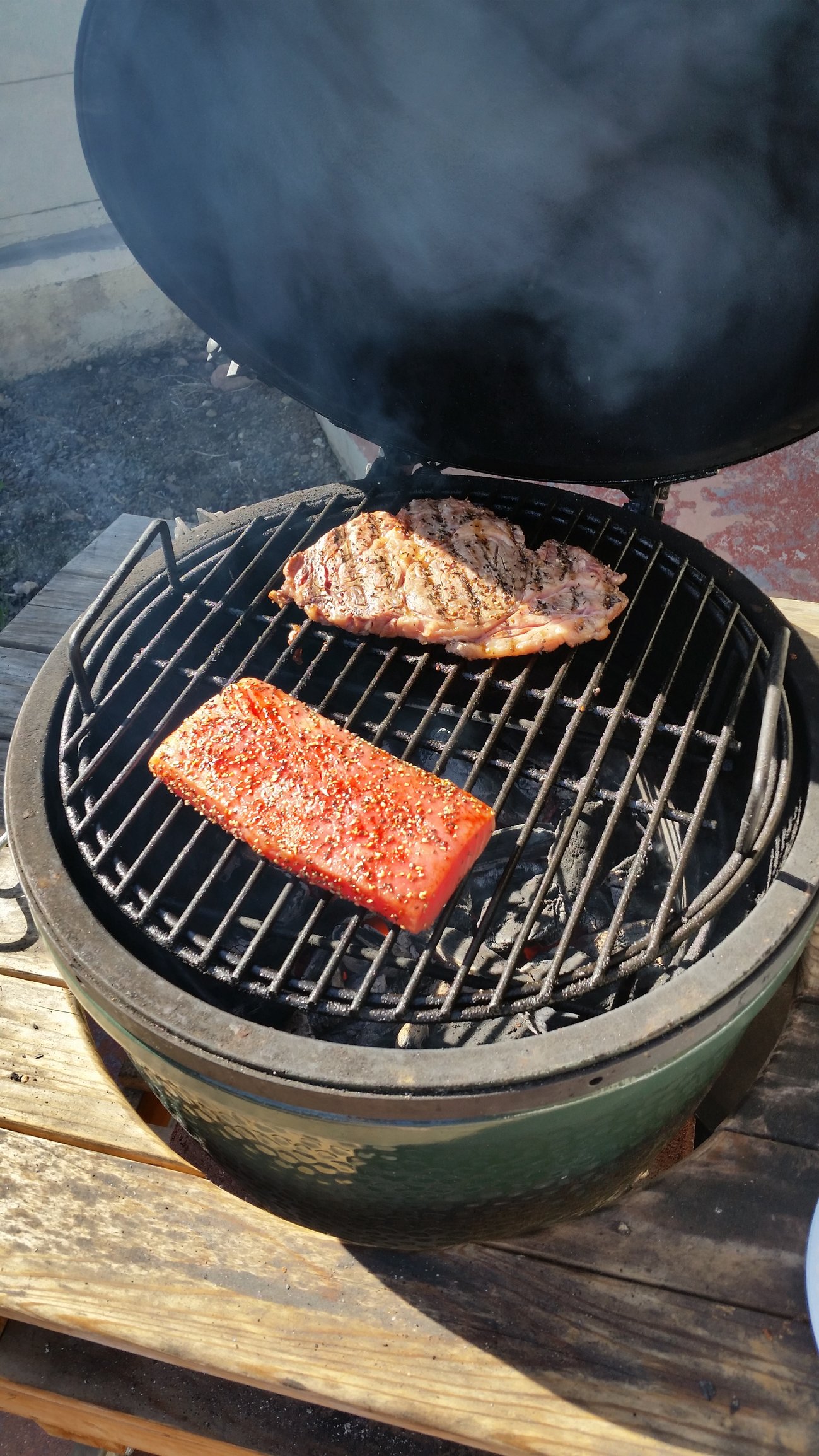 Ribeye, and Ahi were flip seared with egg open, over high flames with a few minutes of closed dome cook time at 400°ish. Took off med rare, was fantastic, happy VD.