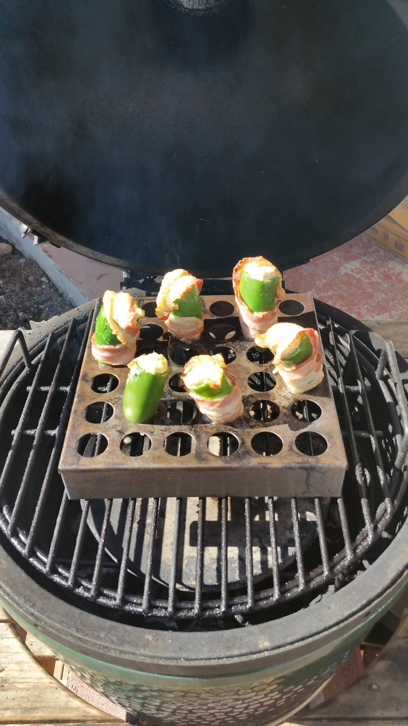 Jalapeños go on 350°raised direct for approx 45mins, to an hour.